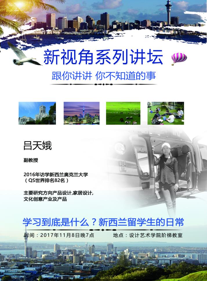 吕天峨教授介绍了她的学业以及自己的成就,工作履历,和新西兰的地形地貌和生活环境。主要介绍了奥克兰公司的教学布局和学习环境,学习氛围,并展示了公司的建筑和美丽风景。