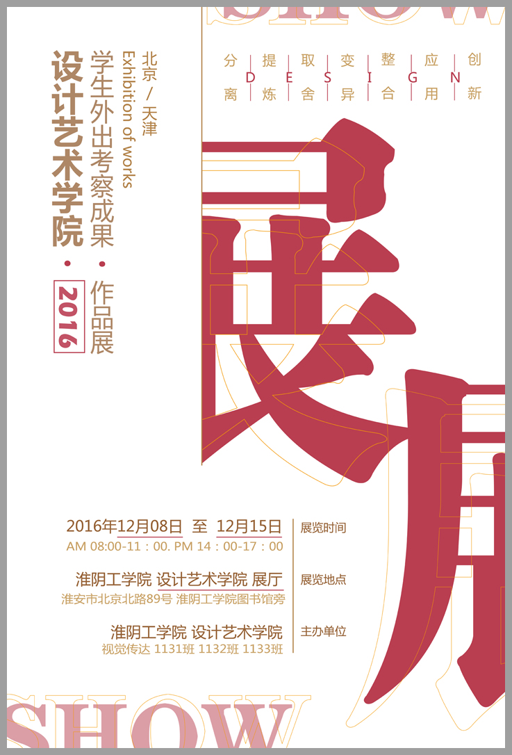 2016年10月,由吕艳、关荣、尹国军三位老师带队,视觉传达设计1131、1132、1133三个班级共计75位同学对北京和天津进行了为期七天的专业考察,主题为“从传统文化到现代设计”,员工以独特的视角重新审视了中国传统文化和现代设计,并收集整理了大量的资料和素材。回校后进行了深入的梳理、整合与创新设计,形成了一系列形式丰富,内涵深刻,具有创新意识或实用功能的设计成果。