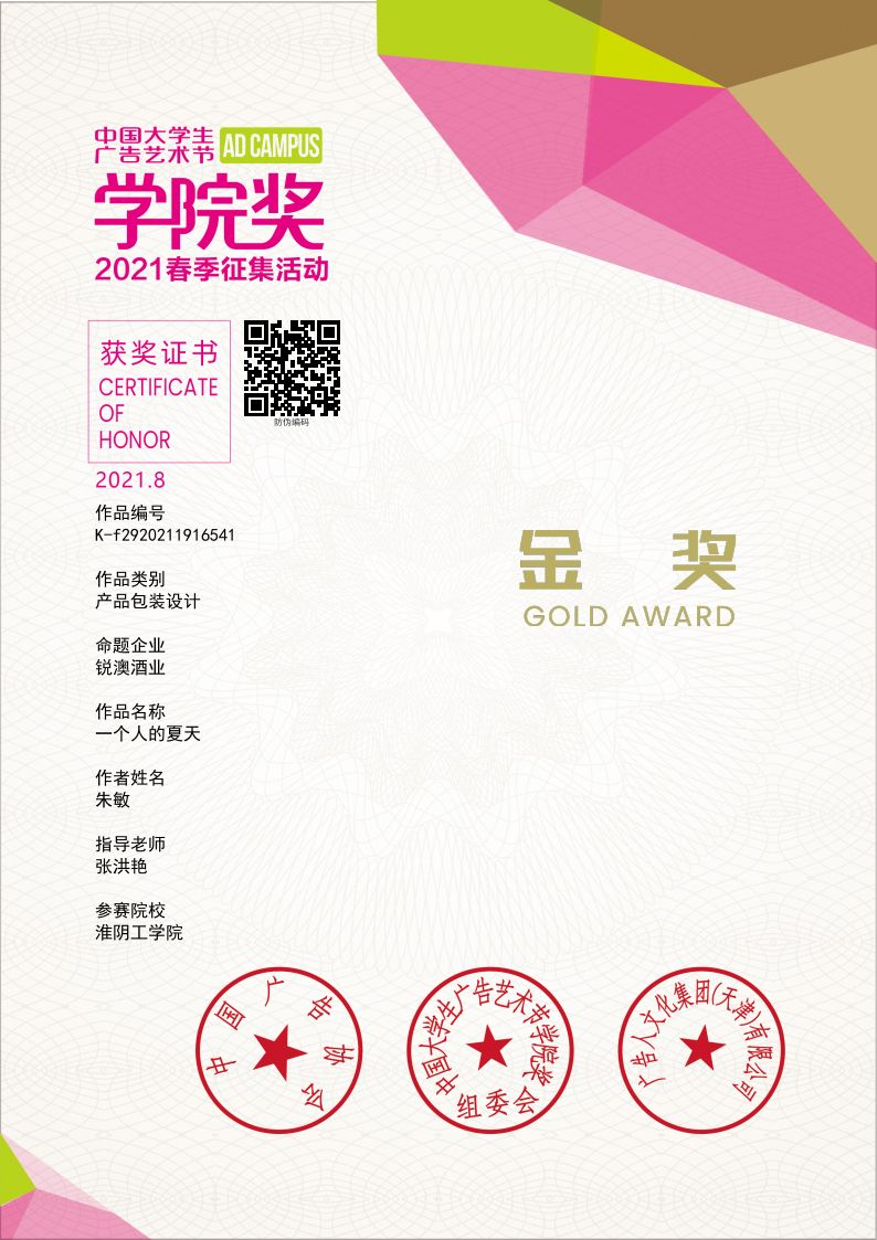 近日,“中国老员工广告艺术节公司奖2021春季创意盛典”线上颁奖大会揭晓公司奖2021春季征集活动评比结果,EVO真人视讯视传1181班朱敏同学创作作品《一个人的夏天》RIO微醺包装设计荣获产品包装设计类金奖,指导教师张洪艳被组委会授予“金奖指导教师”称号。视传1181班赖佳慧、袁天祥、林靖杰等同学荣获优秀奖多项。