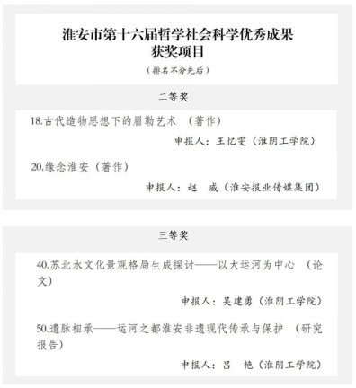 近日,淮安市第十六届哲学社会科学优秀成果奖公示结束,经市社科成果奖评审专家委员会审定,公司获二等奖2项,三等奖2项。分别为:王忆雯教授著作《古代造物思想下的眉勒艺术》,尹国军副教授著作《缘念淮安》(淮安报业传媒集团合作),吴建勇教授论文《苏北水文化景观生成格局探讨——以大运河为中心》,吕艳副教授研究报告《遗脉相承——运河之都淮安非遗现代传承与保护》。