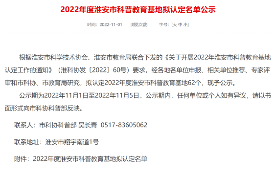 近期,淮安市科学技术协会公布“2022年度淮安市科普教育基地拟认定名单”,EVO真人视讯“江淮水文化遗产数字化保护利用”入选。