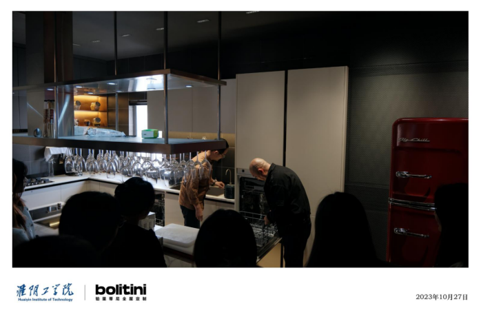 铂里蒂尼公司总设计师李林向同学一一介绍全屋定制设计的流行趋势、材料。厨房中橱柜结构创新与布局。