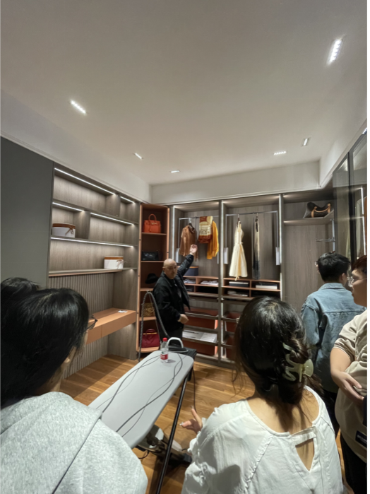 同学们在衣帽样板间了解衣柜设计中的人体工程学知识、流行的结构构件及造价。