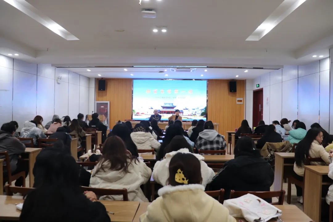 傅振举教授从古城淮安的历史溯源、文化价值内涵、淮安区经济社会发展概况等方面展开。他从淮安的建城史讲起,向同学们介绍了古城淮安区悠久的历史和辉煌的文化与风景名胜。淮安坐落于江淮平原,水域众多,自然风光迷人。同学们在傅振举教授朴实生动、旁征博引、充满感情的描述下,充分感受到了淮安的独特韵味。傅振举着重从“伟人故里、运河之都、美食之都、文化名城”等四个方面介绍了淮安的文化价值和内涵。淮安是一代伟人周恩来总理的家乡,是周总理生活了十二年的故乡。淮安区境内分布着周恩来纪念馆、周恩来故居、漕运博物馆、淮安府署等多处国宝级文物单位,寄语青年学子们要珍惜在周总理家乡学习、生活的难得机遇,刻苦学习,立志成为国家栋梁之才。淮安因运河而生,博大精深、源远流长的运河文化,孕育了淮安运河之都的人文底色,也塑造了淮安深厚的漕运文化。淮安同时是淮扬菜的发源地之一,是世界第九座、中国第五座世界“美食之都”。傅振举还向大家展示了淮安古城的历史建筑、传统工艺、民俗习惯等方面的特点,让同学们对淮安历史文化有了更全面的认识。他通过讲解淮安的传统戏曲、民间艺术等元素,向同学们展示了淮安文化的独特魅力。淮安历史名人荟萃,四大名著,有三部都和淮安有深厚渊源,淮安是名副其实的幸福之城、宜居之城。