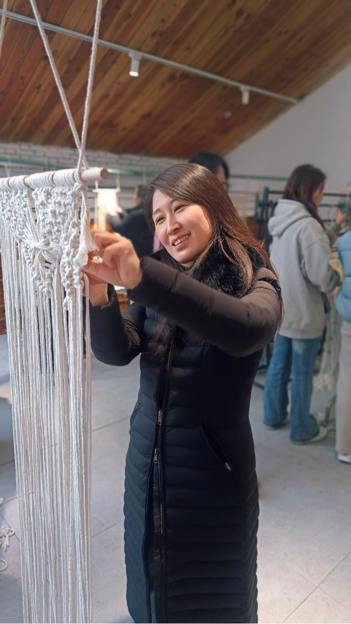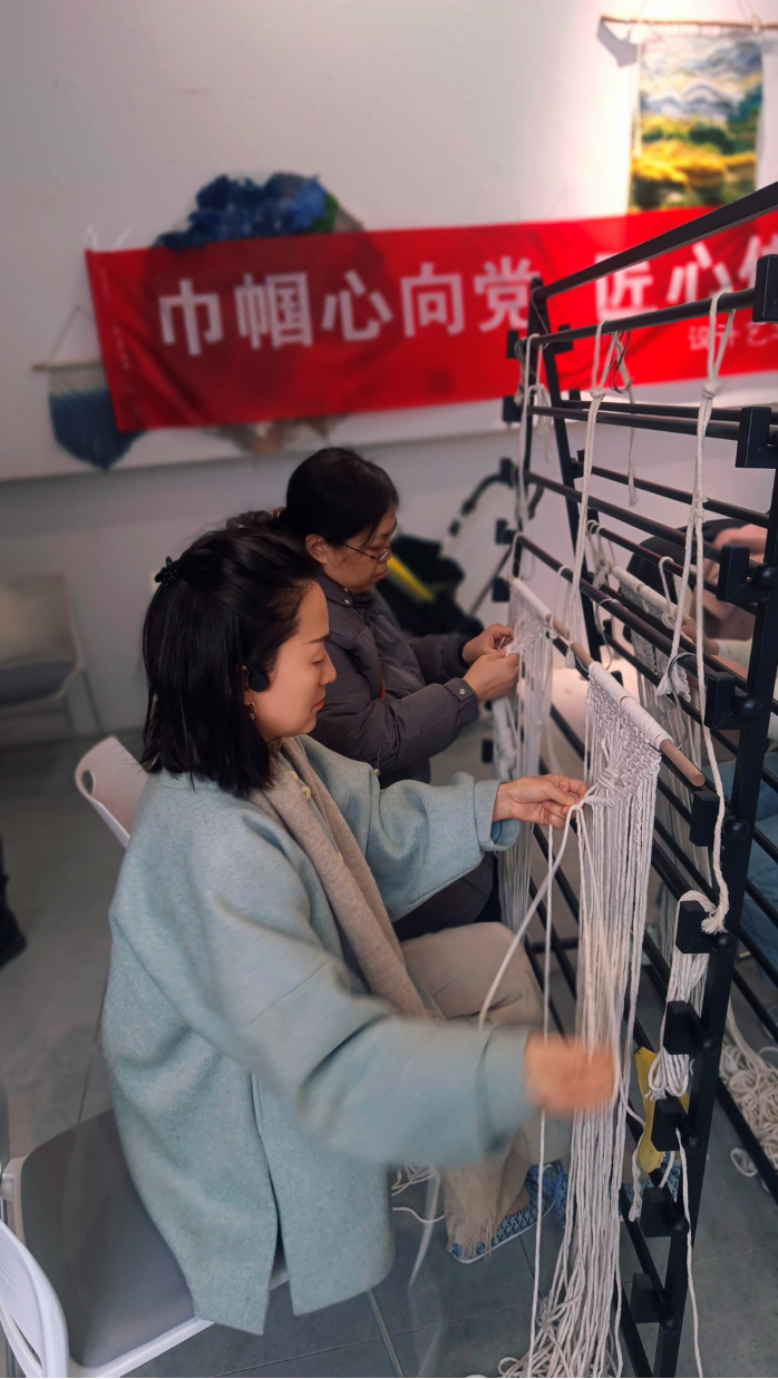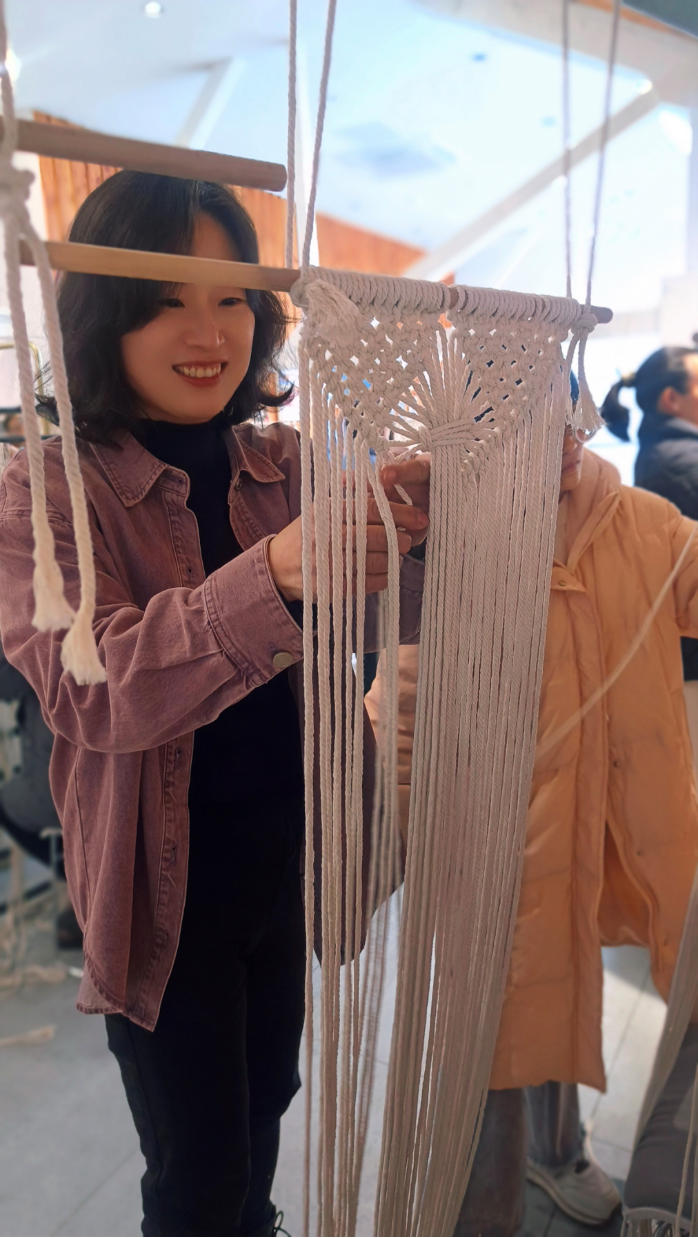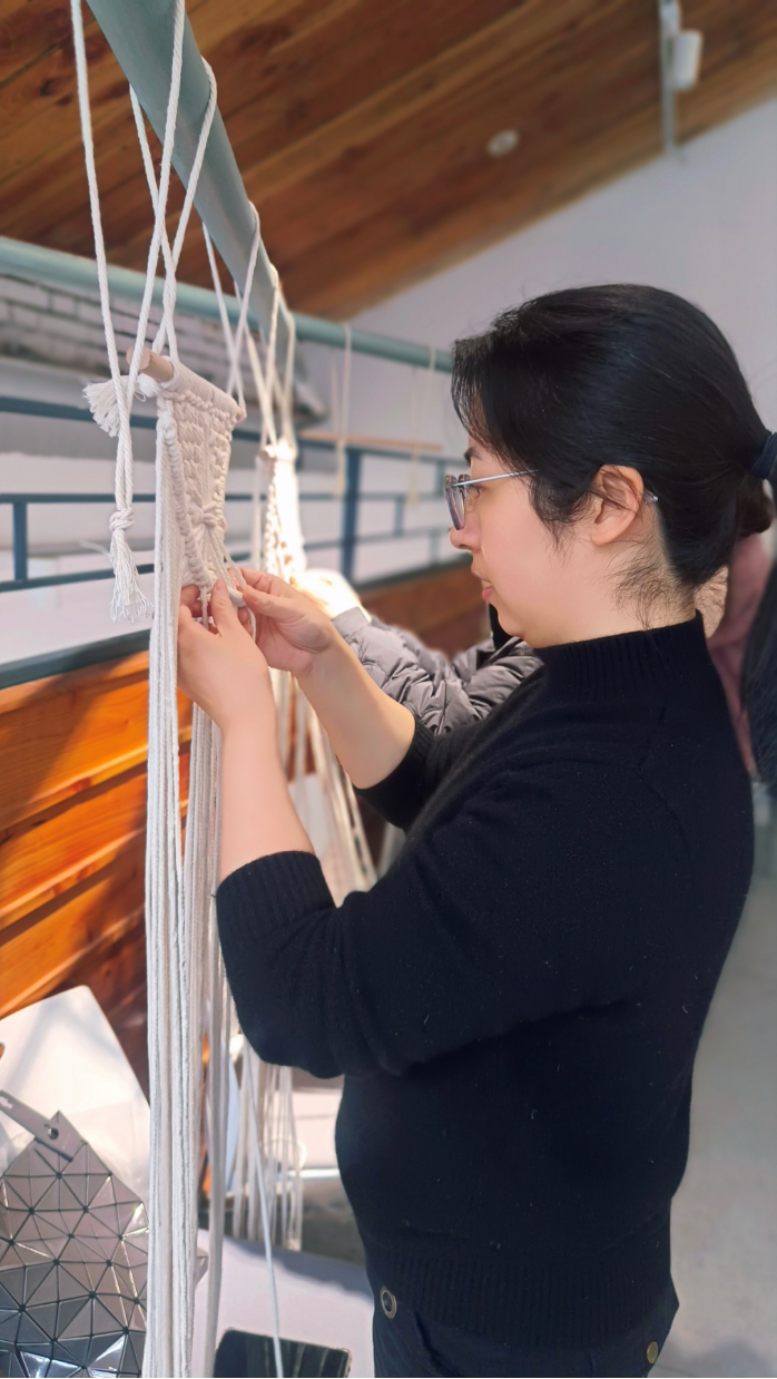 女神们沉浸式体验编织过程,绳结、珠扣、翻转、编织……每一个步骤都精益求精、马虎不得。她们深入感受非遗文化的独特魅力,同时把属于淮工设计人的匠心巧思融入编织挂毯的过程之中。