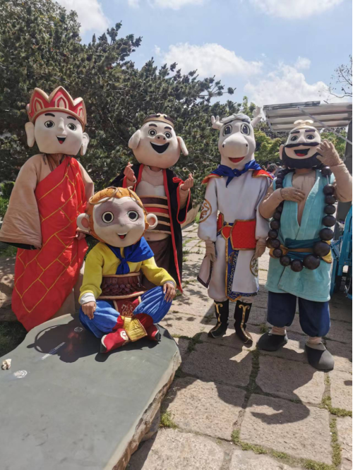 在吴承恩故居,同学们穿上特制玩偶服,化身西游人物,妙趣横生的造型让人忍俊不禁,他们热情地与游客们互动,为来往游客带来欢乐的、沉浸式的旅游体验。