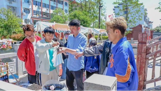 在魁星阁,三十余名同学主办了淮工设计青年文创市集。他们带着自己的文创产品、非遗作品、DIY体验项目在市集进行展示和售卖。十余个展位上展示了包括手提袋、毛绒玩具、书签、零钱包、抽纸盒、杯垫、抱枕、丝巾、头饰等多个品类,借鉴了西游、水浒、戏曲、传统纹样、博里农民画、剪纸艺术等多种创作灵感,充分展示了设计学子的精巧构思和创作才华。同时,还带着游客进行漆画扇技艺体验,通过非遗体验项目弘扬中华民族的优秀传统文化,让往来游客感受非遗文化的熏陶,传递非遗文化的核心内涵。