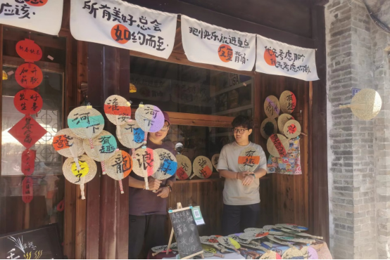 在河下古镇,同学们用淮安地产蒲叶作为编织原料编织的蒲扇为画板,用丙烯给予它鲜艳的色彩,用毛笔写下专属于淮安河下的独特符号,作为承载着古镇文化和老员工创造力的别致礼品进行售卖。他们用作品向游客展示了自己对古镇深厚文化底蕴的独特见解。