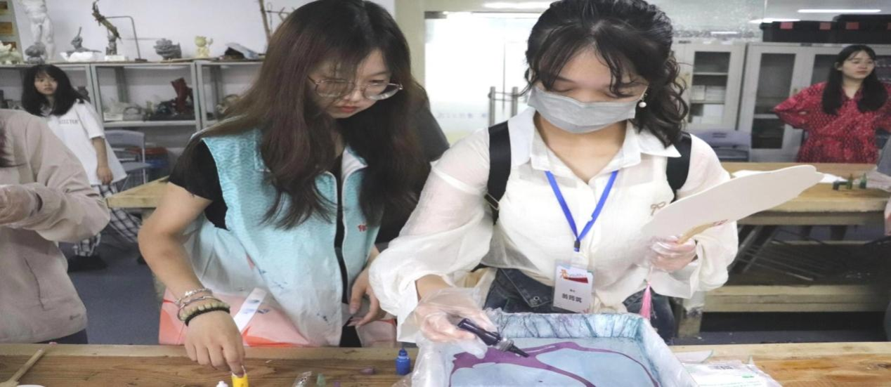 吕艳教授作了大运河与非遗专题讲座,从淮安非遗相关历史传承、价值意义等多方面阐述了中华民族千年流动的文化血脉。研习营学员们参观了毕业设计作品展,作品体现了设计者对中华传统优秀文化的深刻认同,展示了对传统艺术、传统图案及传统文化的理解和传承。随后公司员工为研习营成员讲解了淮安非遗文化,并带领台湾青年老员工体验了漆扇、绒花、博里农民画和剪纸等非遗作品设计与制作,在感悟历史的同时体验非遗文化魅力。