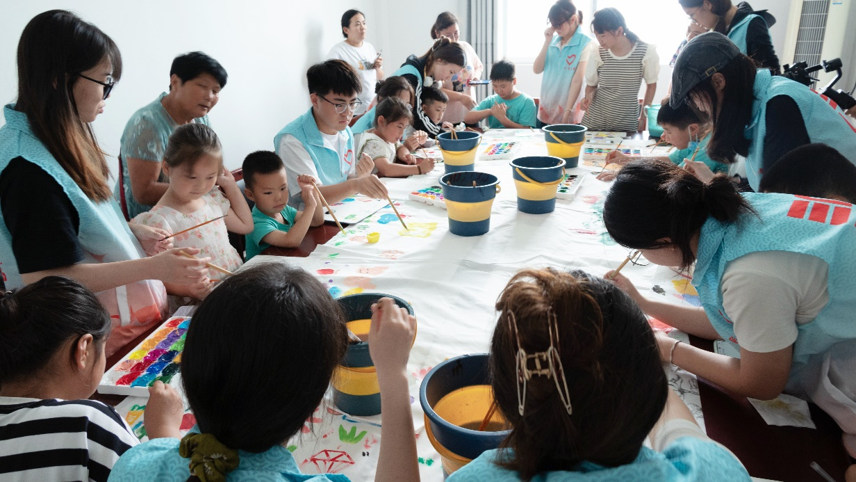 在陈杨村党群服务中心,淮小艺“青行绘梦”志愿团的成员与当地村干部、村民和小朋友们共同携手,用色彩和线条勾勒出生活在这片土地上的故事和情感。每位参与者在长卷上留下自己的祝福和寄语,表达对家乡美好未来的期许和对乡亲们的深情祝福。