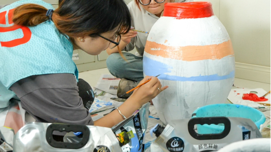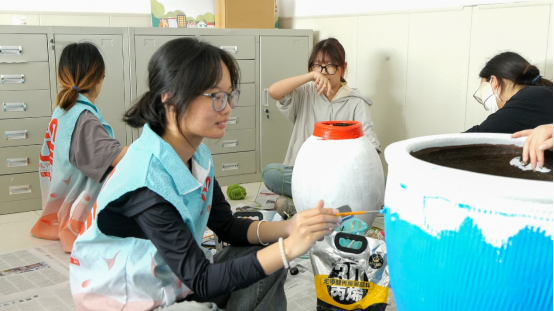 志愿团成员怀着对传统工艺的尊重和对乡村文化的热爱,积极投入到彩绘陶罐的实践中。活动前,他们与当地村民进行深入交流,了解和收集沈庄村的历史文化元素,以此作为设计灵感的来源。