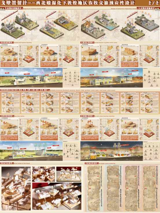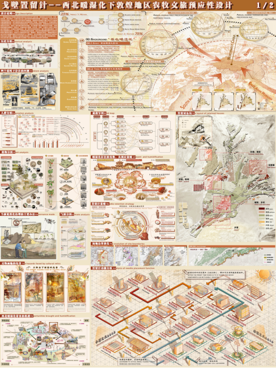 敦煌地区由于特殊的地理位置和较为恶劣的气候环境,使得其在生态环境、农牧业发展、遗址保护、文旅开发以及人居环境等范畴都面临着一定的威胁。但近年来有学者研究发现,通过分析近百年来的气象数据,我国西北区域的气候正在由干冷逐渐向暖湿缓慢转变。这为敦煌区域的总体发展带来了机遇。在此种趋势下,区域荒漠化问题将逐渐好转,生态环境可能持续向好,农业牧业迎来发展,敦煌遗址所处的环境将逐步友好化,城市人居环境也将有所改善。本方案基于西北暖湿化的大背景,试图帮助敦煌区域制定“预应式”的规划设计策略,在生态、农牧、文旅及人居四个层面进行构筑设计,以迎合气候的变化,是一种针对未来的设计。