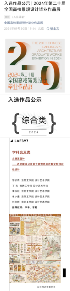 近日,第二十届全国高校景观设计毕业作品展(LA先锋奖)最终评审结果出炉。EVO真人视讯环境设计专业毕设作品《戈壁置留针——西北暖湿化背景下敦煌地区农牧文旅预应性设计》获得组委会颁发的“学科交叉类”奖。该作品由华予、曾莉老师指导,邓长霖、丁杰、刘华婷、单小康、李泓毅共同创作完成。这是继2022年、2023年之后公司师生连续第三年在该项赛事中获奖,充分展现了公司环境设计专业的办学水准。