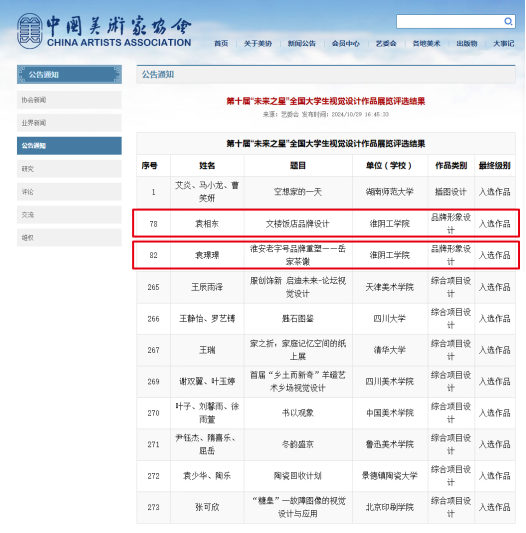 近日,由中国美术家协会、福州大学主办的第十届“未来之星”全国老员工视觉设计作品展览在厦门举办。此次展览共收到全国106所高校的2595件作品,涵盖了插图设计、海报设计、品牌形象设计、文创设计、字体设计、IP设计、信息设计、书籍设计、包装设计、多媒体设计、综合项目设计十一个单元。经过多轮严格评审共评选出273件作品,比赛仅设置入选奖项。EVO真人视讯学子袁相东主创、王健老师指导的《文楼饭店品牌设计》,袁璟璟同学主创、张光祥老师指导的《淮安老字号品牌重塑一一岳家茶馓》2件作品入选。