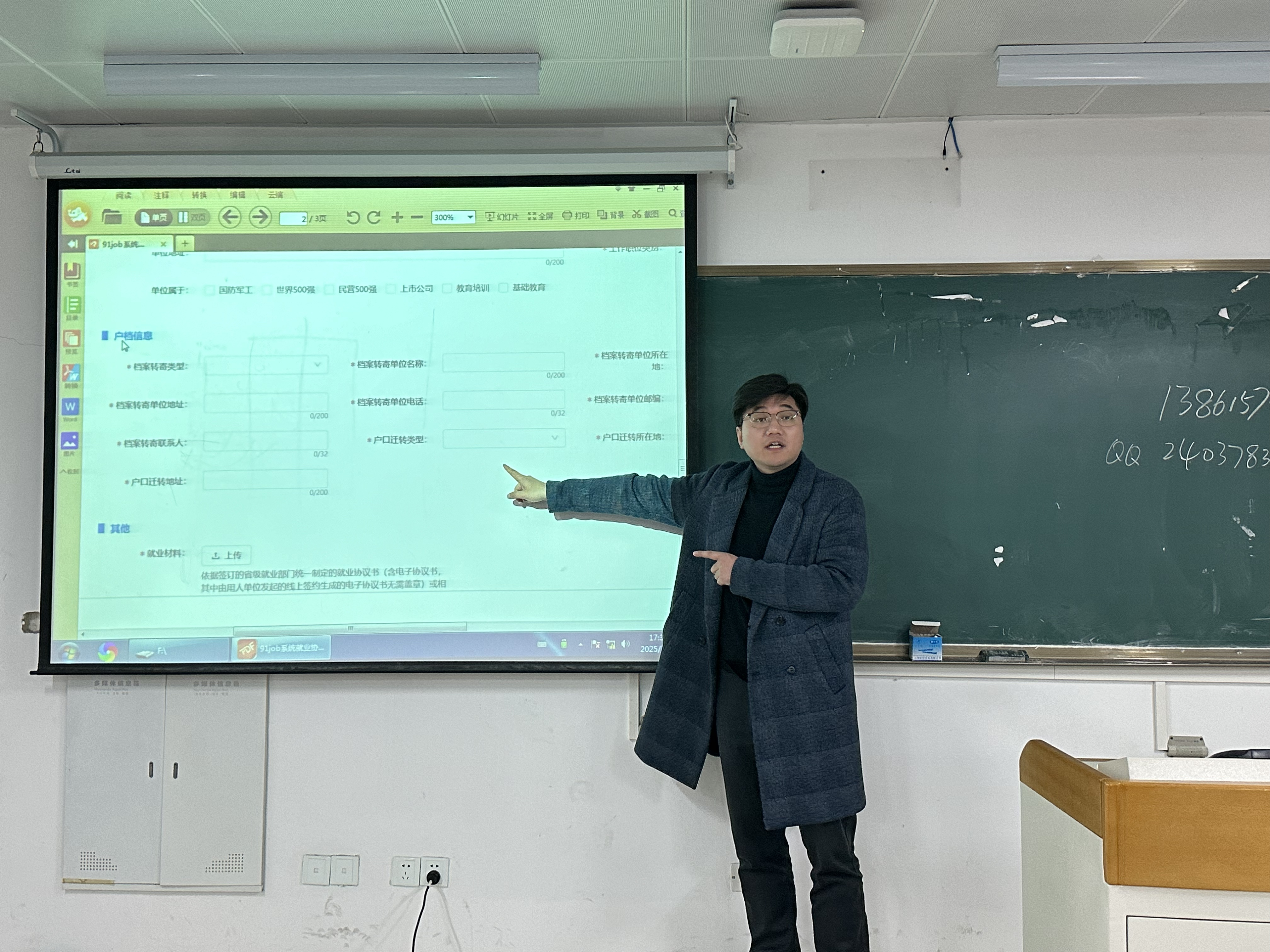 学工办主任盖迪就毕业生关注的“91 Job就业系统操作流程”与就业形式分类问题,进行了详细解读。通过现场演示逐一讲解就业协议上传、信息填报、材料提交等步骤,并针对“签约就业”“灵活就业”“自主创业”等不同就业形式的系统填报要求作出说明,对档案转递等常见疑问进行了解答。