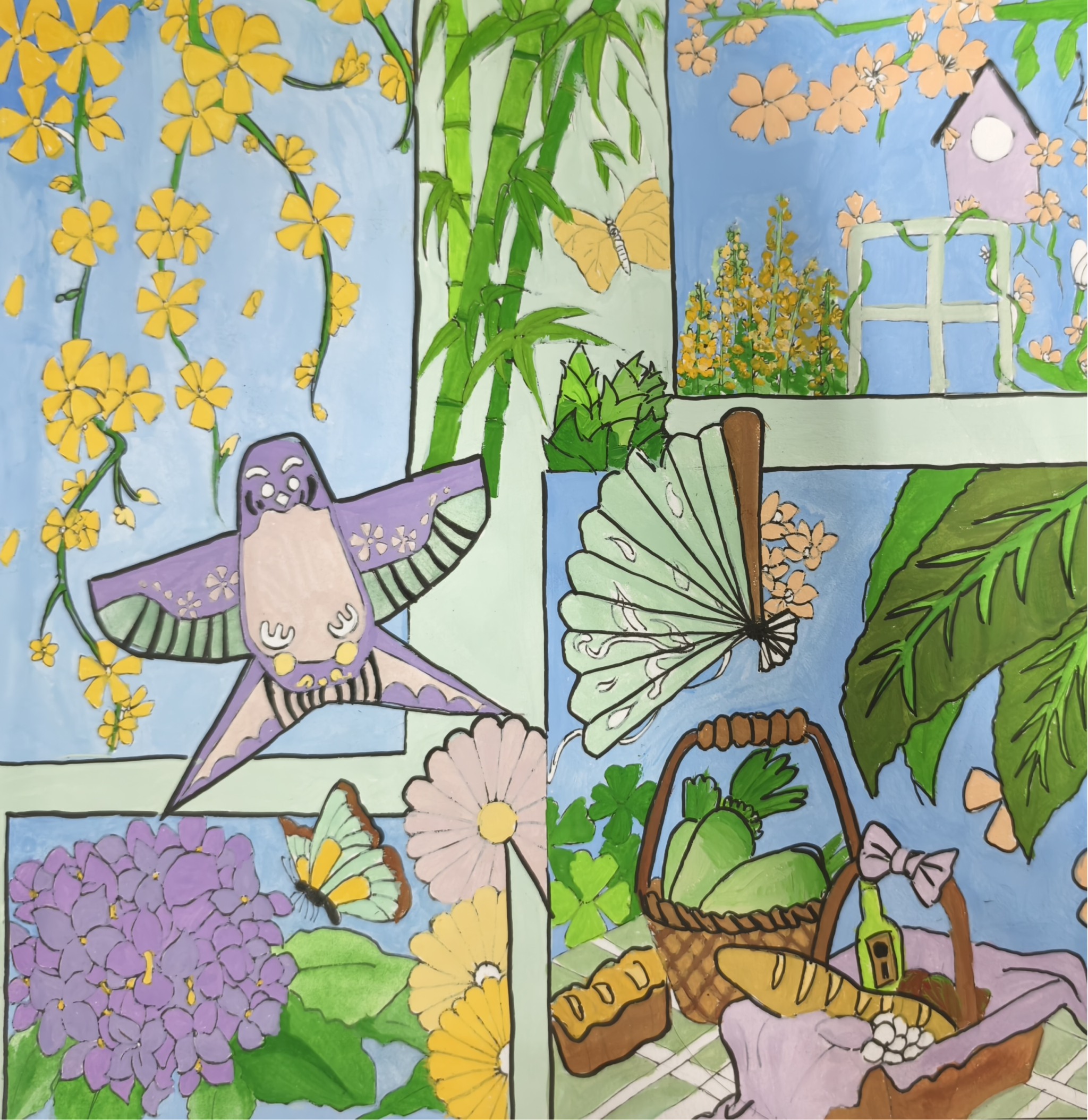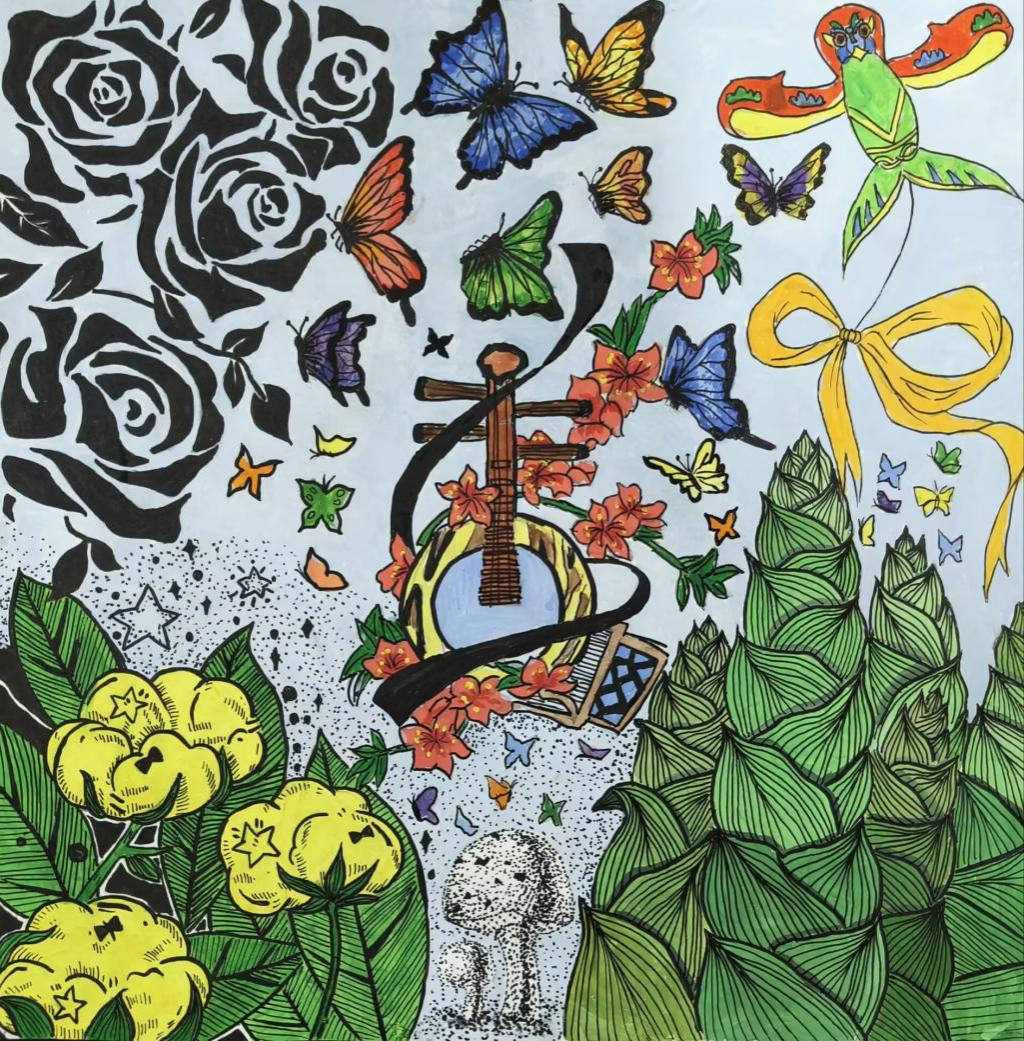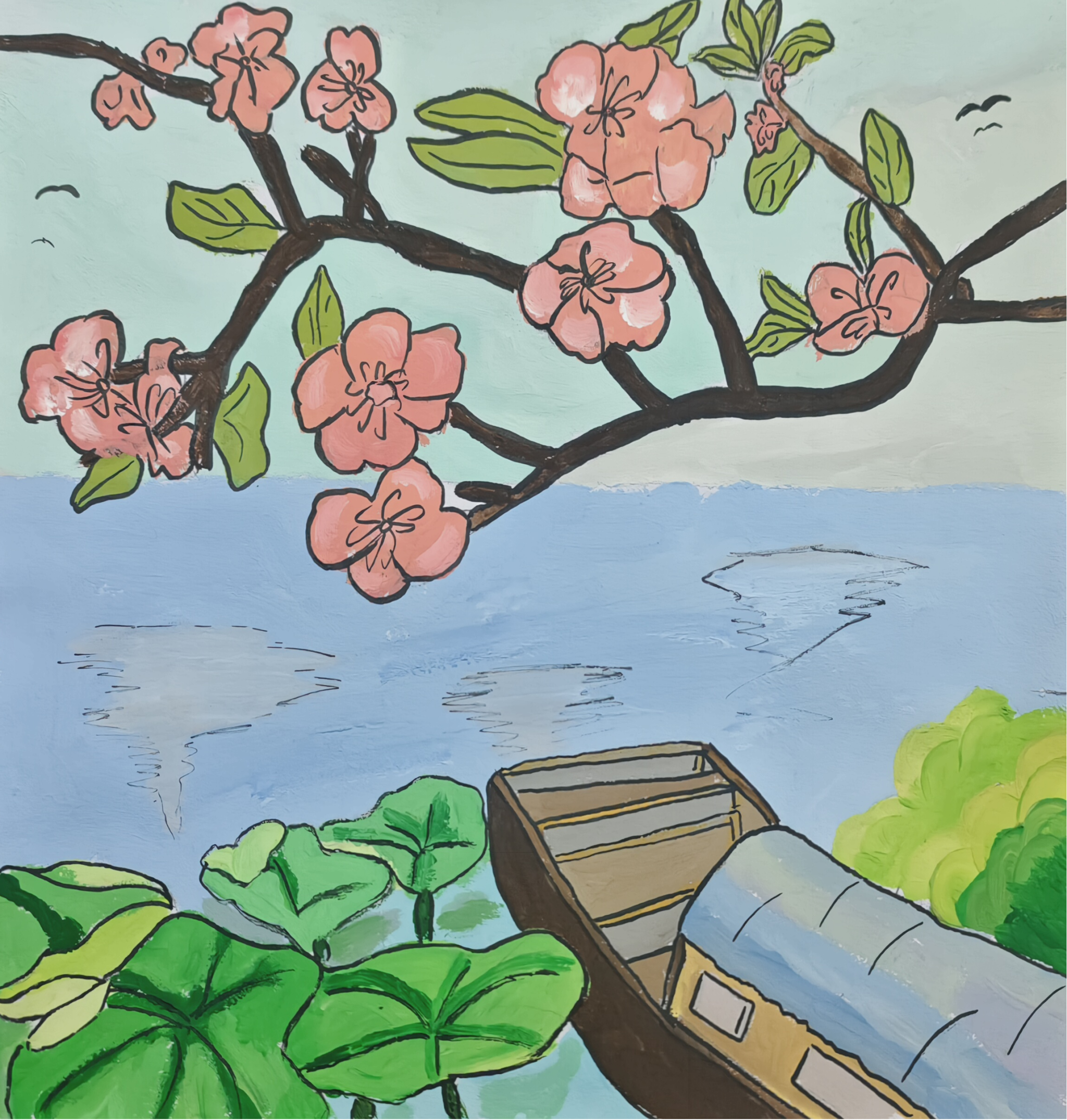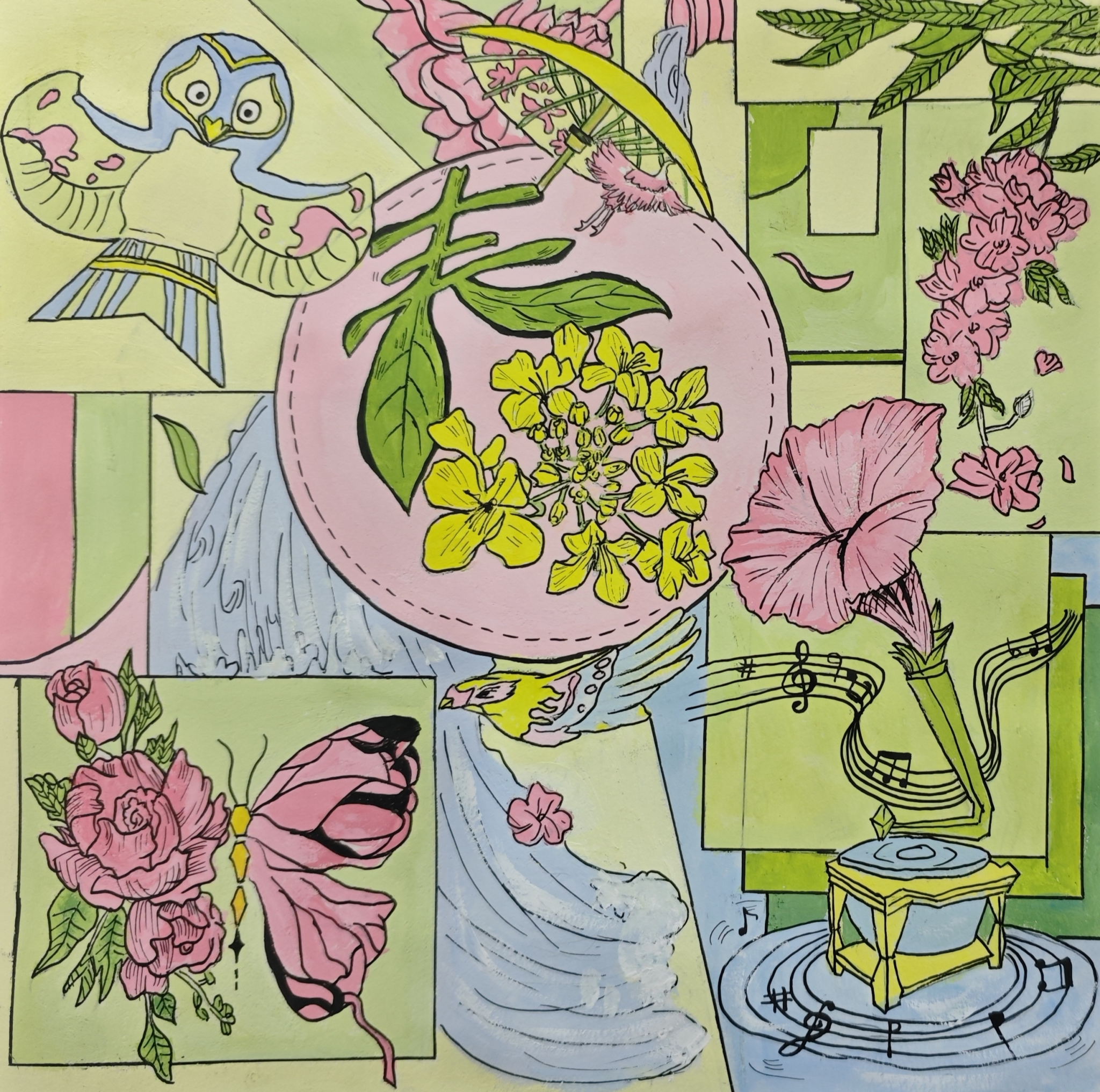 作品中形式美法则的运用凸显专业素养,多幅平面作品通过构图聚焦春花主体,运用重复与渐变法则展现大地复苏,色彩对比则形成视觉交响,桃花、春燕以高明度粉白与深褐枝干的互补对比强化主体,也有作品表现蓝绿邻近色渐变展现草色遥看的朦胧美,肌理语言的创新令人耳目一新,以及综合表现的部分创作展现良好。