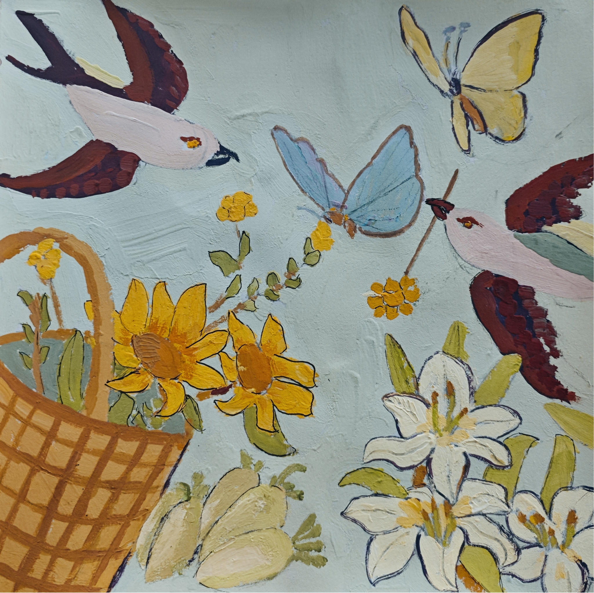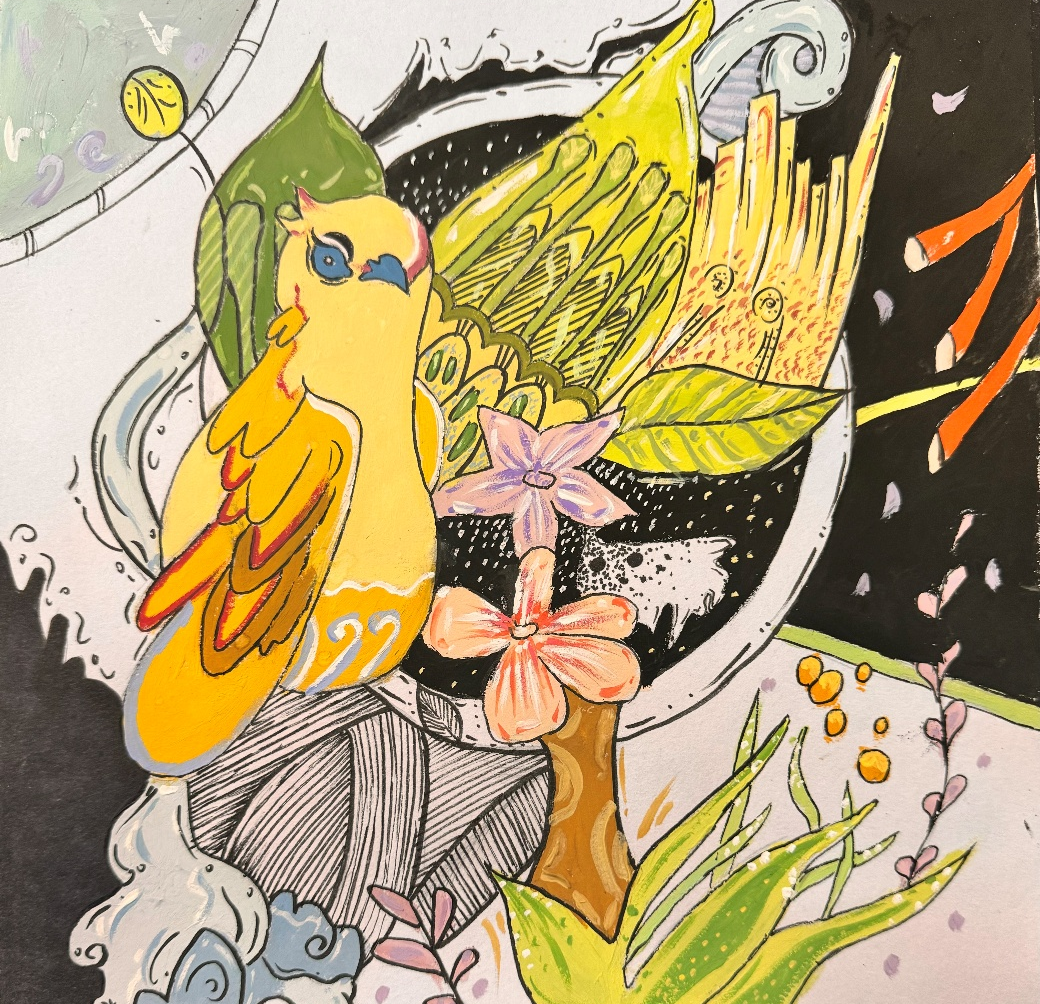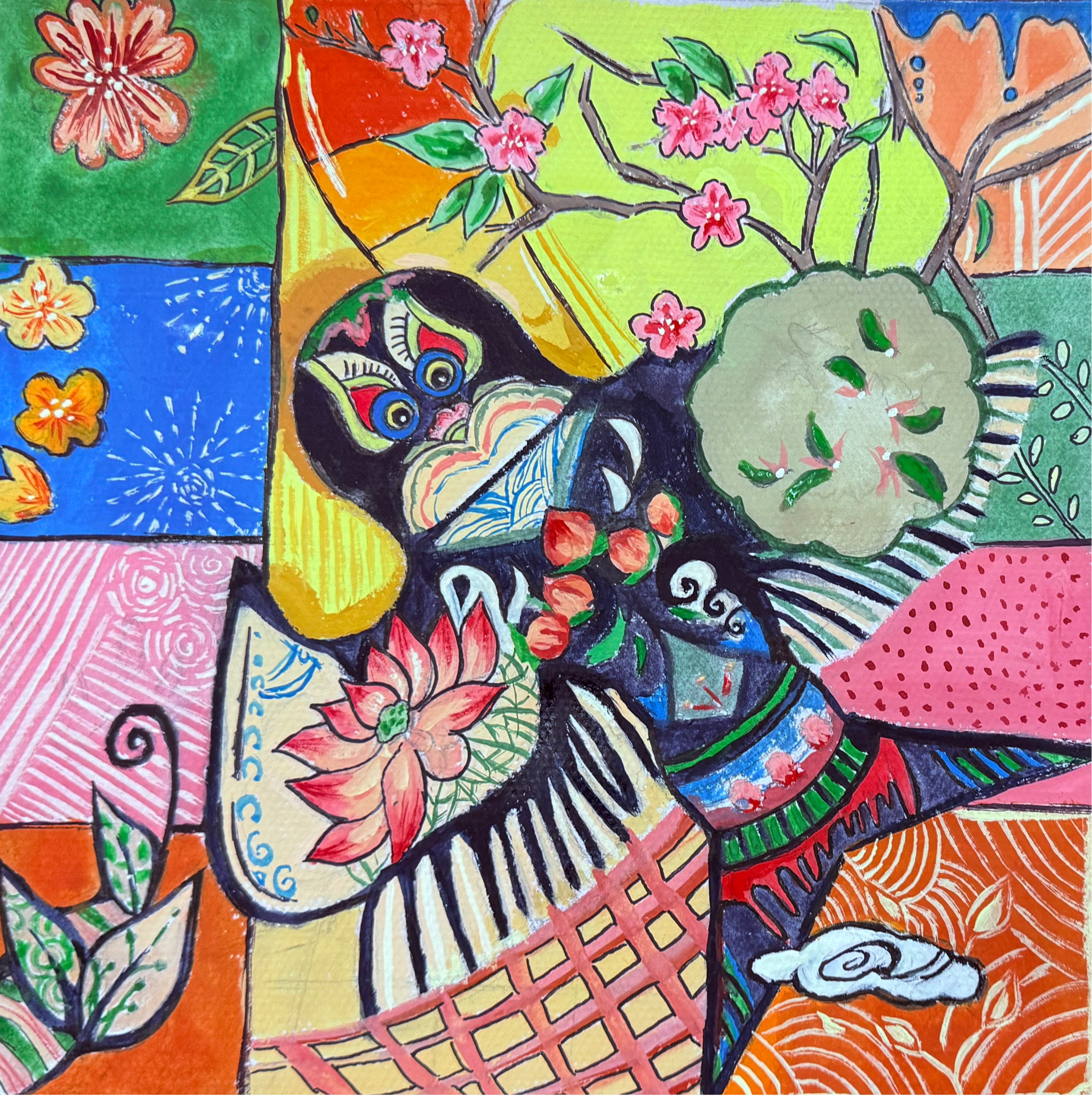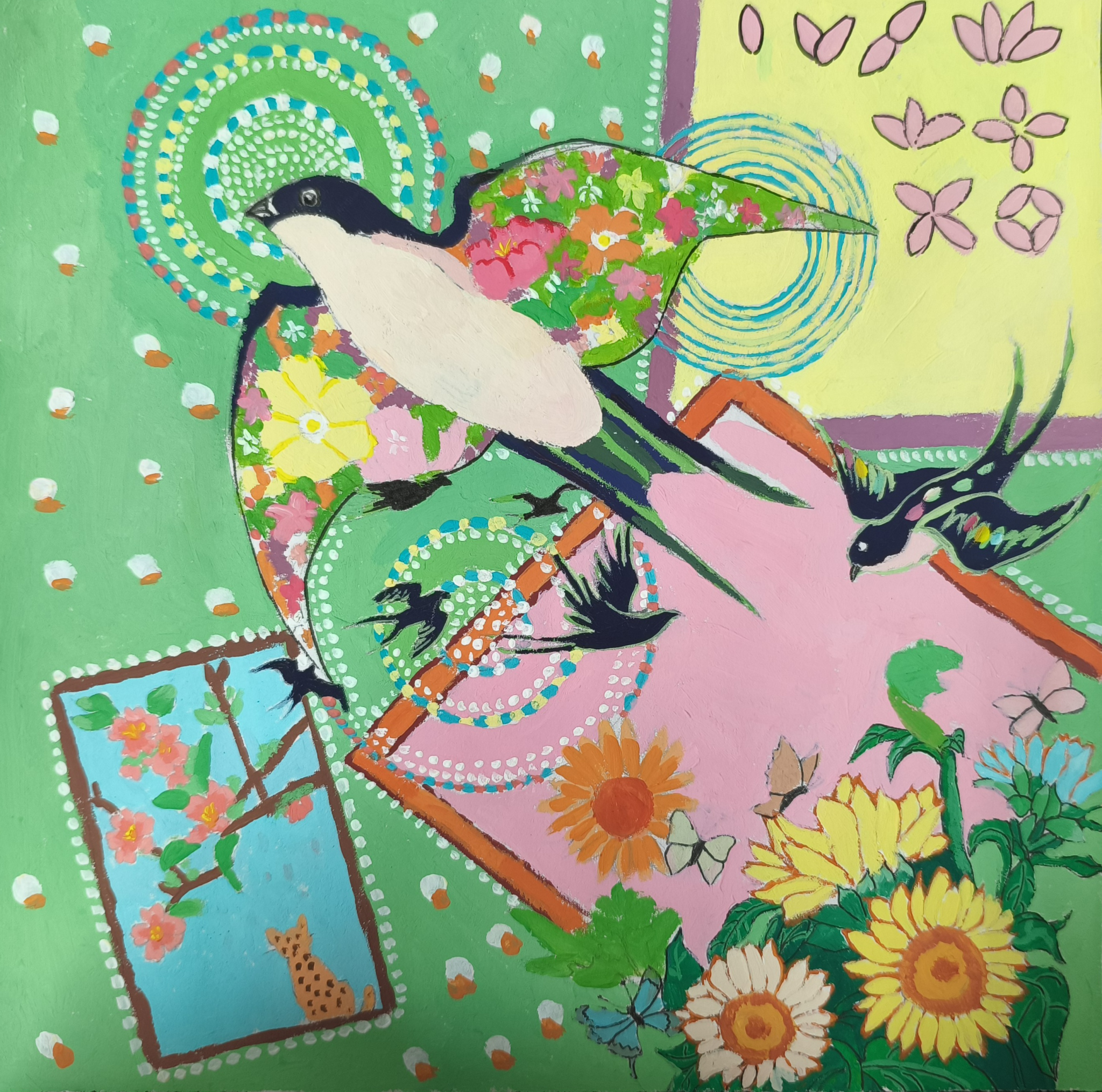 作品中形式美法则的运用凸显专业素养,多幅平面作品通过构图聚焦春花主体,运用重复与渐变法则展现大地复苏,色彩对比则形成视觉交响,桃花、春燕以高明度粉白与深褐枝干的互补对比强化主体,也有作品表现蓝绿邻近色渐变展现草色遥看的朦胧美,肌理语言的创新令人耳目一新,以及综合表现的部分创作展现良好。