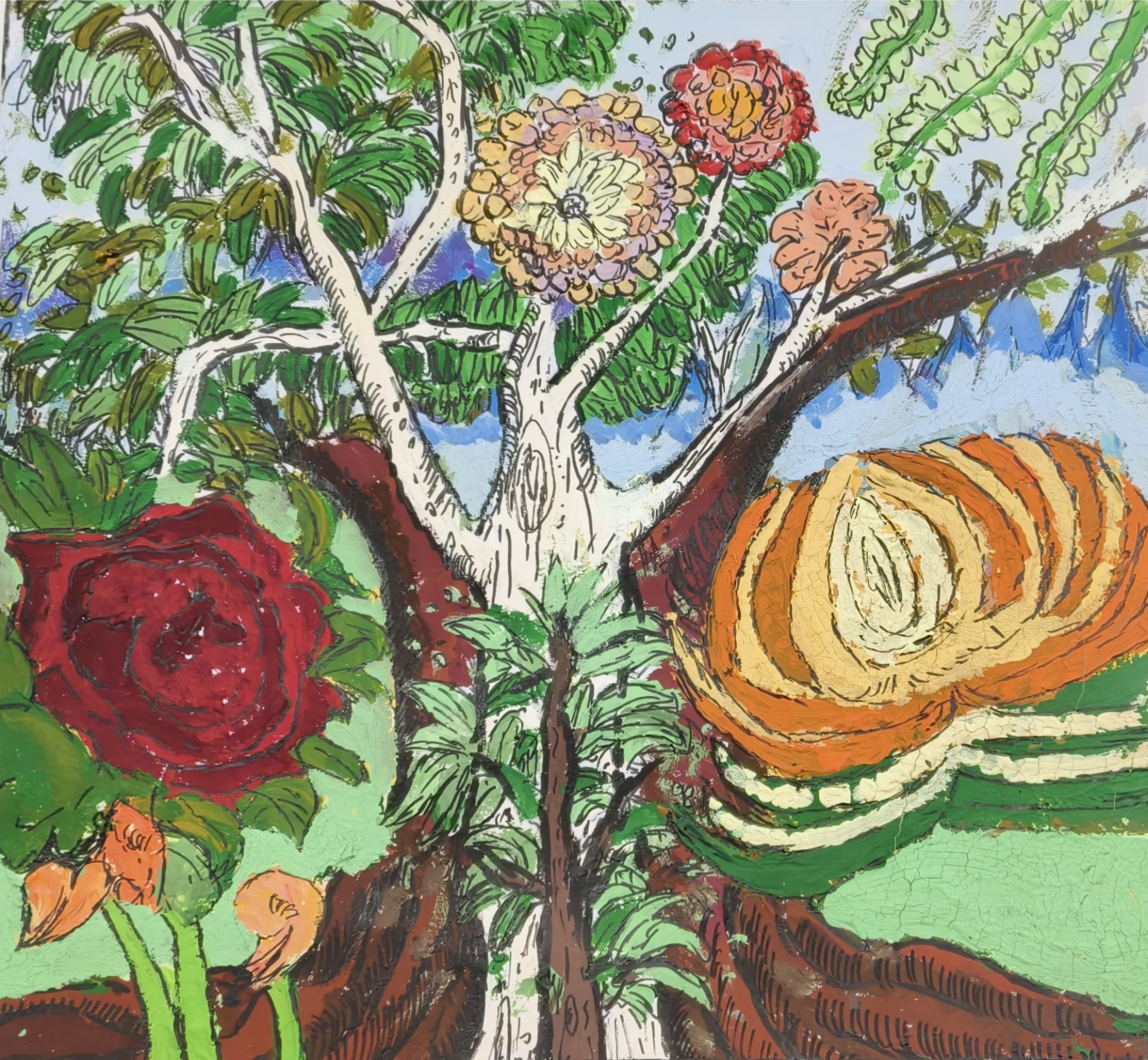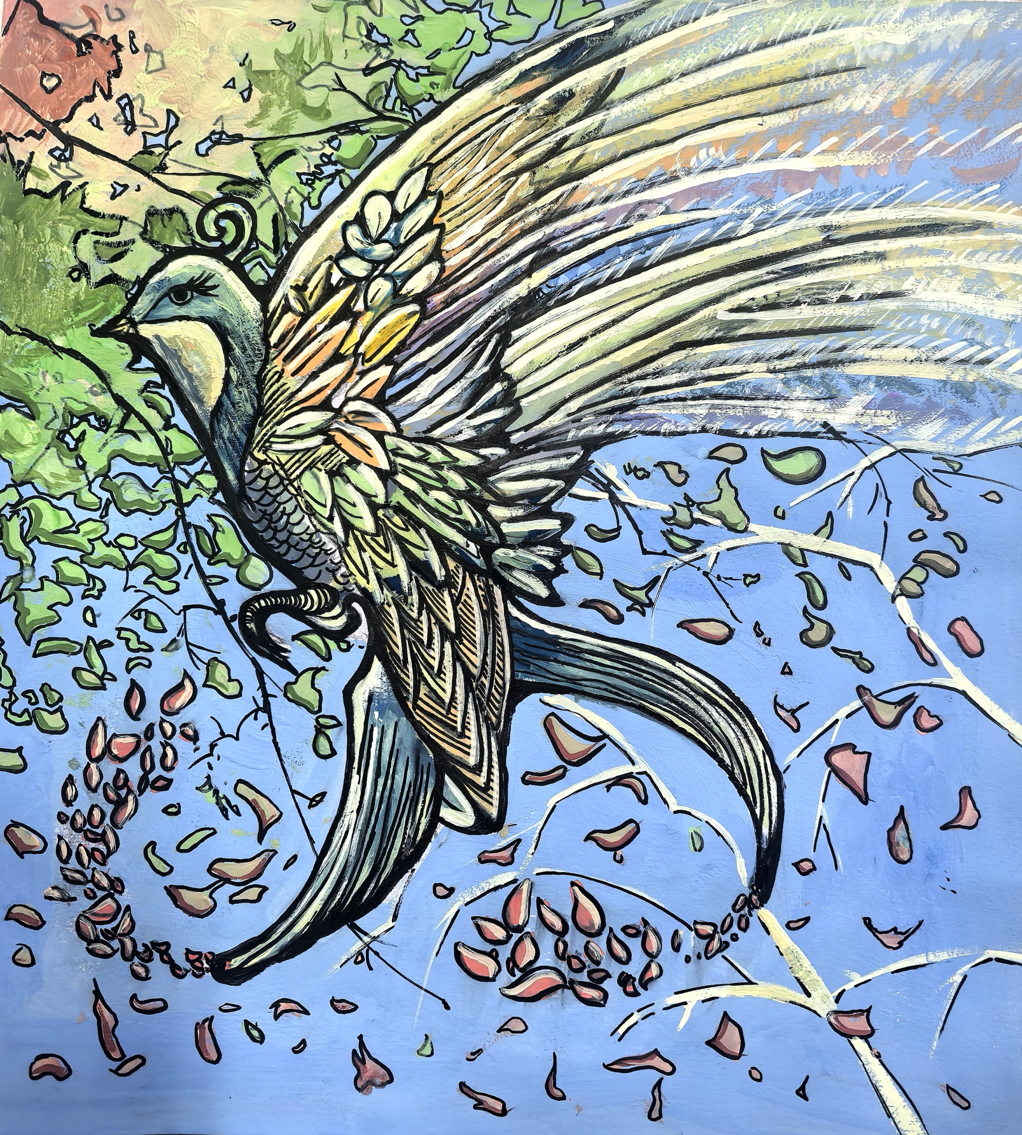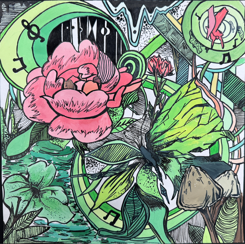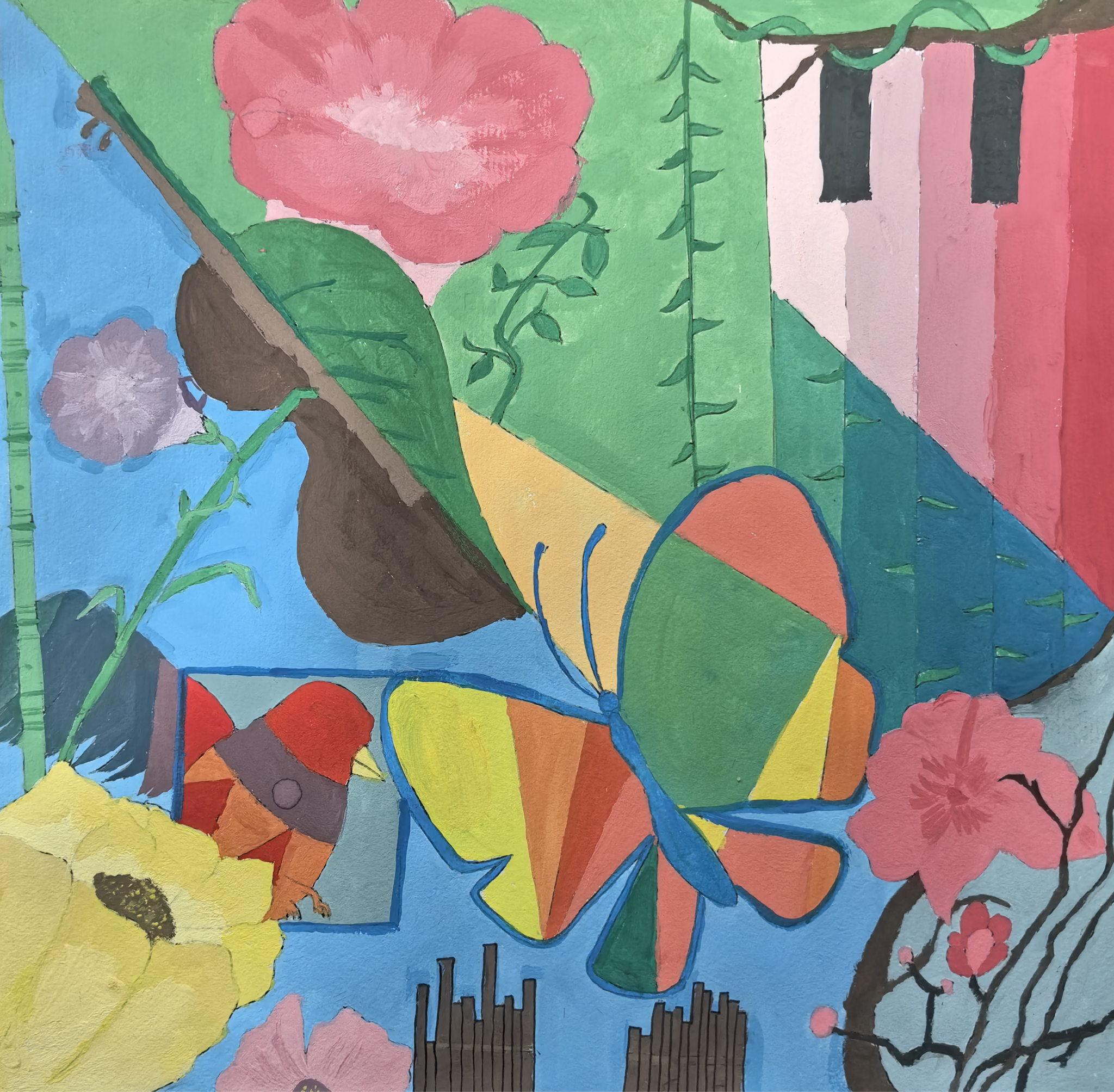 作品中形式美法则的运用凸显专业素养,多幅平面作品通过构图聚焦春花主体,运用重复与渐变法则展现大地复苏,色彩对比则形成视觉交响,桃花、春燕以高明度粉白与深褐枝干的互补对比强化主体,也有作品表现蓝绿邻近色渐变展现草色遥看的朦胧美,肌理语言的创新令人耳目一新,以及综合表现的部分创作展现良好。