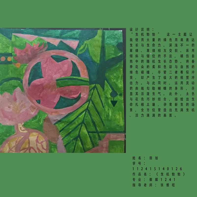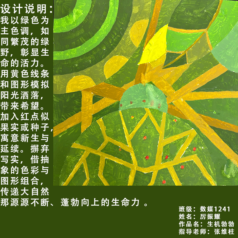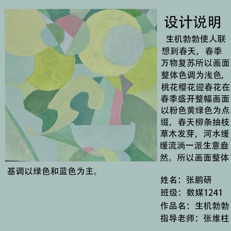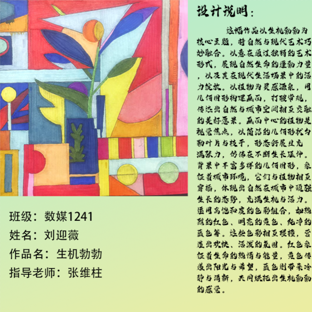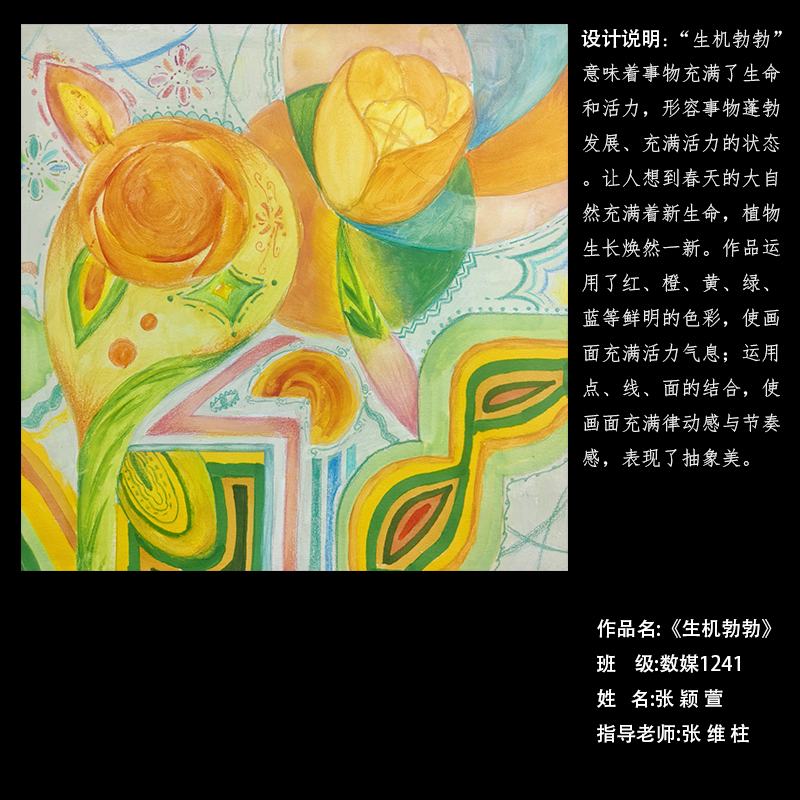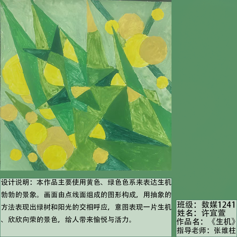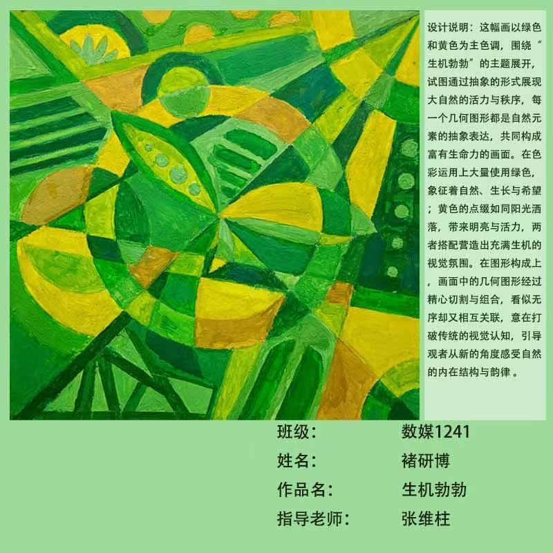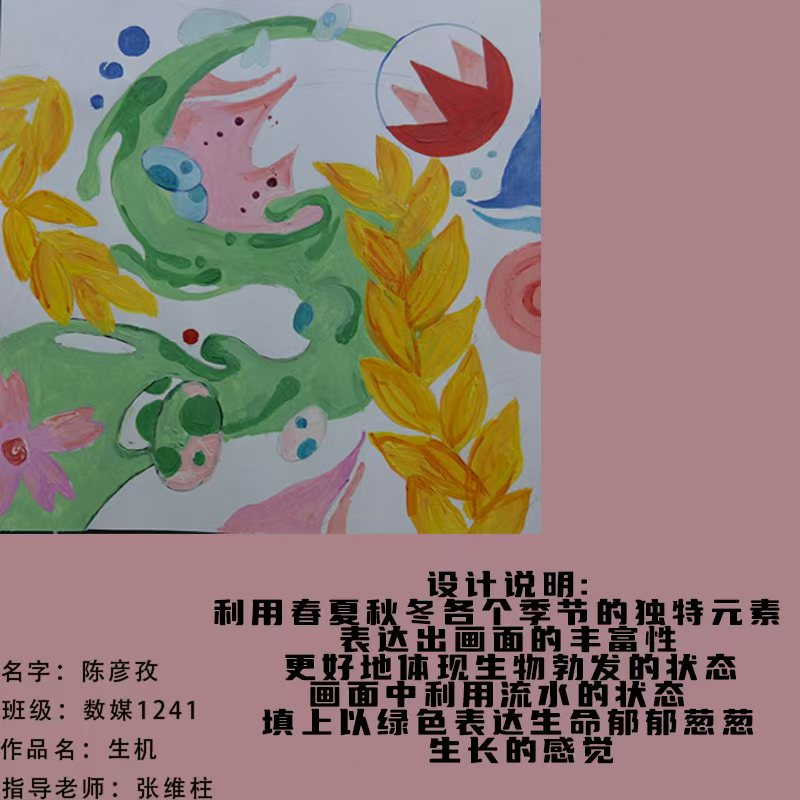 在课程学习中,同学们较好的完成了设计元素构成这门课程的大纲要求,从设计元素的"点、线、面"开始,灵活运用并组织画面,使其产生视觉美感和韵律感,感受不同的表现形式所展现出的不同的视觉效果,并且在抽象空间中,能够懂得表达自己的感觉,自由发挥,将抽象元素巧妙结合。员工在主题创作方面,能够运用抽象元素进行情感表达,较好的完成了这个课程的大纲要求,缺点是个别同学的作业,做工过于潦草,还需要进一步提升改进。在本次"生机勃勃"主题设计作业展中,员工们通过点线面的基础构成演绎出物体蓬勃发展的势态。点元素的运用尤为精妙,点状元素在空间节奏中的动态平衡,线性语言成为串联视觉的纽带,色彩调和,肌理笔触,尽情展现春天的韵律美。在色彩方面,注重色调和整体色彩与感情的表达都得到了较好的提升。色彩能够更好的,表达出一种生机勃勃的感觉,让画面更加的丰富。