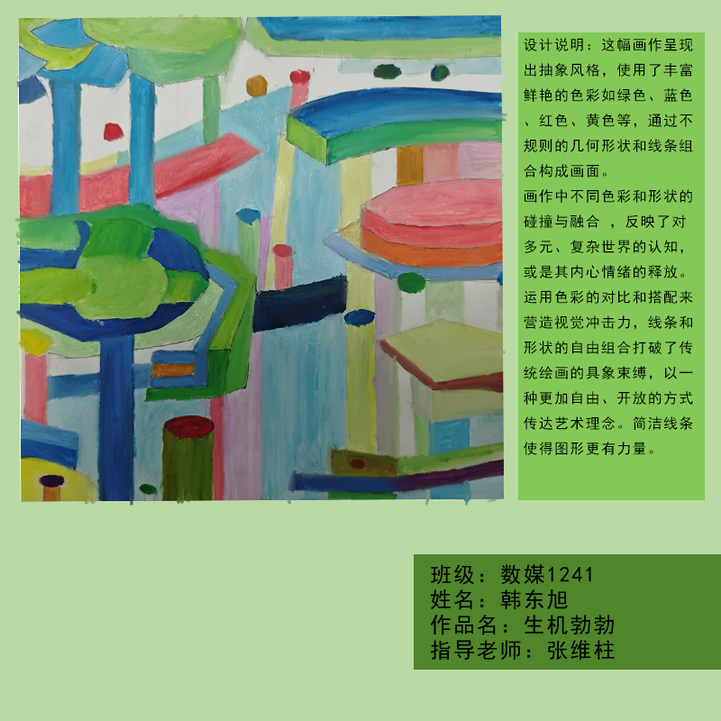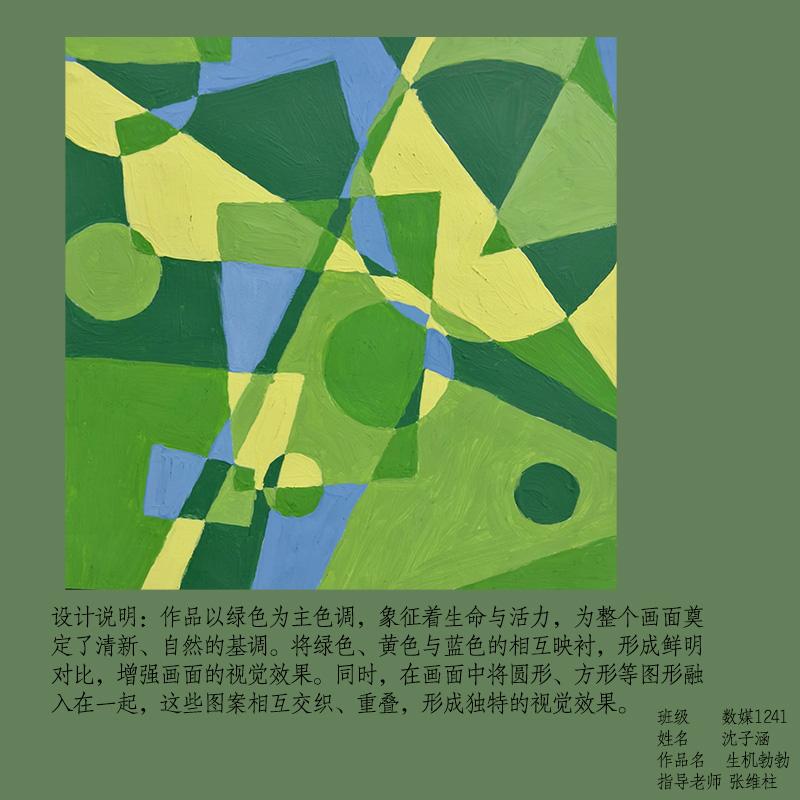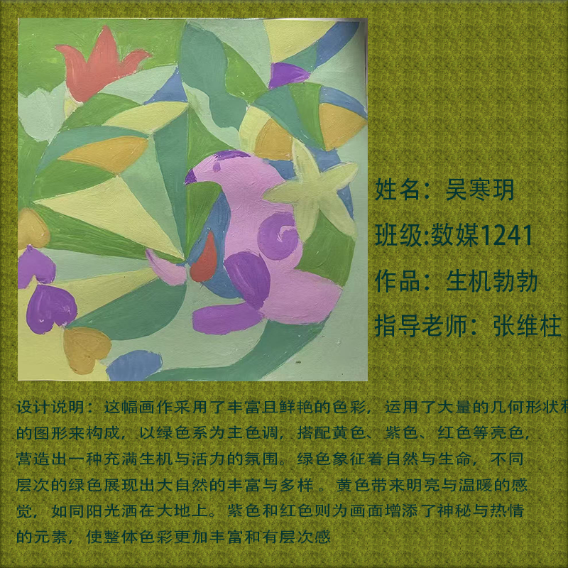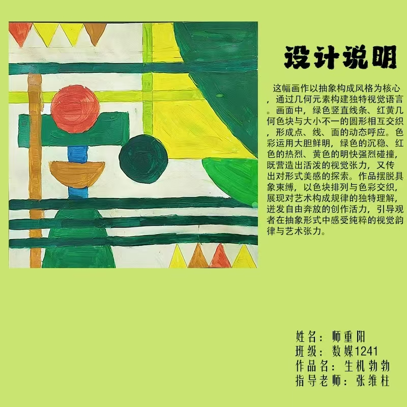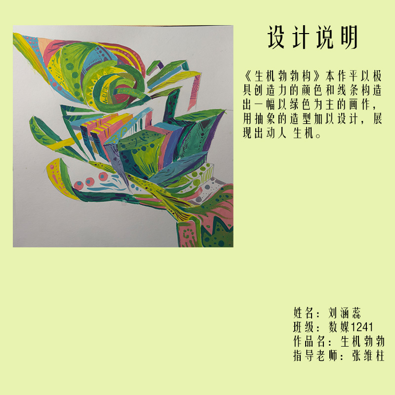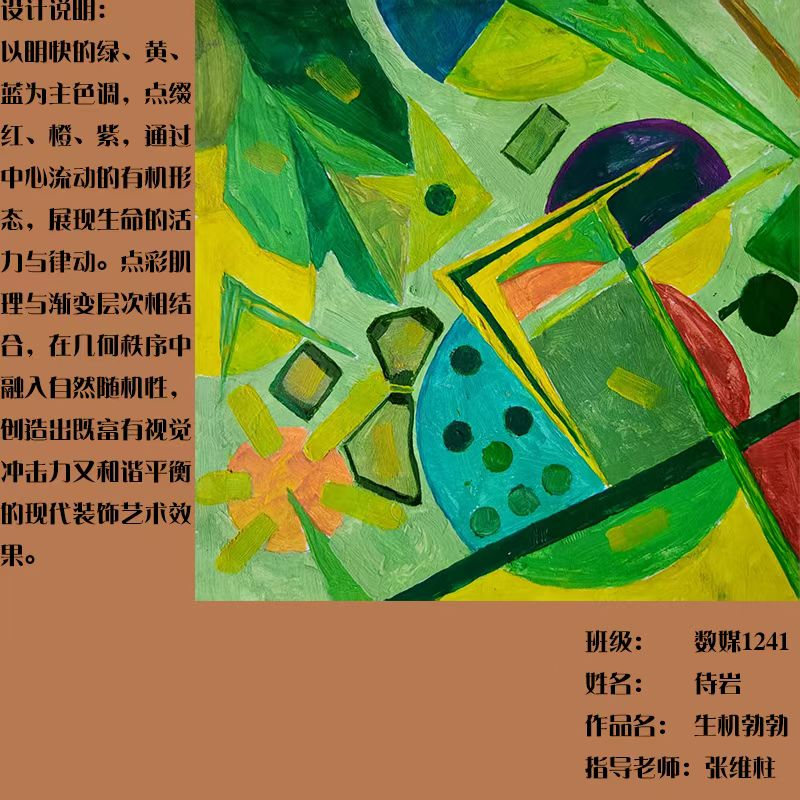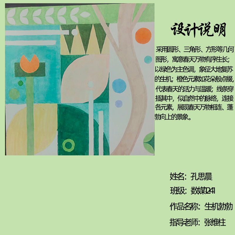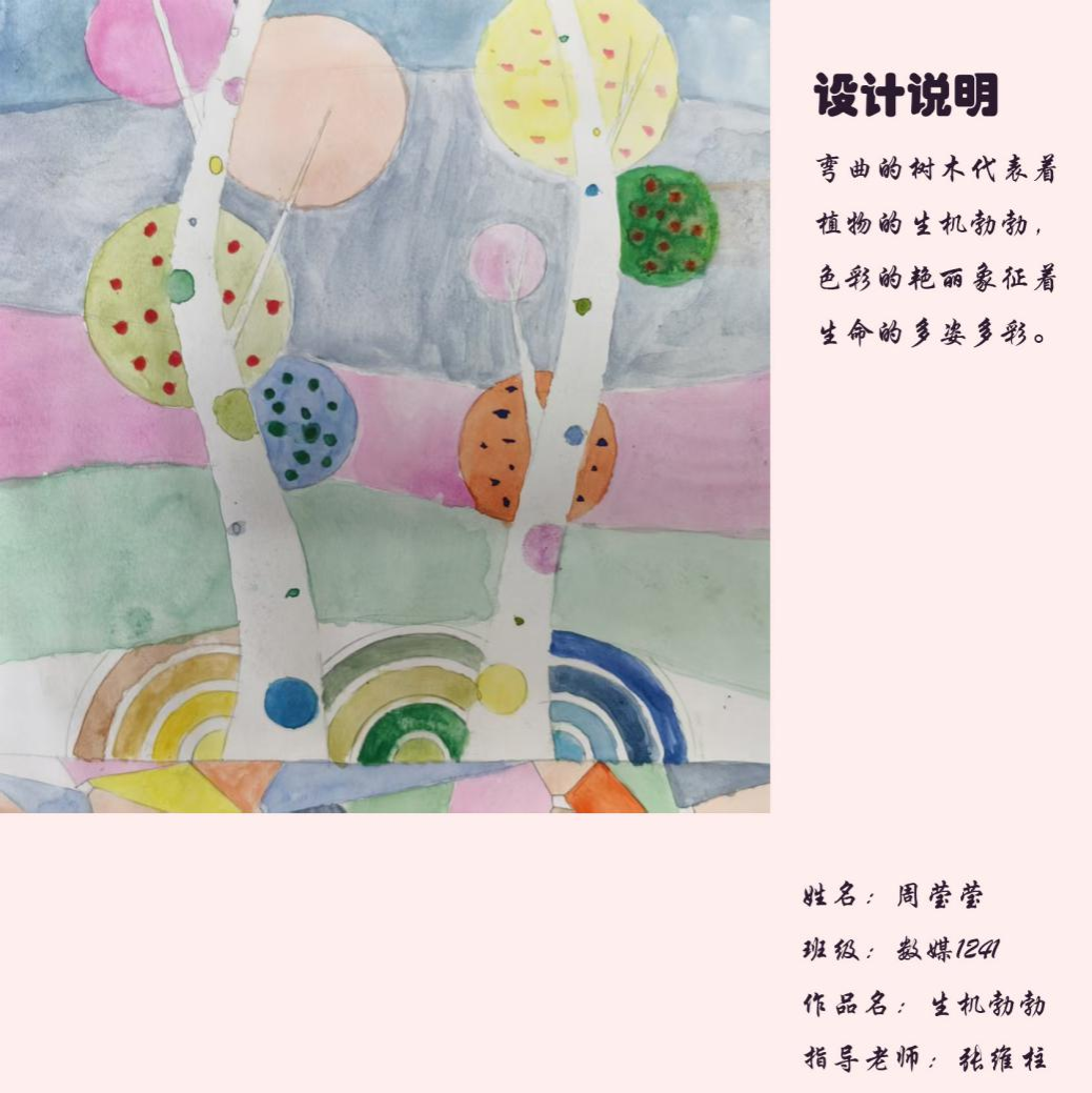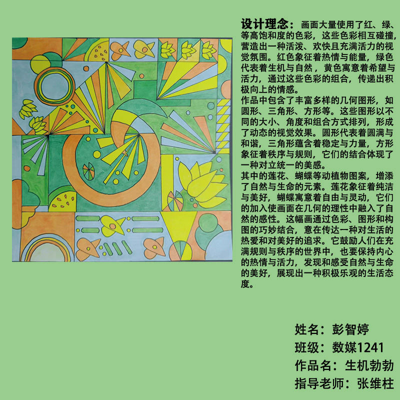 在课程学习中,同学们较好的完成了设计元素构成这门课程的大纲要求,从设计元素的"点、线、面"开始,灵活运用并组织画面,使其产生视觉美感和韵律感,感受不同的表现形式所展现出的不同的视觉效果,并且在抽象空间中,能够懂得表达自己的感觉,自由发挥,将抽象元素巧妙结合。员工在主题创作方面,能够运用抽象元素进行情感表达,较好的完成了这个课程的大纲要求,缺点是个别同学的作业,做工过于潦草,还需要进一步提升改进。在本次"生机勃勃"主题设计作业展中,员工们通过点线面的基础构成演绎出物体蓬勃发展的势态。点元素的运用尤为精妙,点状元素在空间节奏中的动态平衡,线性语言成为串联视觉的纽带,色彩调和,肌理笔触,尽情展现春天的韵律美。在色彩方面,注重色调和整体色彩与感情的表达都得到了较好的提升。色彩能够更好的,表达出一种生机勃勃的感觉,让画面更加的丰富。