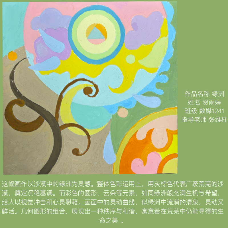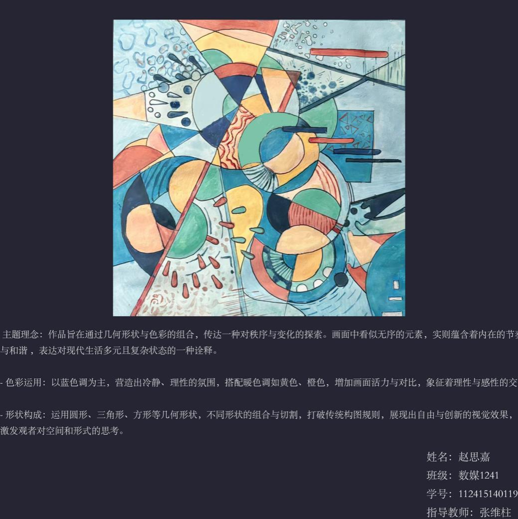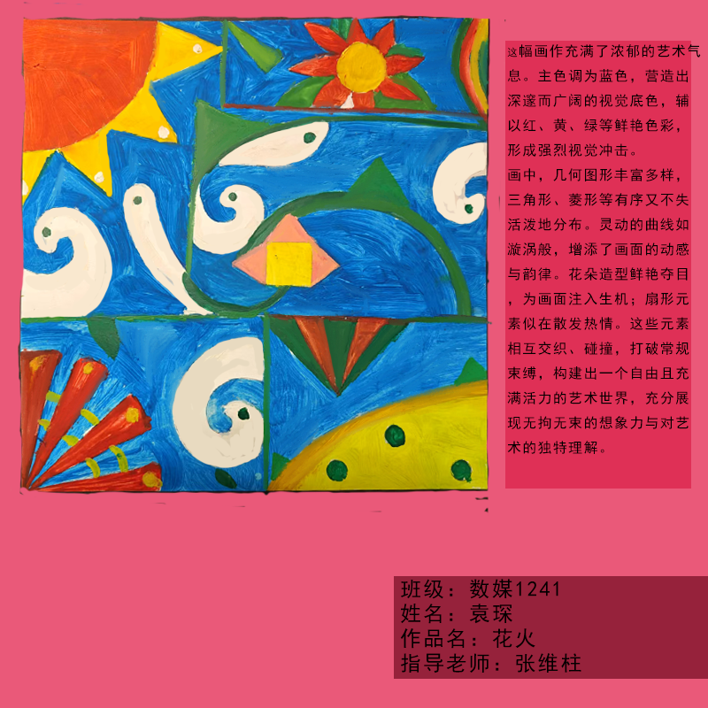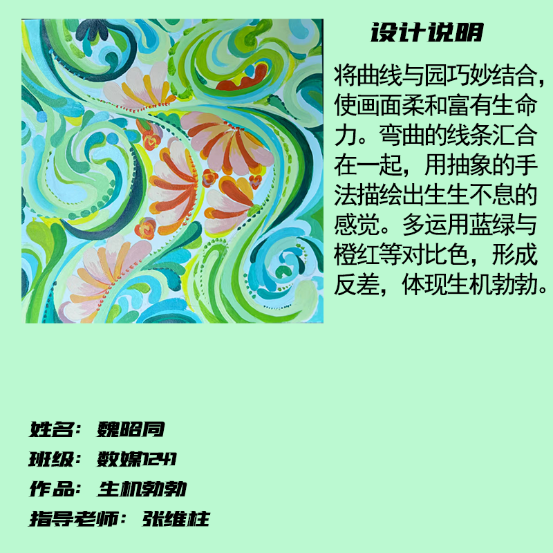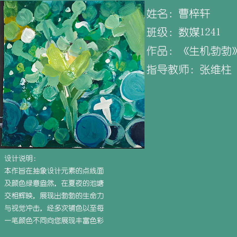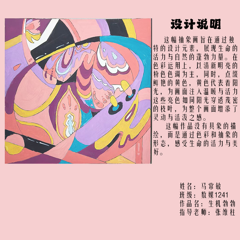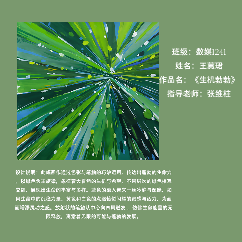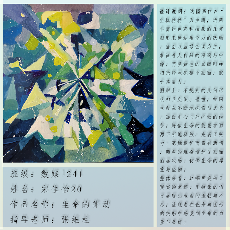 在课程学习中,同学们较好的完成了设计元素构成这门课程的大纲要求,从设计元素的"点、线、面"开始,灵活运用并组织画面,使其产生视觉美感和韵律感,感受不同的表现形式所展现出的不同的视觉效果,并且在抽象空间中,能够懂得表达自己的感觉,自由发挥,将抽象元素巧妙结合。员工在主题创作方面,能够运用抽象元素进行情感表达,较好的完成了这个课程的大纲要求,缺点是个别同学的作业,做工过于潦草,还需要进一步提升改进。在本次"生机勃勃"主题设计作业展中,员工们通过点线面的基础构成演绎出物体蓬勃发展的势态。点元素的运用尤为精妙,点状元素在空间节奏中的动态平衡,线性语言成为串联视觉的纽带,色彩调和,肌理笔触,尽情展现春天的韵律美。在色彩方面,注重色调和整体色彩与感情的表达都得到了较好的提升。色彩能够更好的,表达出一种生机勃勃的感觉,让画面更加的丰富。