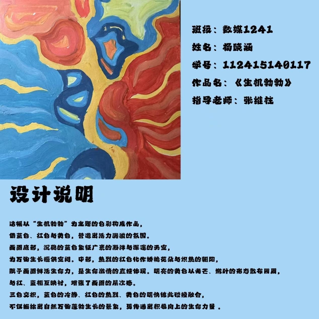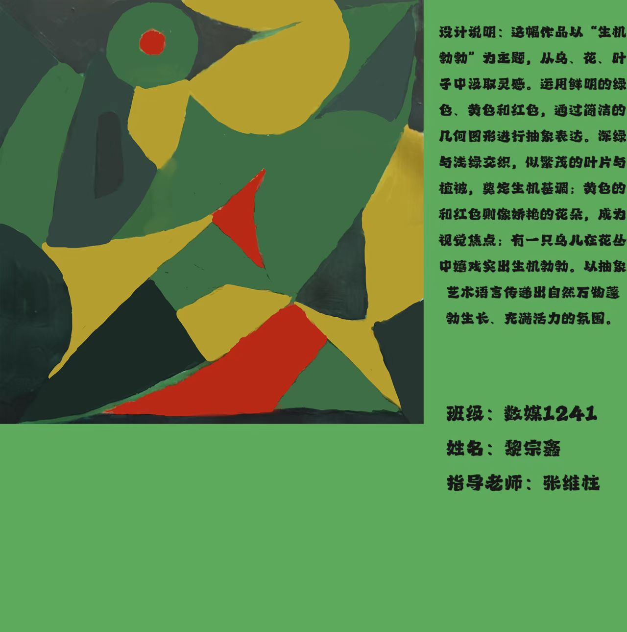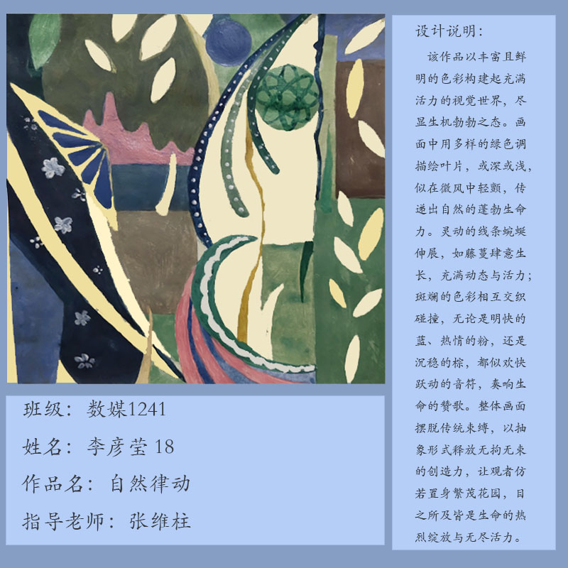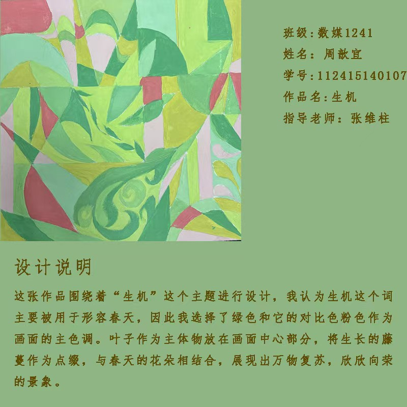 课程作业以《生机勃勃》为主题,进行元素构成设计,创作完成大作业,《设计元素构成》课程圆满结束,收获颇丰。