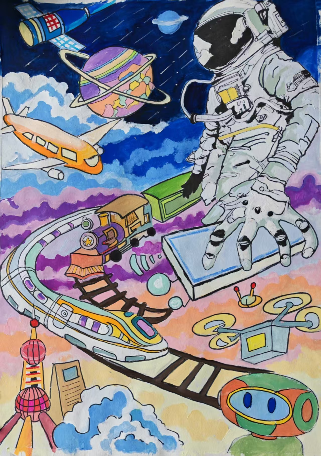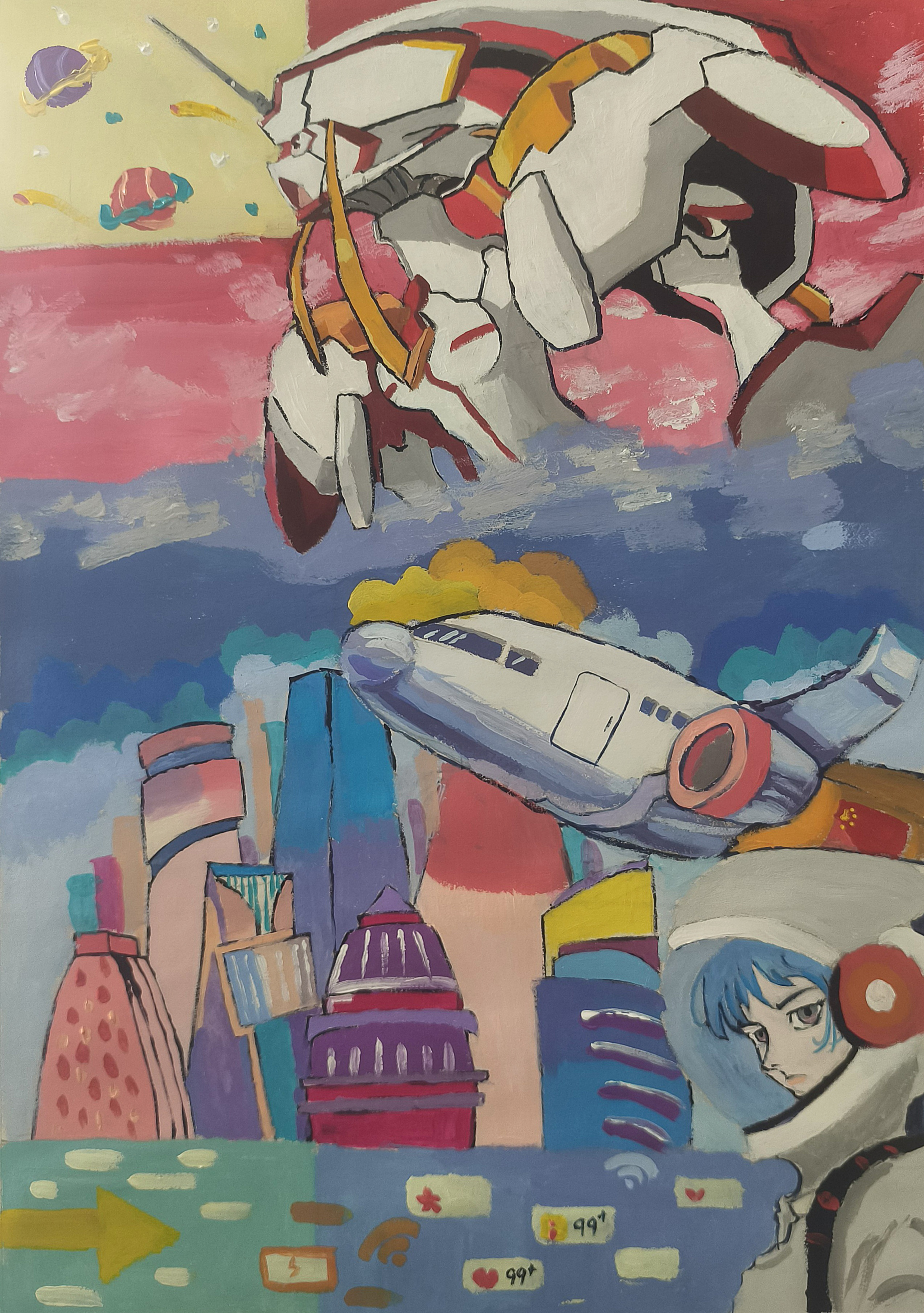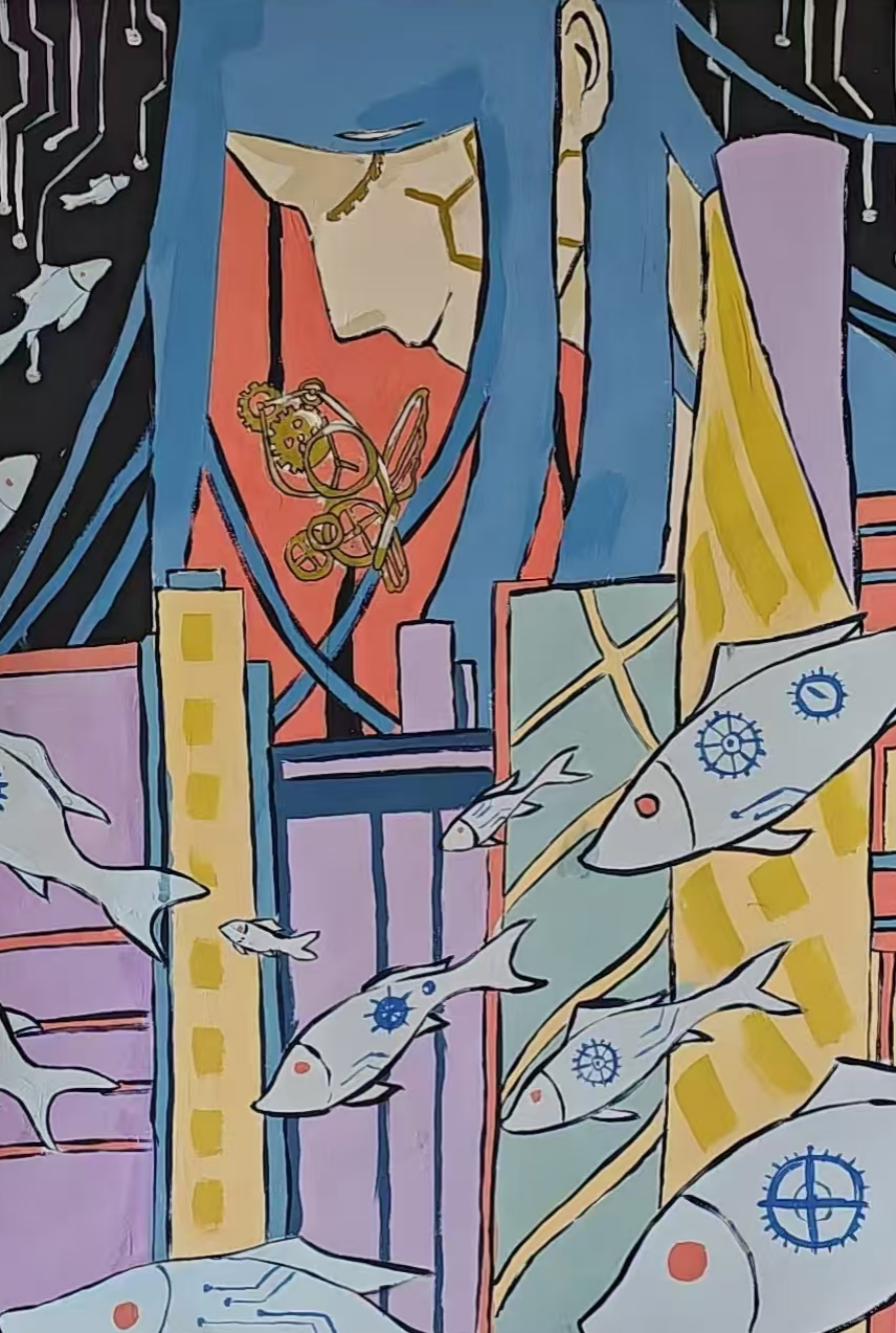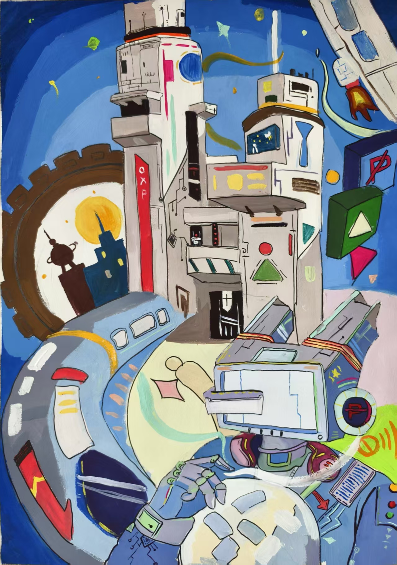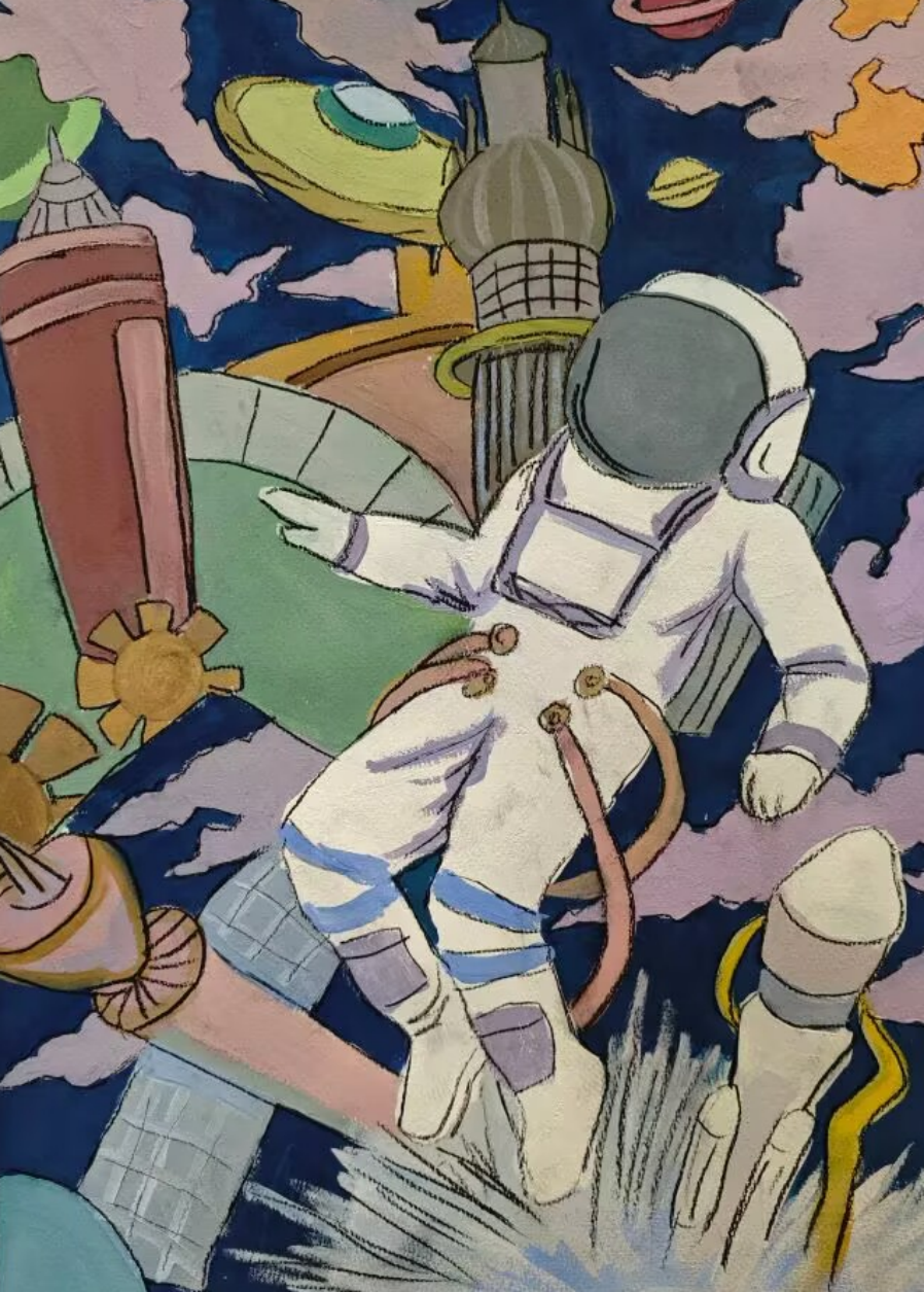 同学们围绕《未来科技》这一主题,在科技与生活、未来社区、环保可持续性、航天航空、共享经济、人工智能、万物智联、生命科学等方面开展创想。在色彩意向归纳层面,员工运用数字蓝、金属银、荧光绿等具有科技象征性的色系建立视觉符号系统,通过提取太空探索、深海工程等科技场景的典型色谱,将深空紫与数据流的暖色红橙碰撞重组,构建出兼具理性与幻想的色彩语义场景。装饰性归纳作品则采用几何色块拼接、渐变色等手法,将复杂的科技意象提炼为简约的视觉模块。作品突出未来科技及城市共生的状态,通过精确控制的色相渐变,空间环境营造,并进行对比与调和的探索,同学们大胆尝试强对比色的运用,在面积上进行合理构成布局,使视觉冲突中达成微妙平衡。从整体创作的作品来看,印证了科技主题下色彩表现的无限可能,同学们的自由创作和个性发挥较好,也可见同学们既有突破常规的勇气,也能遵循色彩科学的内在规律。