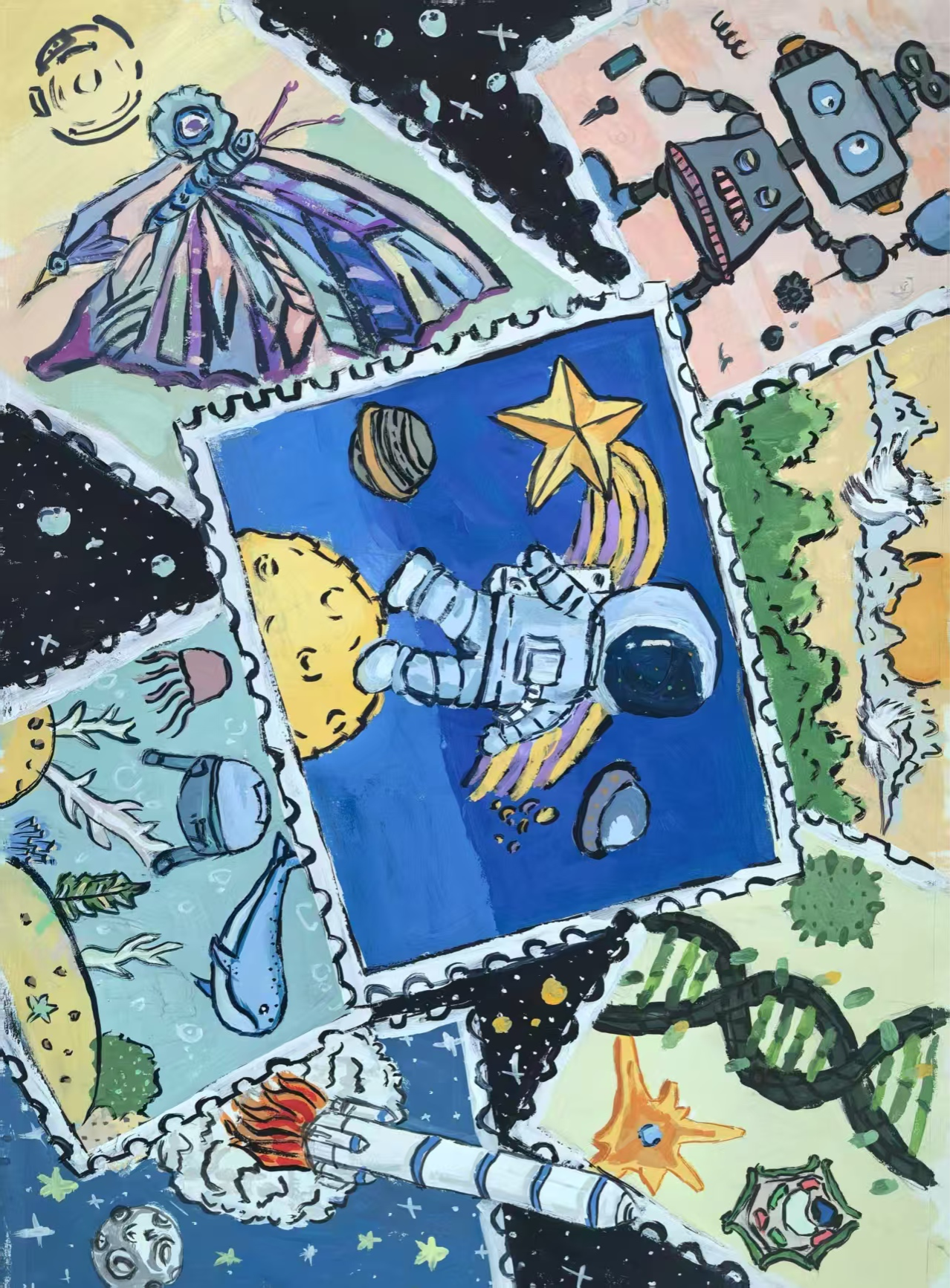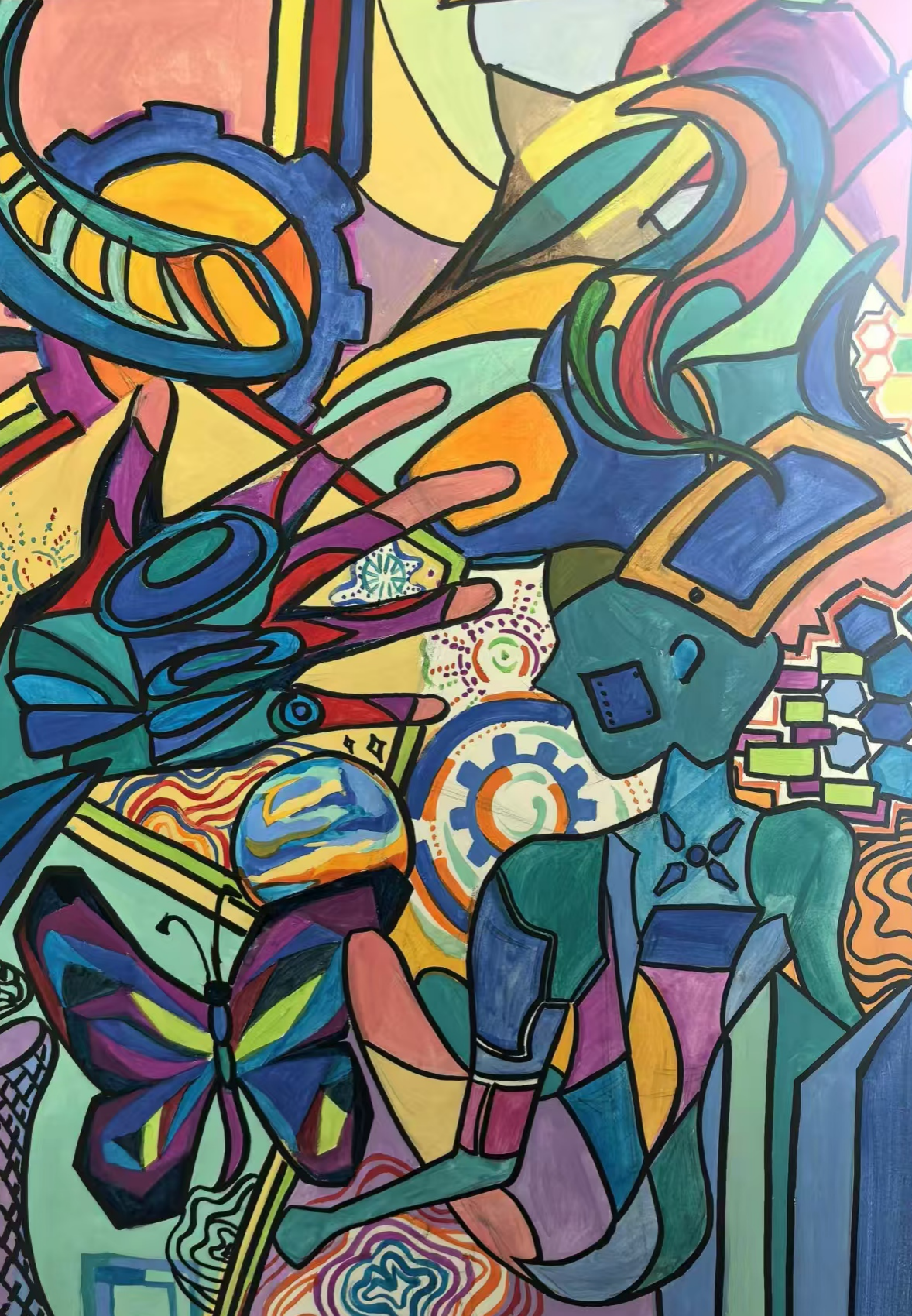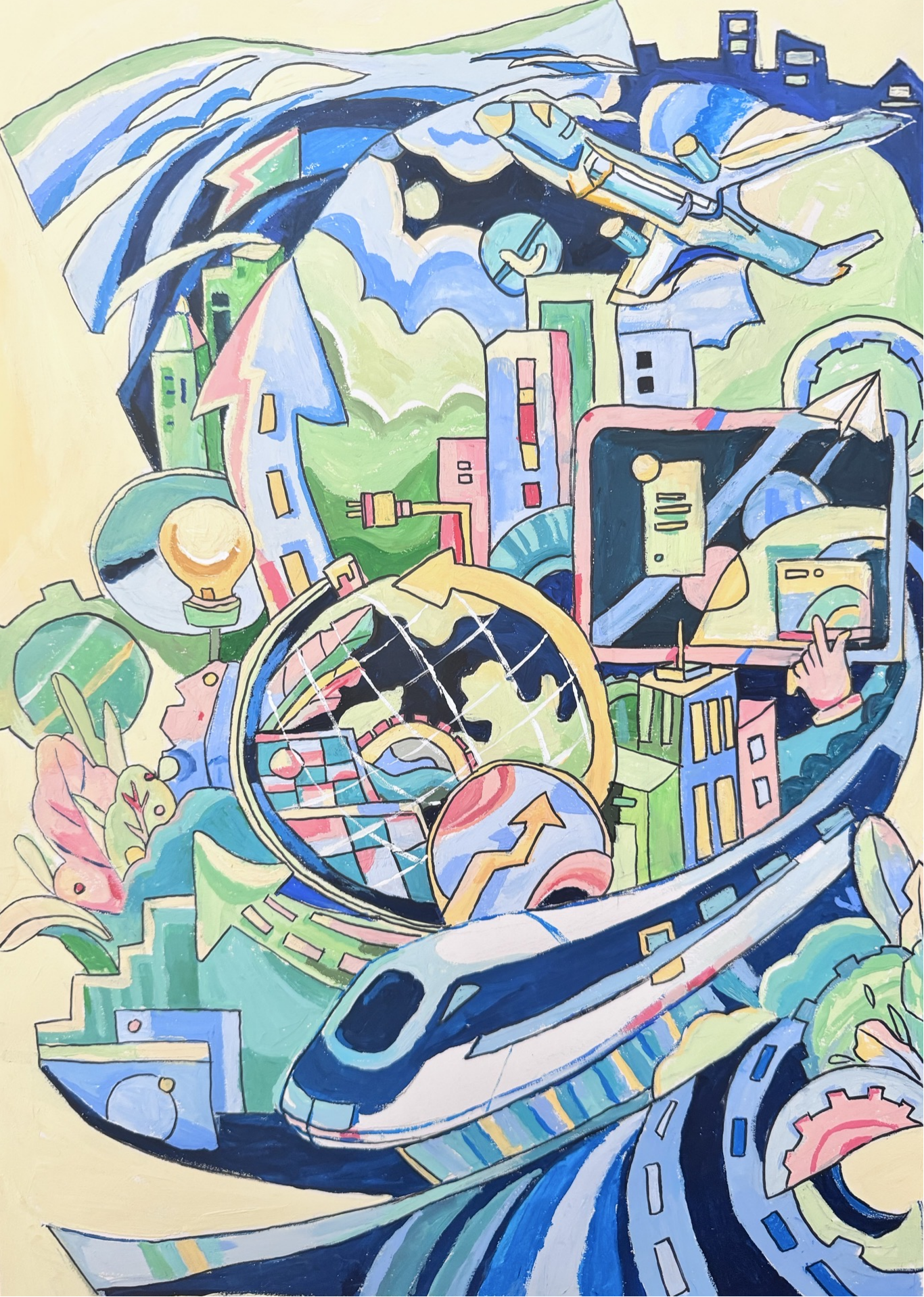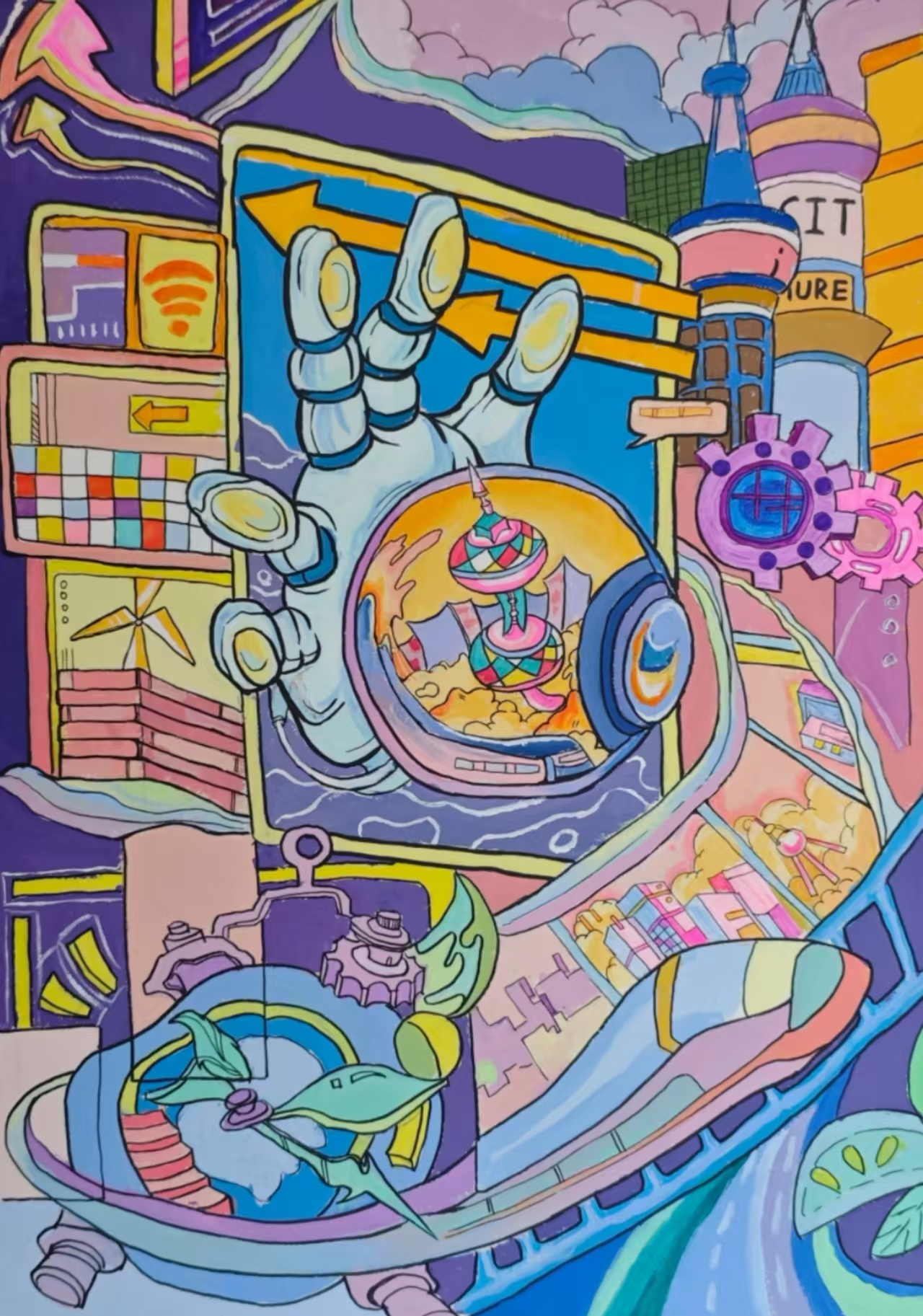 同学们围绕《未来科技》这一主题,在科技与生活、未来社区、环保可持续性、航天航空、共享经济、人工智能、万物智联、生命科学等方面开展创想。在色彩意向归纳层面,员工运用数字蓝、金属银、荧光绿等具有科技象征性的色系建立视觉符号系统,通过提取太空探索、深海工程等科技场景的典型色谱,将深空紫与数据流的暖色红橙碰撞重组,构建出兼具理性与幻想的色彩语义场景。装饰性归纳作品则采用几何色块拼接、渐变色等手法,将复杂的科技意象提炼为简约的视觉模块。作品突出未来科技及城市共生的状态,通过精确控制的色相渐变,空间环境营造,并进行对比与调和的探索,同学们大胆尝试强对比色的运用,在面积上进行合理构成布局,使视觉冲突中达成微妙平衡。从整体创作的作品来看,印证了科技主题下色彩表现的无限可能,同学们的自由创作和个性发挥较好,也可见同学们既有突破常规的勇气,也能遵循色彩科学的内在规律。