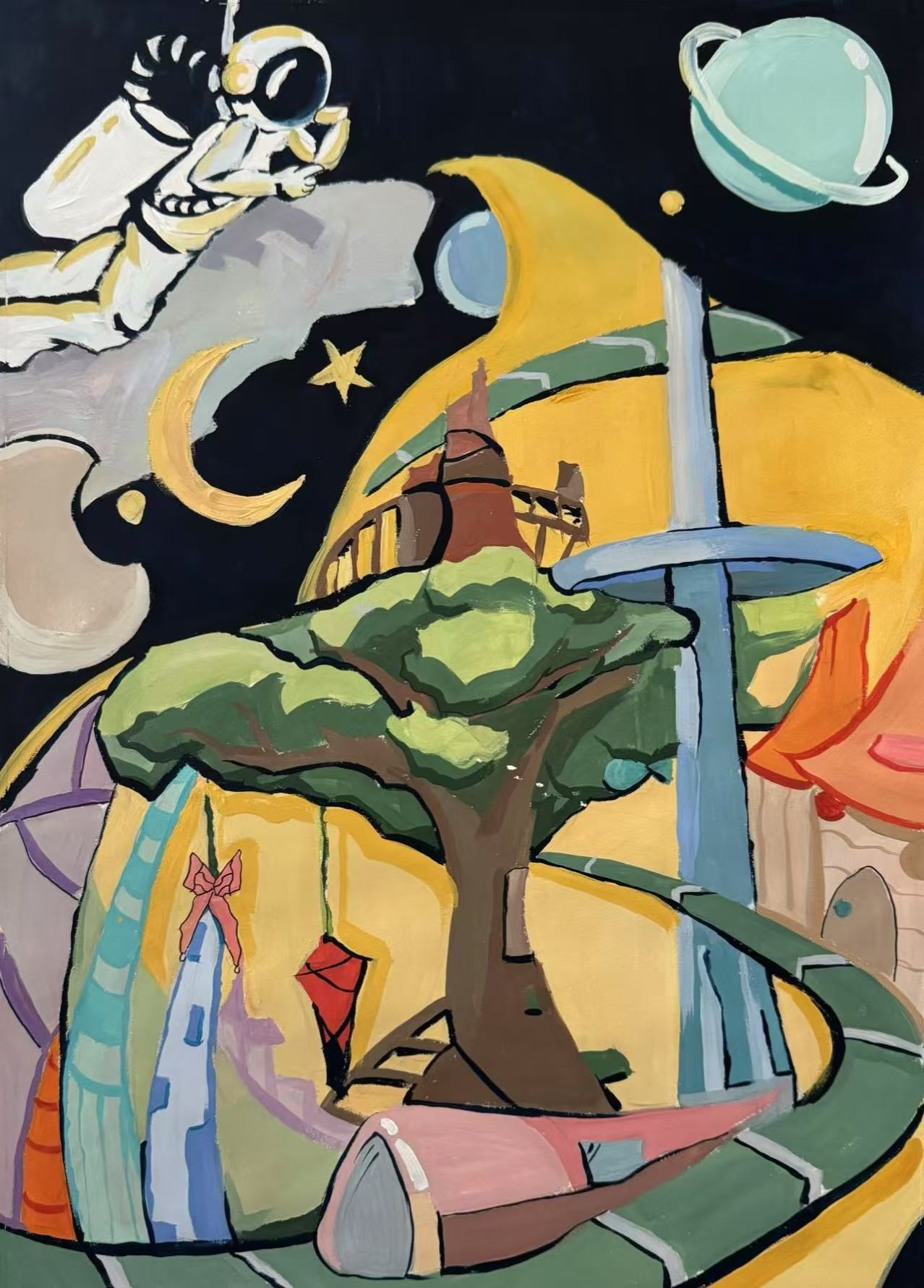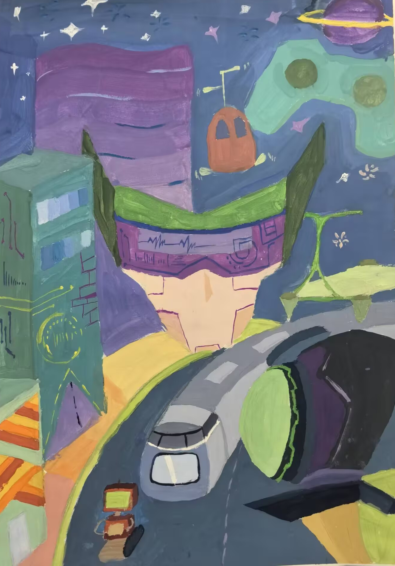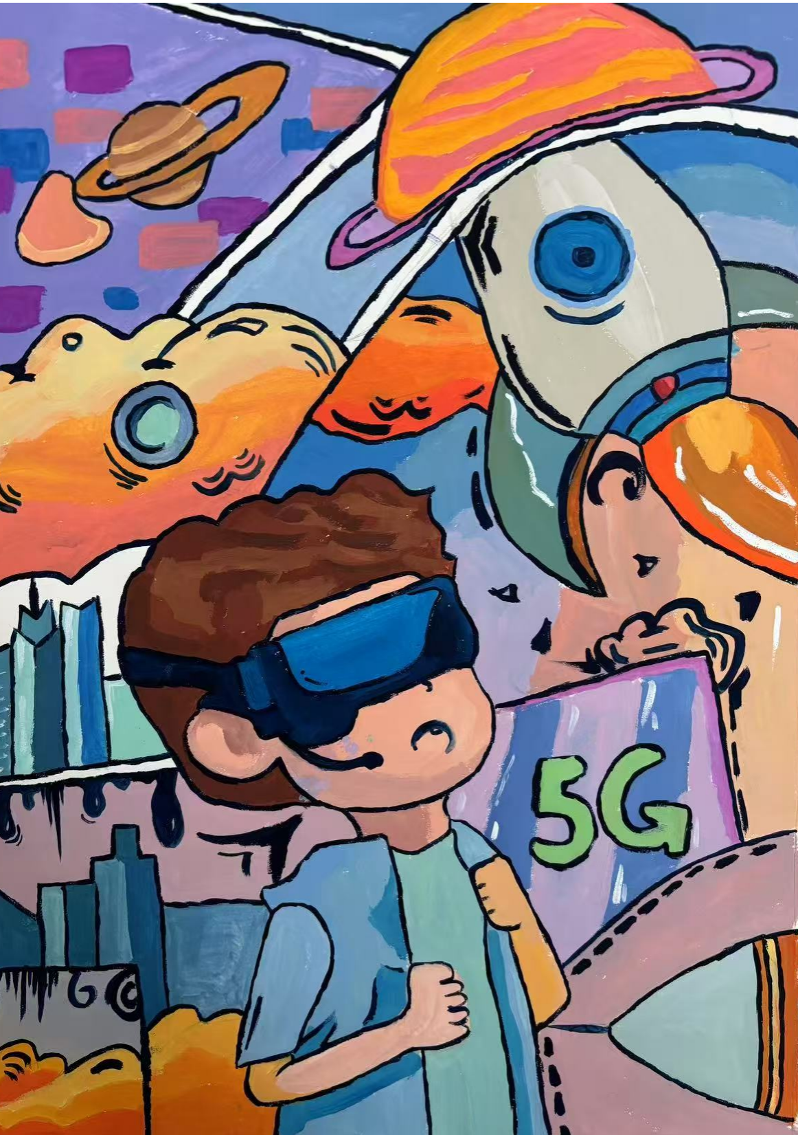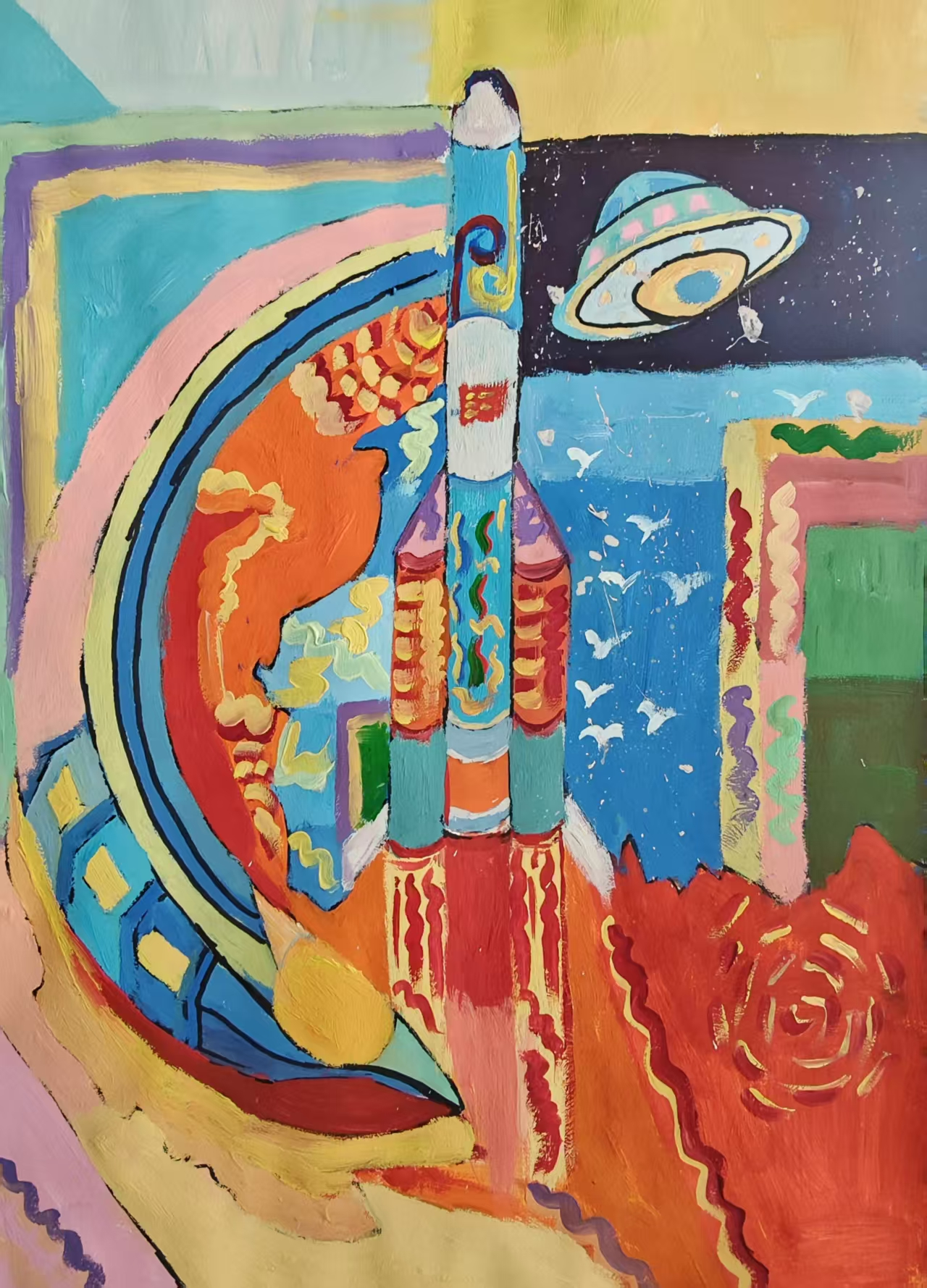 同学们围绕《未来科技》这一主题,在科技与生活、未来社区、环保可持续性、航天航空、共享经济、人工智能、万物智联、生命科学等方面开展创想。在色彩意向归纳层面,员工运用数字蓝、金属银、荧光绿等具有科技象征性的色系建立视觉符号系统,通过提取太空探索、深海工程等科技场景的典型色谱,将深空紫与数据流的暖色红橙碰撞重组,构建出兼具理性与幻想的色彩语义场景。装饰性归纳作品则采用几何色块拼接、渐变色等手法,将复杂的科技意象提炼为简约的视觉模块。作品突出未来科技及城市共生的状态,通过精确控制的色相渐变,空间环境营造,并进行对比与调和的探索,同学们大胆尝试强对比色的运用,在面积上进行合理构成布局,使视觉冲突中达成微妙平衡。从整体创作的作品来看,印证了科技主题下色彩表现的无限可能,同学们的自由创作和个性发挥较好,也可见同学们既有突破常规的勇气,也能遵循色彩科学的内在规律。