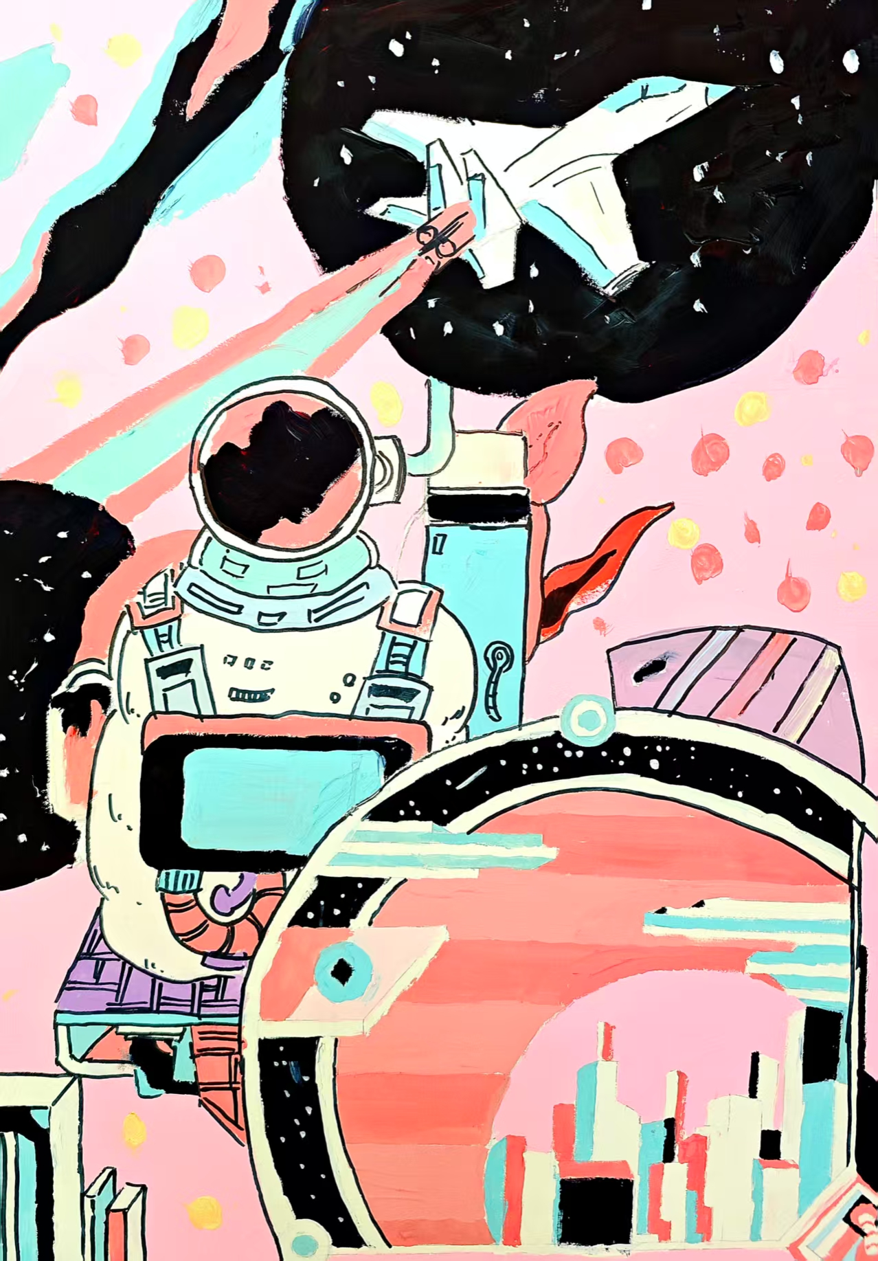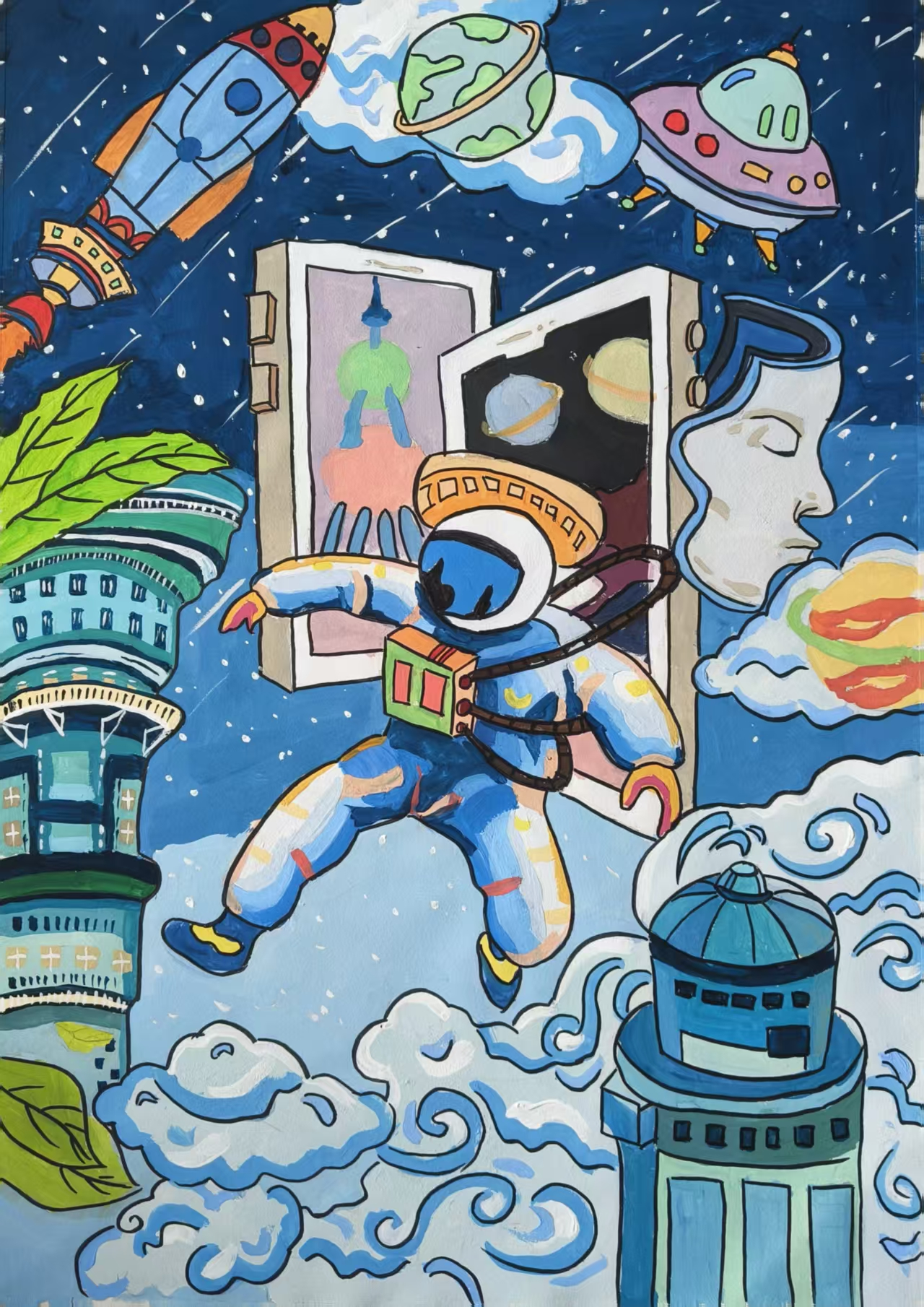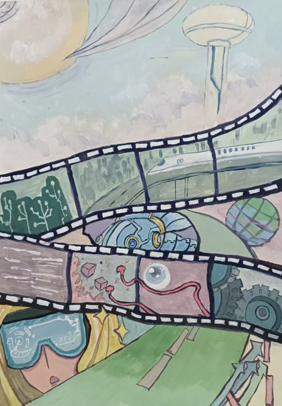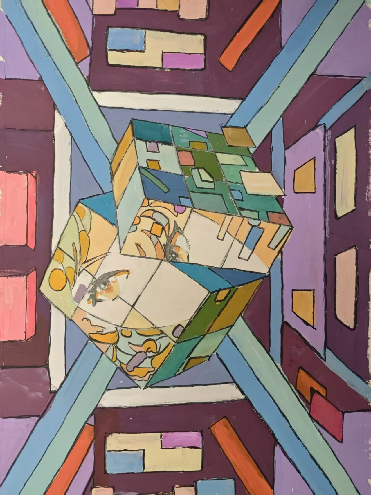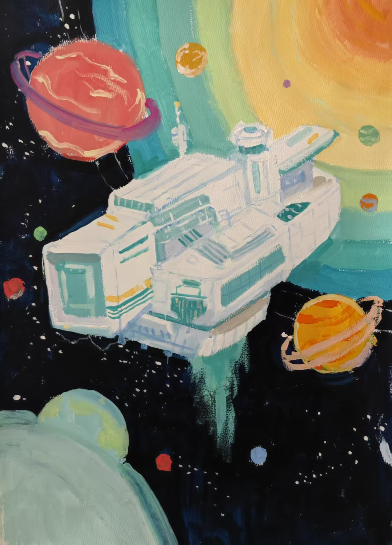 同学们围绕《未来科技》这一主题,在科技与生活、未来社区、环保可持续性、航天航空、共享经济、人工智能、万物智联、生命科学等方面开展创想。在色彩意向归纳层面,员工运用数字蓝、金属银、荧光绿等具有科技象征性的色系建立视觉符号系统,通过提取太空探索、深海工程等科技场景的典型色谱,将深空紫与数据流的暖色红橙碰撞重组,构建出兼具理性与幻想的色彩语义场景。装饰性归纳作品则采用几何色块拼接、渐变色等手法,将复杂的科技意象提炼为简约的视觉模块。作品突出未来科技及城市共生的状态,通过精确控制的色相渐变,空间环境营造,并进行对比与调和的探索,同学们大胆尝试强对比色的运用,在面积上进行合理构成布局,使视觉冲突中达成微妙平衡。从整体创作的作品来看,印证了科技主题下色彩表现的无限可能,同学们的自由创作和个性发挥较好,也可见同学们既有突破常规的勇气,也能遵循色彩科学的内在规律。