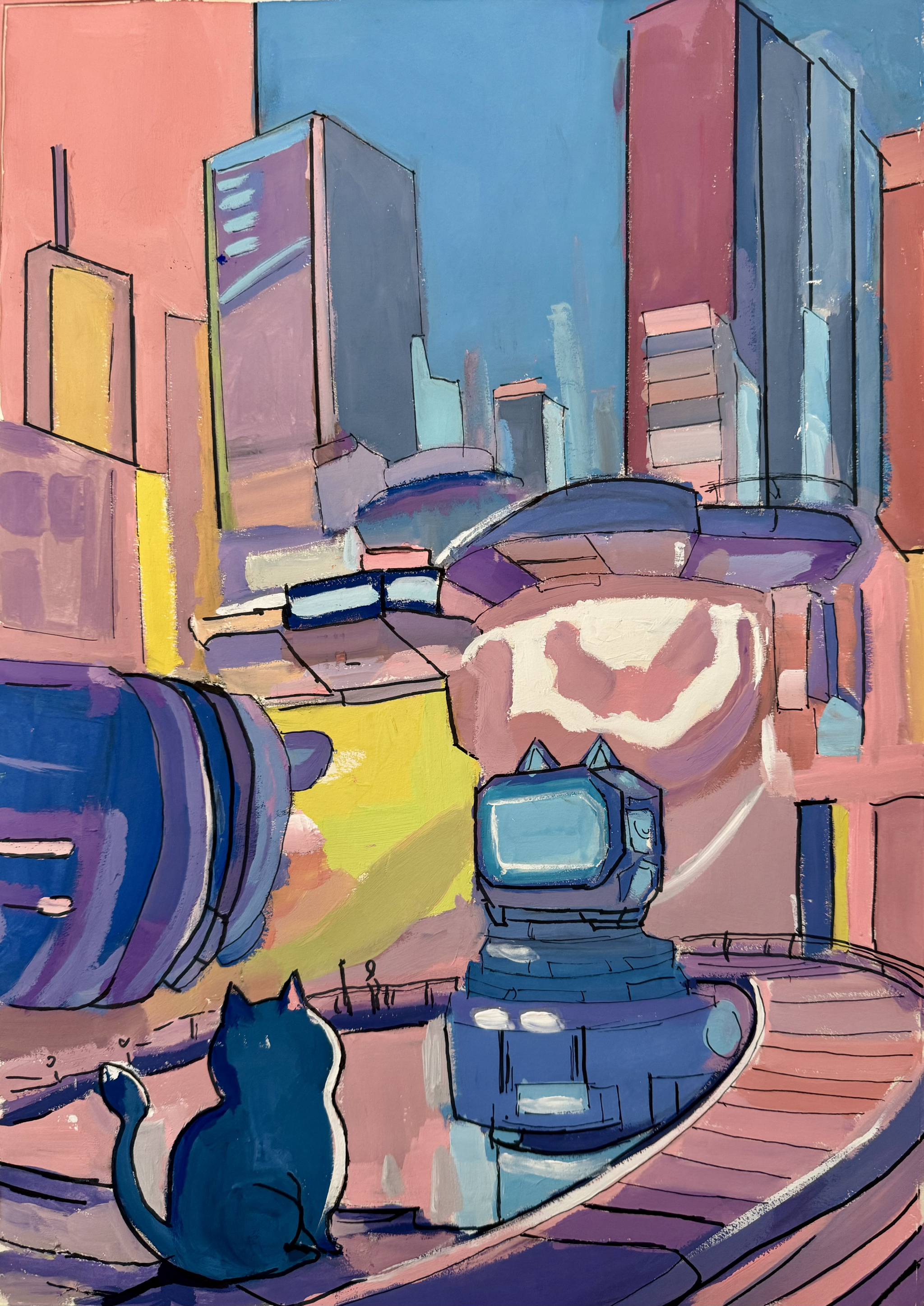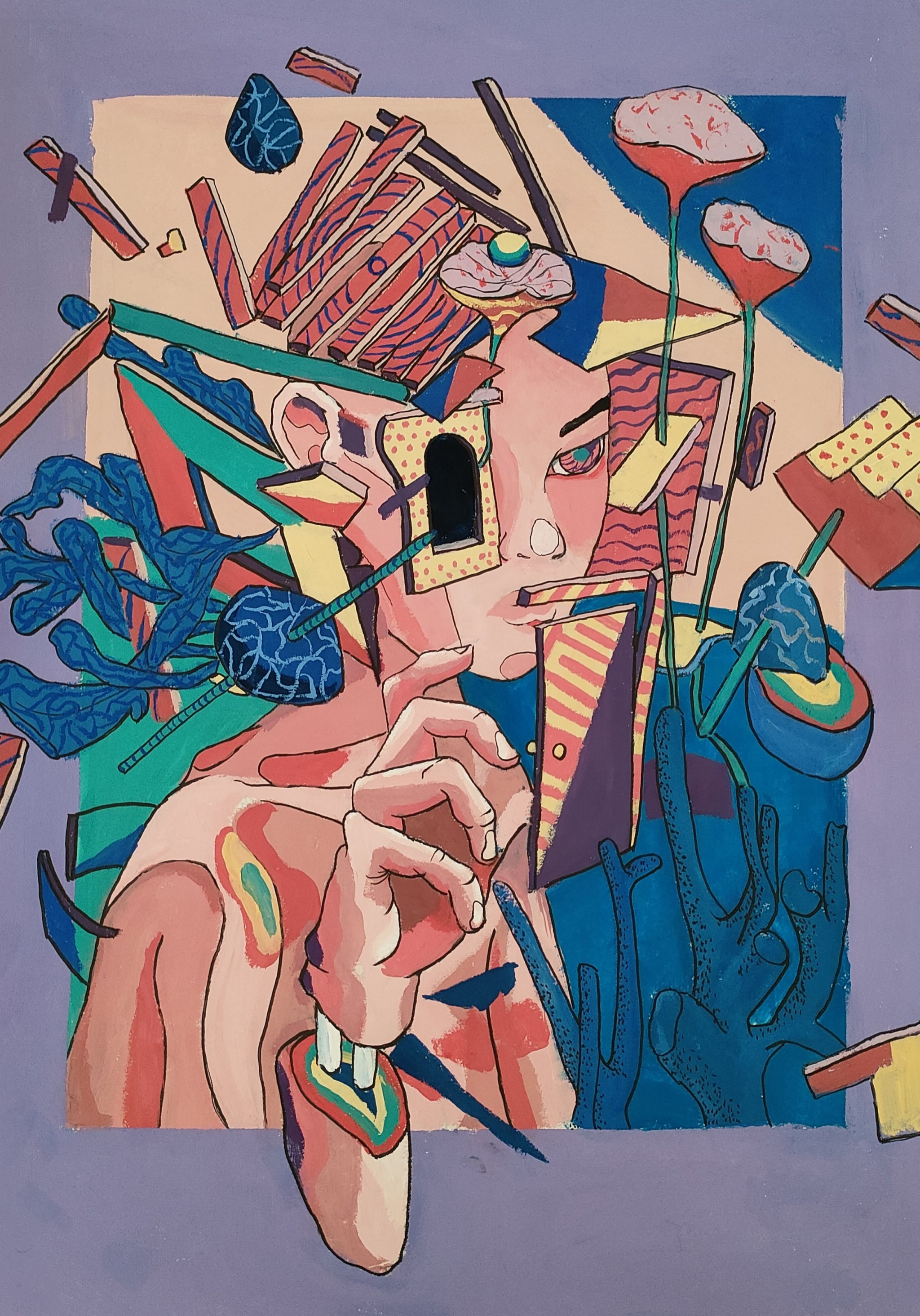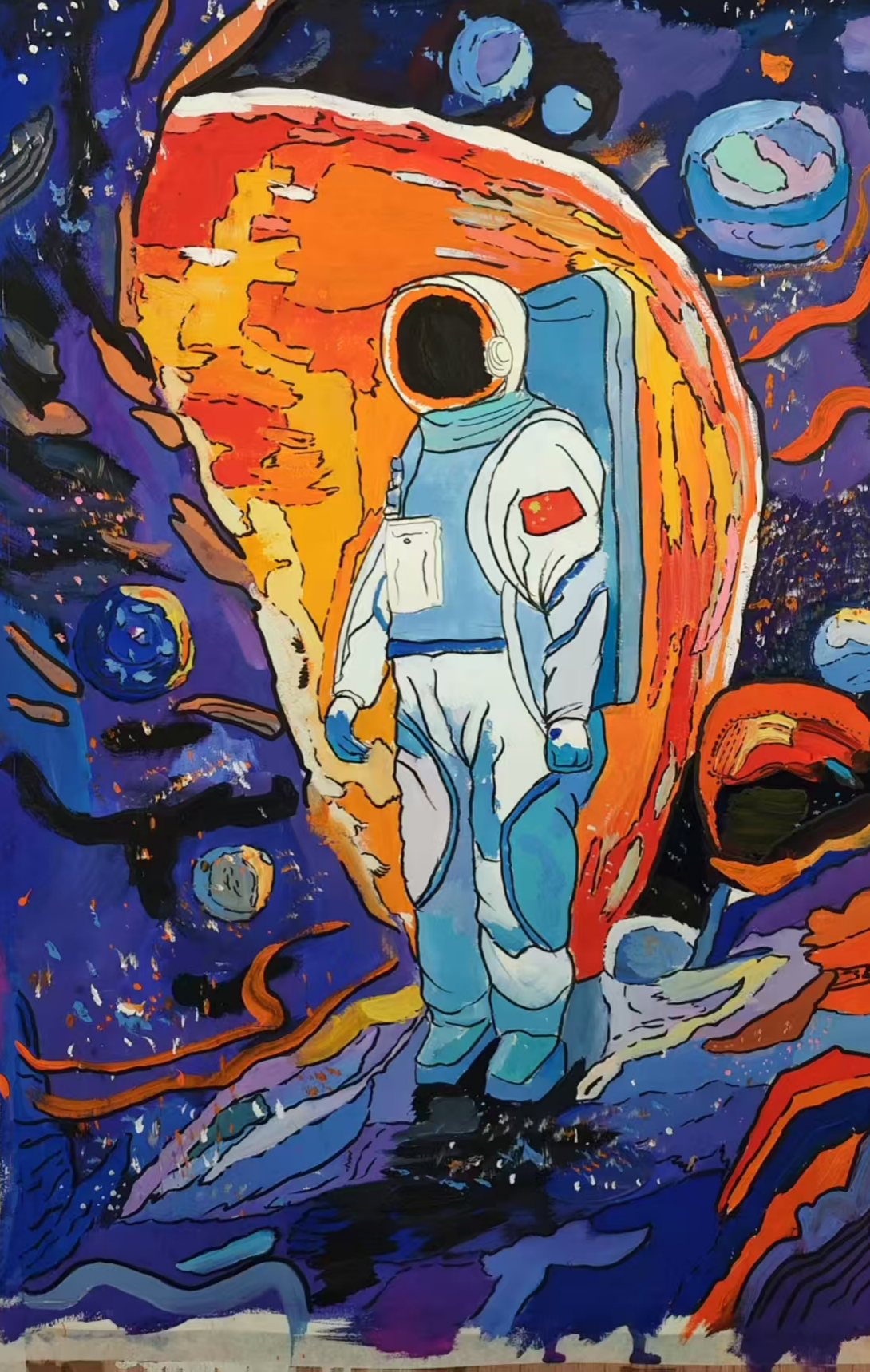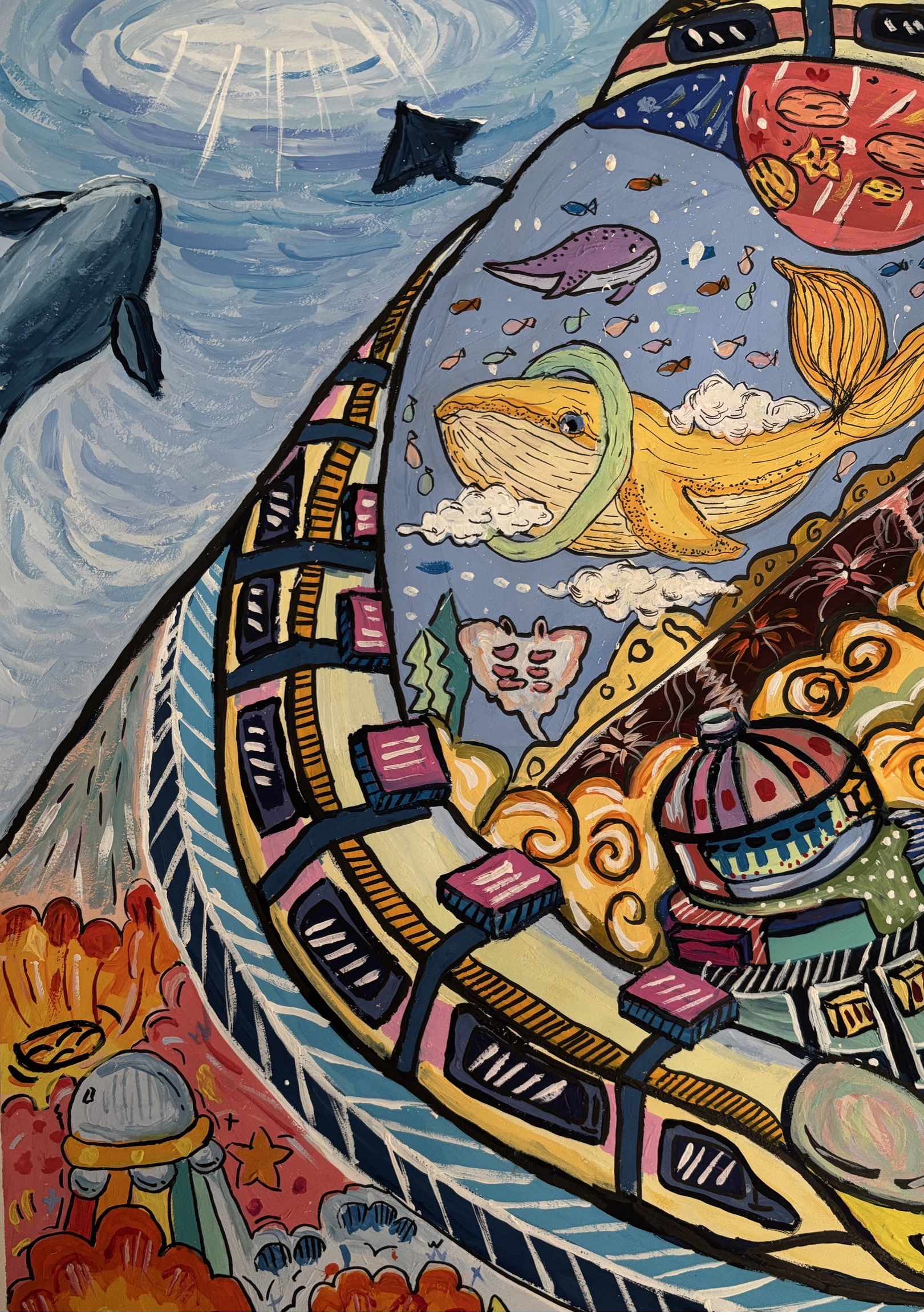 同学们围绕《未来科技》这一主题,在科技与生活、未来社区、环保可持续性、航天航空、共享经济、人工智能、万物智联、生命科学等方面开展创想。在色彩意向归纳层面,员工运用数字蓝、金属银、荧光绿等具有科技象征性的色系建立视觉符号系统,通过提取太空探索、深海工程等科技场景的典型色谱,将深空紫与数据流的暖色红橙碰撞重组,构建出兼具理性与幻想的色彩语义场景。装饰性归纳作品则采用几何色块拼接、渐变色等手法,将复杂的科技意象提炼为简约的视觉模块。作品突出未来科技及城市共生的状态,通过精确控制的色相渐变,空间环境营造,并进行对比与调和的探索,同学们大胆尝试强对比色的运用,在面积上进行合理构成布局,使视觉冲突中达成微妙平衡。从整体创作的作品来看,印证了科技主题下色彩表现的无限可能,同学们的自由创作和个性发挥较好,也可见同学们既有突破常规的勇气,也能遵循色彩科学的内在规律。