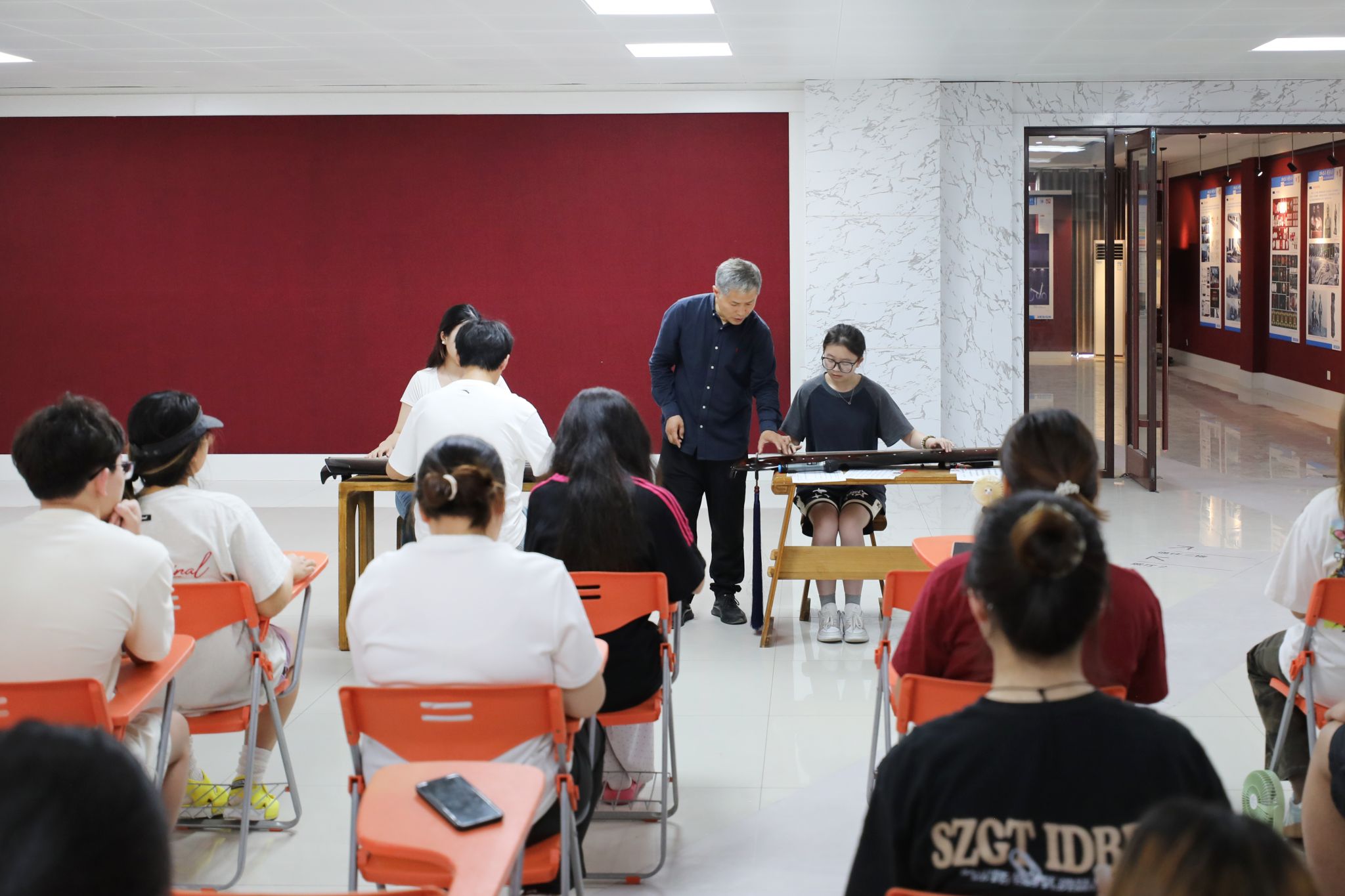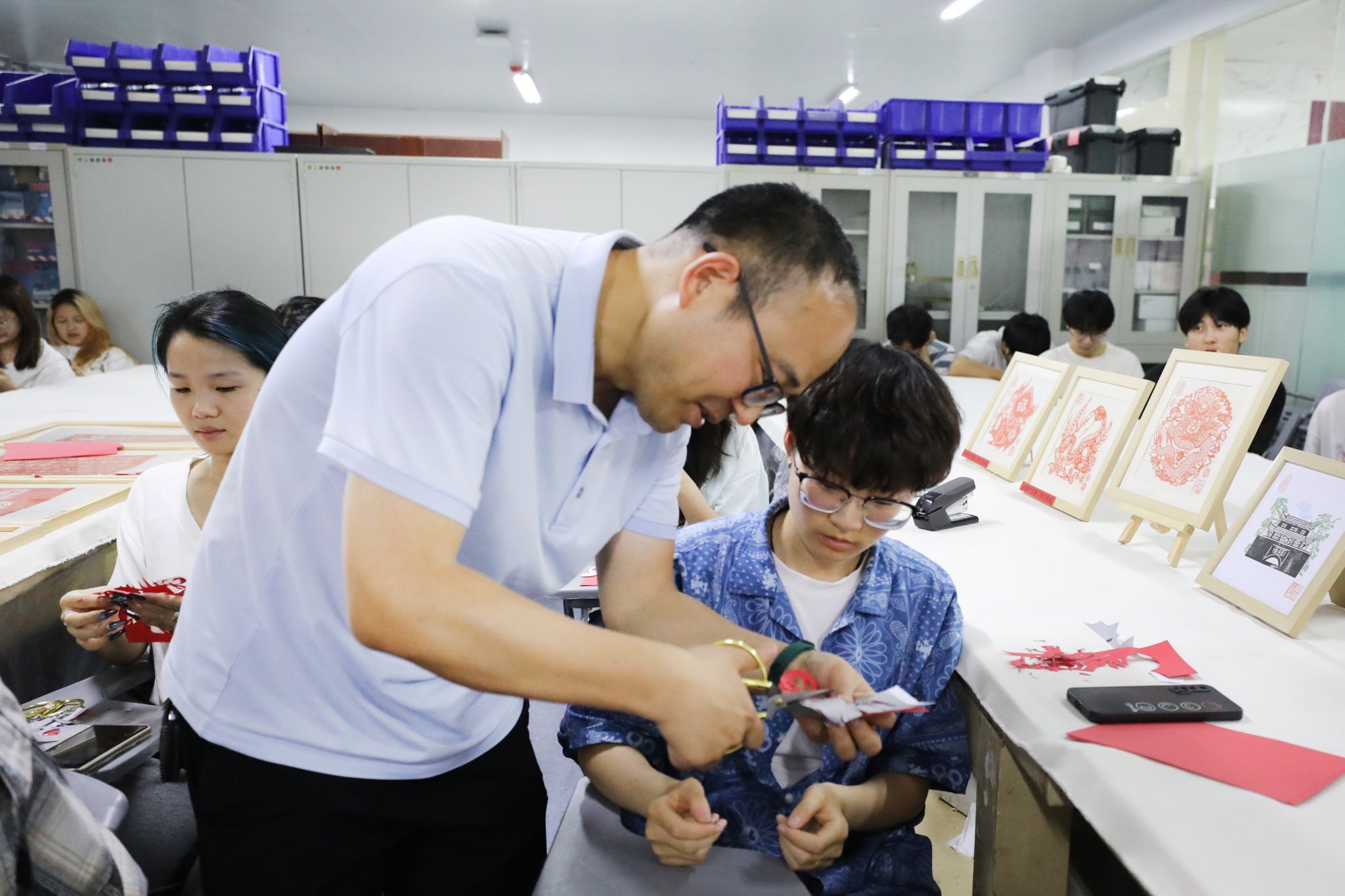 非遗文化展示环节,淮安古琴项目传承人张晓华现场演奏古琴经典曲目,讲解古琴的历史与特点,指导公司员工体验古琴演奏技艺;淮安剪纸传承人王聿鹏向员工发放剪纸工具和材料,现场展示剪纸作品,讲解剪纸技艺基本知识,指导员工完成剪纸作品。同学们在动手操作中深入体会非遗文化魅力与精神。参会嘉宾还参观了公司一楼办学成果展展厅。