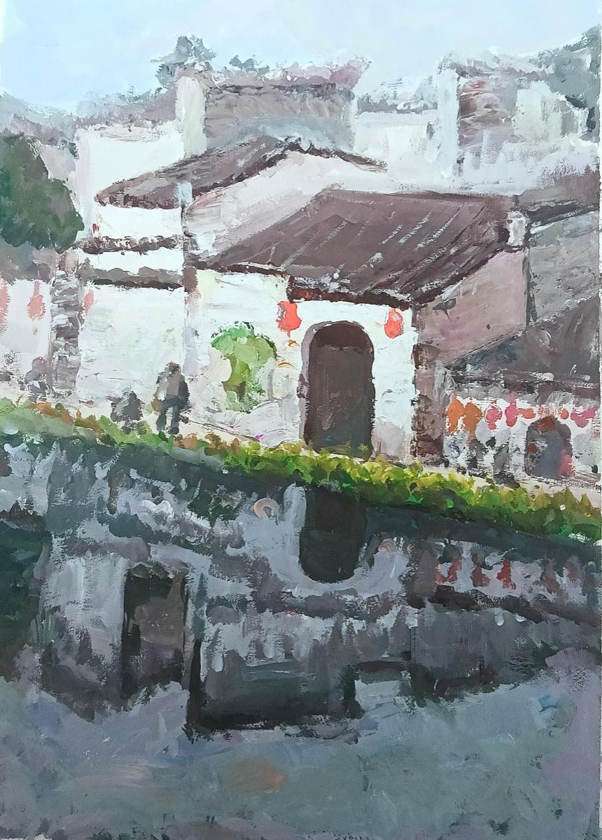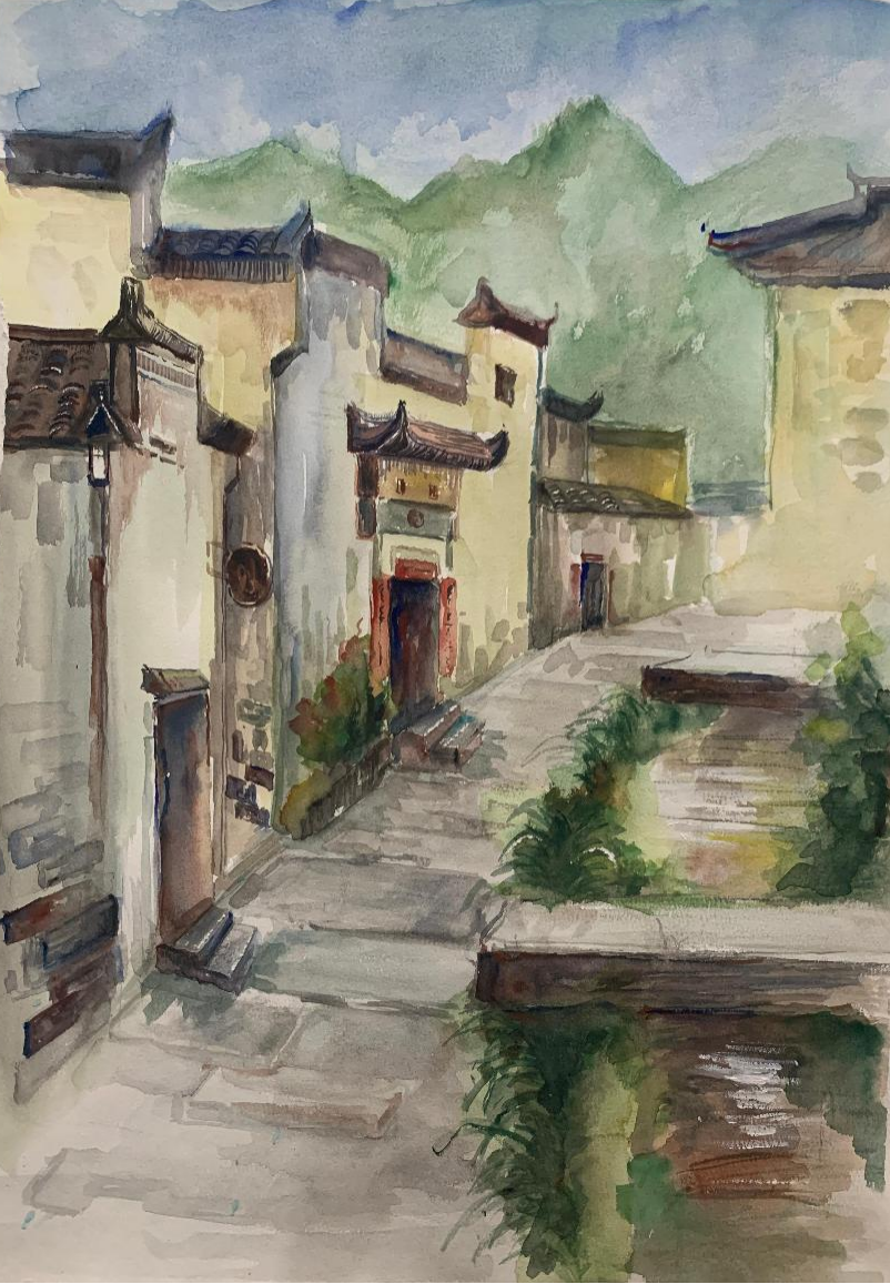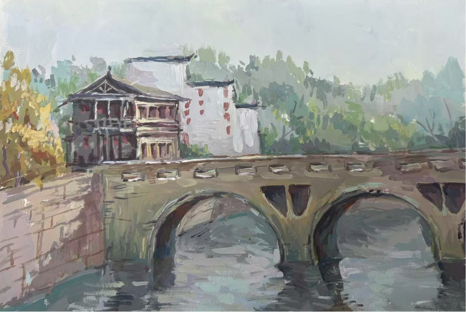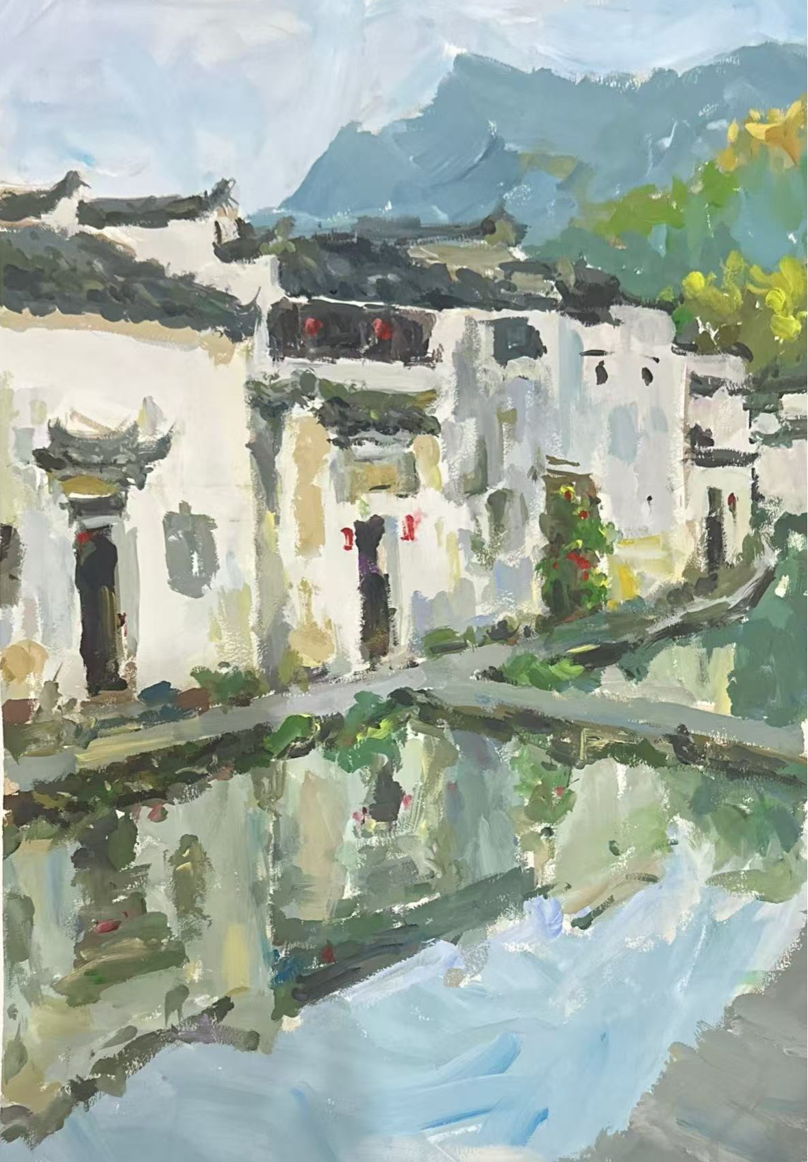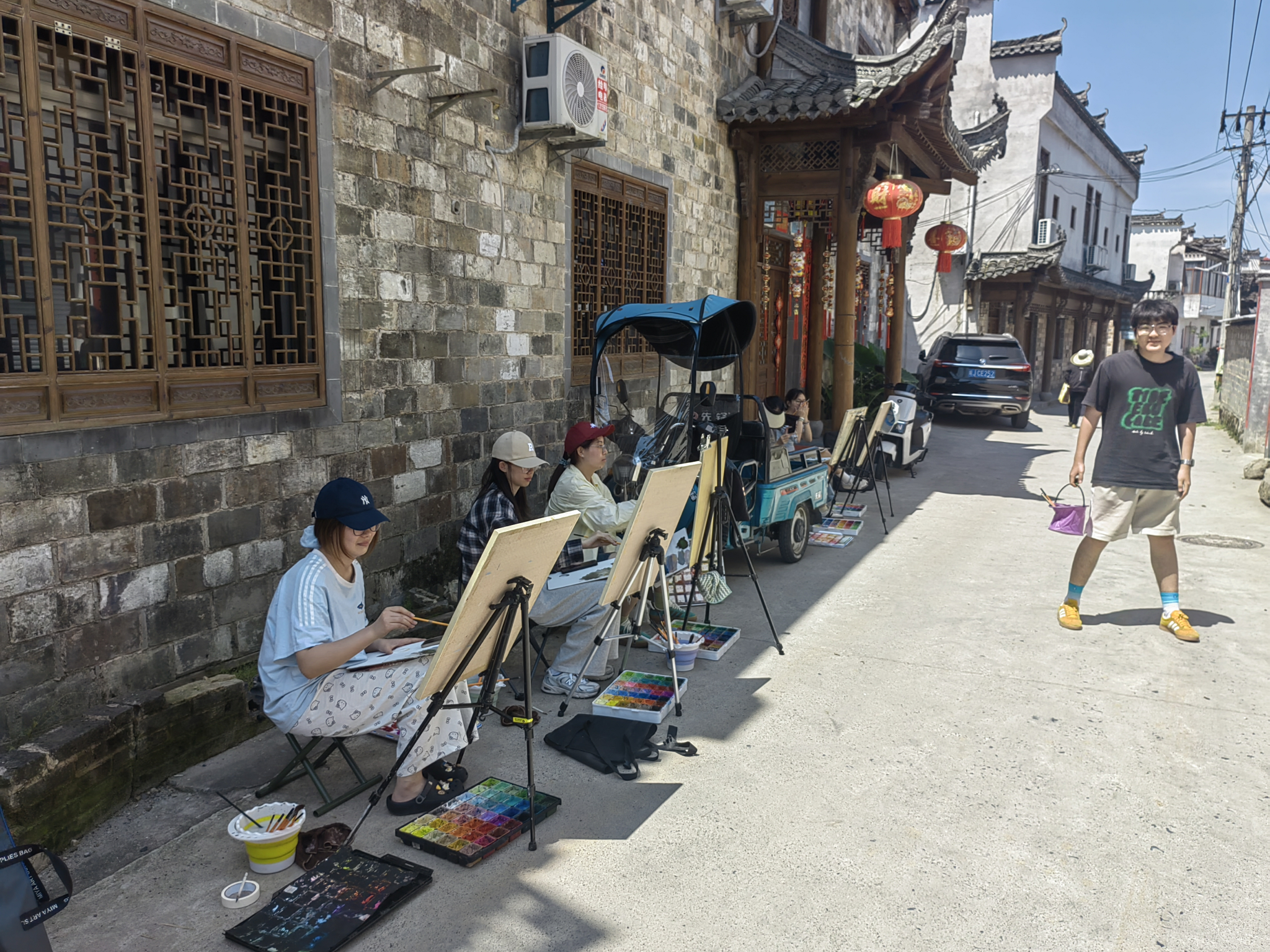 宏村位于安徽南部黟县,2000年被联合国教科文组织列入世界文化遗产名录。白墙黑瓦的宏村建筑是徽派建筑的代表,与周围青山绿水的自然环境相得益彰。宏村有“中国画里乡村”的美誉,吸引了世界各地的游客前往。其周围的西递、屏山、秀里等景区和宏村构成了皖南文化群落,融人文自然景观于一体,成为全国艺术、设计专业考察、学习的重要目的地。此次写生,2023级产品设计专业的59名同学,在耳濡目染中体会了中国传统文化的博大精深,努力通过自己的画笔表现祖国的大好河山。