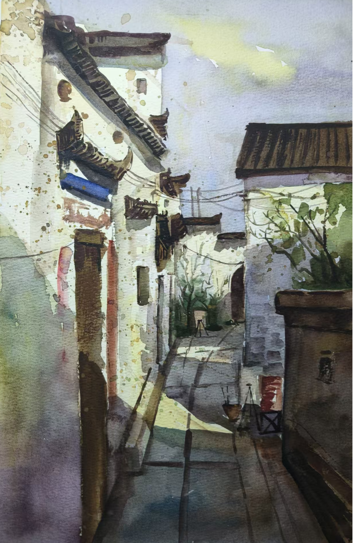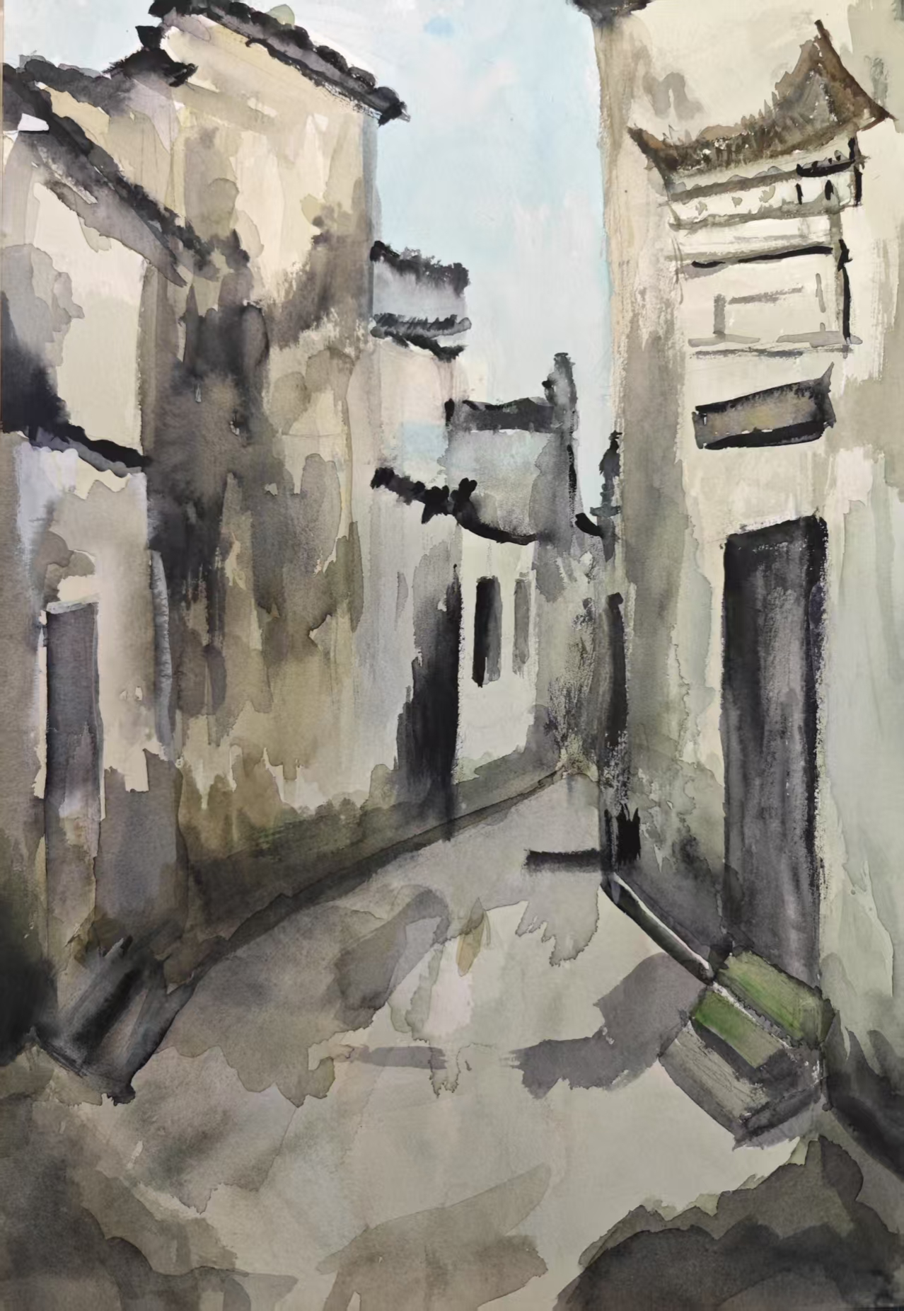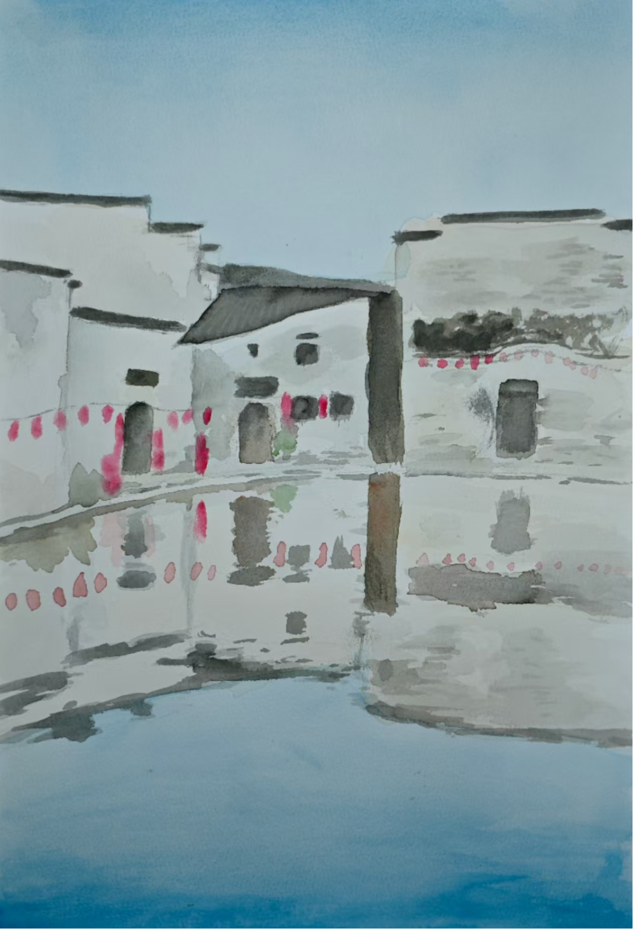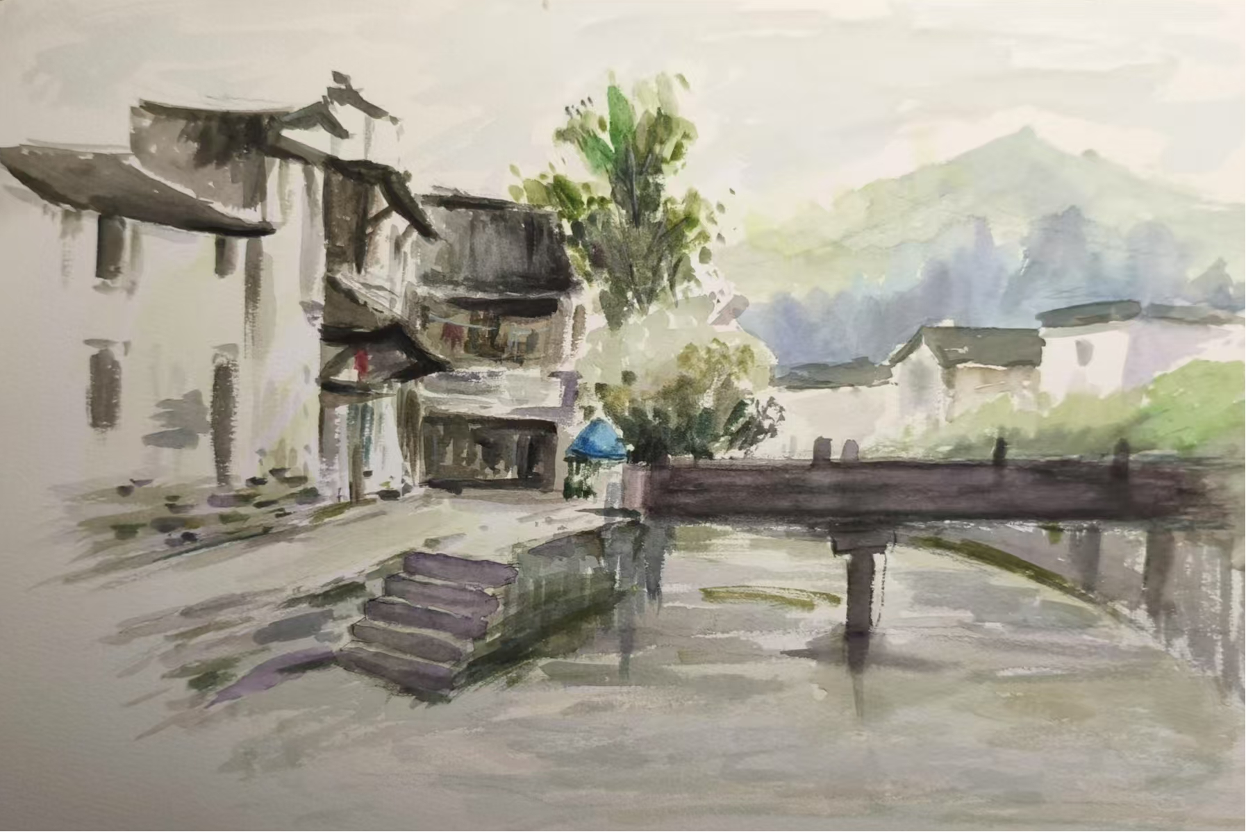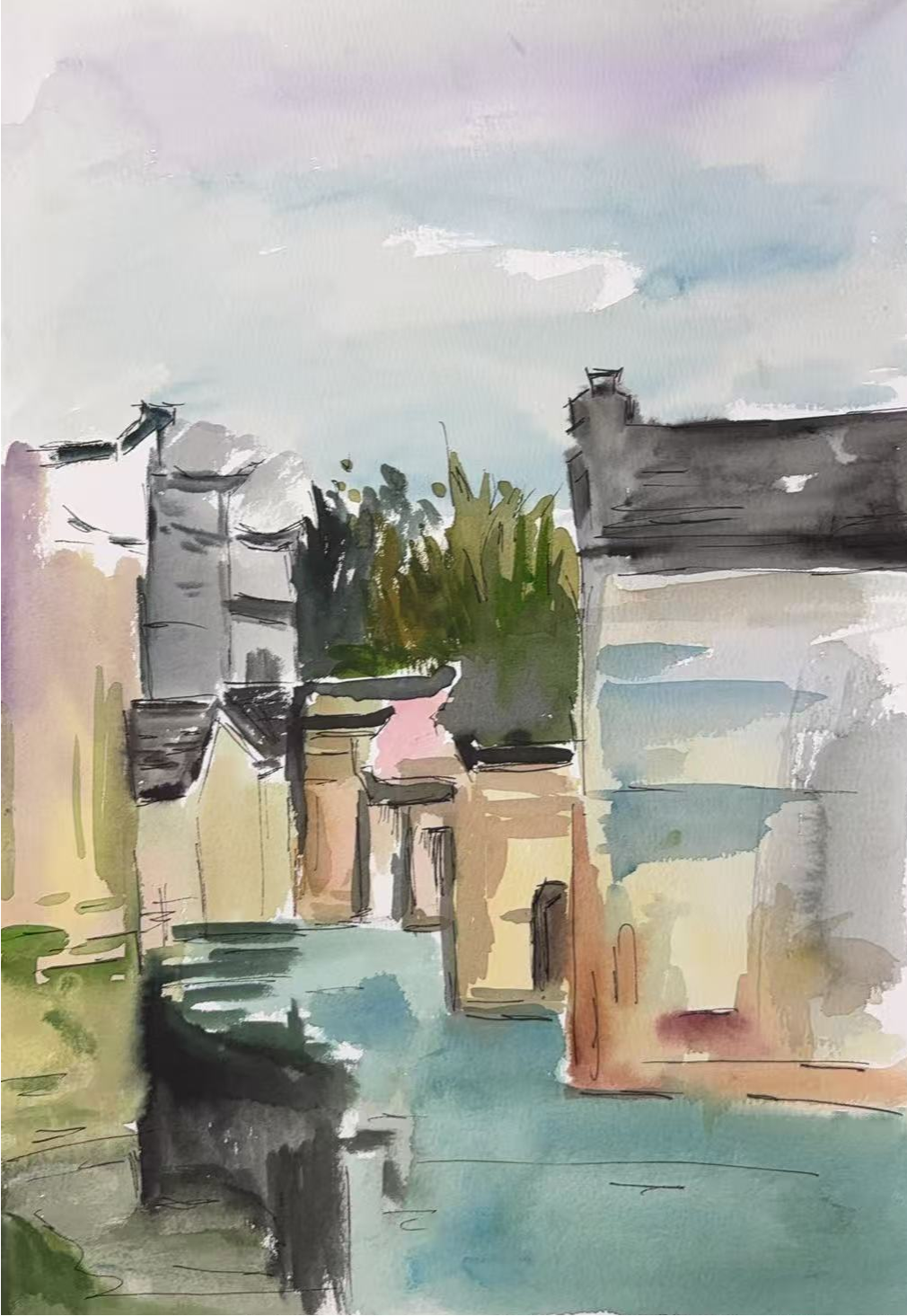 《风景写生》课程秉承“以自然为师,以生活为源”的教学理念,聚焦安徽屏山、宏村等徽州文化核心场域,开展了为期两周的驻地写生实践。通过田野调查、户外写生与在地文化研究的多维联动,员工在自然景观与人文肌理的碰撞中,完成了从技法锤炼到观念深化的蜕变。本次《风景写生》课程的实习员工系环境设计专业,同学们走进徽州,从专业视角出发,参观和考察了多个徽州古村落。宏村的月沼水系与南屏的祠堂群落,为教学提供了天然的“露天课堂”,马头墙的层叠韵律、青石板的岁月包浆、门楣砖雕的儒家隐喻,构成了视觉语言的“文化密码库”,了解水口的设置与营造,徽州居民利用山脉转折、流水环绕,在水流出入口处广植树木、修桥筑堤、造亭建坊等,体会智慧的先民们中国式的村落规划,兼顾了生活美学、水资源利用和防御外敌的超强功能,让员工们了解更多环境专业知识。课程首日安排建筑观摩与影像记录,引导员工以人类学视角观察村落空间布局,理解“天人合一”的营建智慧,感受堪舆学中“山环水绕、藏风聚气”的设计风格。员工将榫卯结构、砖雕纹样、石雕造型转化为速写本中的线性实验,为后续创作注入在地性基因。本次色彩写生主要以水彩为媒介,进行水彩的风景技法训练。前三天主要进行田野调查和感官体验,训练选景、构图和快速捕捉的能力,闭眼聆听溪流穿巷的节奏,触摸夯土墙的颗粒质感,速写时强化动态线条表现风的轨迹,每日水彩画注重光影和色块的构思,员工需在2小时内完成8开尺幅的场景速写或水彩,强制脱离细节描摹,专注整体气韵捕捉。教学难点是,户外环境条件受限,员工走出课堂在室外环境中很难选景,且受光源和天气影响,村落密集的巷道与错落的屋檐,为透视比较带来不晓得难度,员工多采用“游观式”观察法,学会用脚步丈量空间,并将徽州烟雨天的灰调色谱归纳总结,鉴徽墨“焦、浓、重、淡、清”五色体系,通过水量控制表现黛瓦粉墙的氤氲质感。