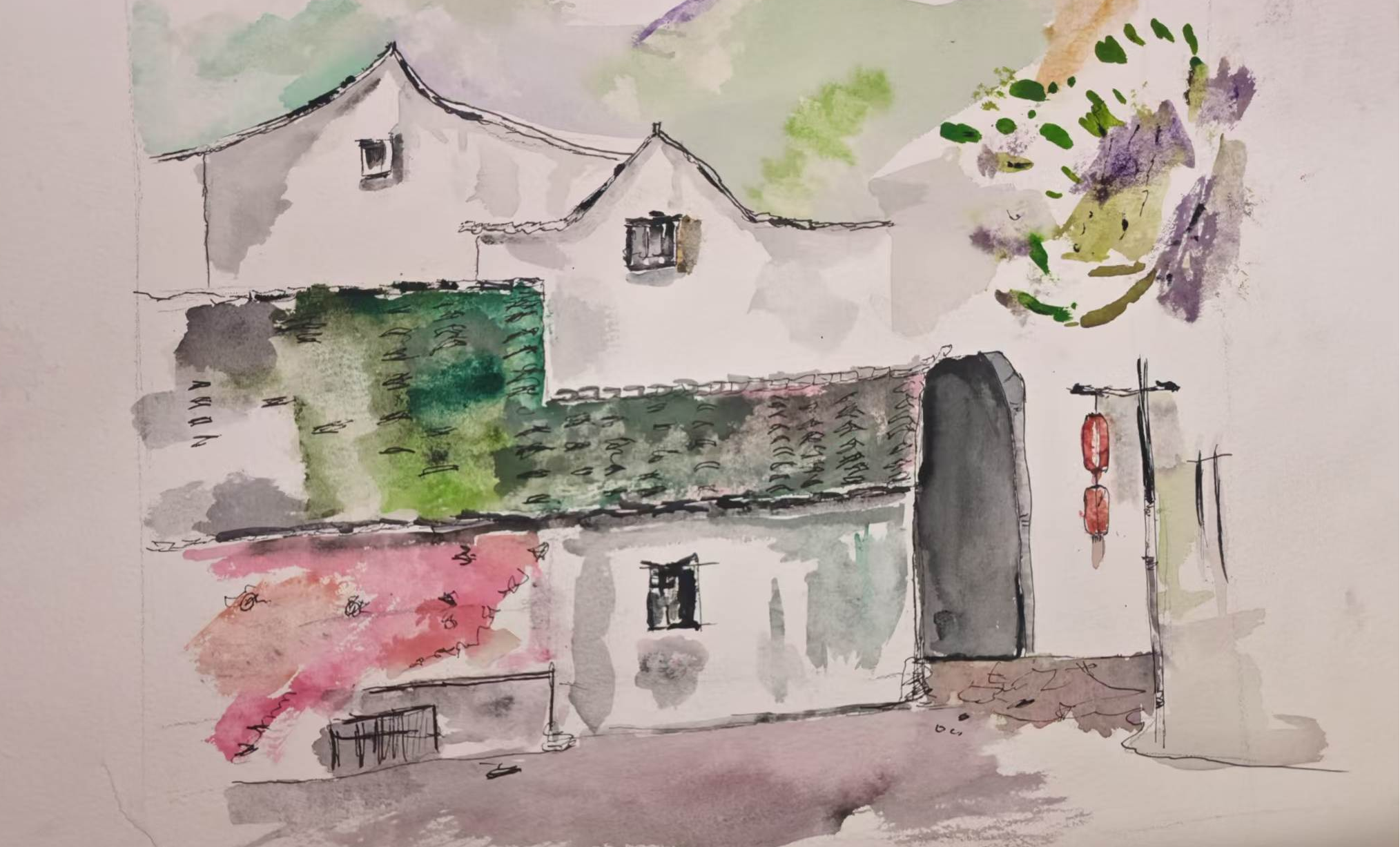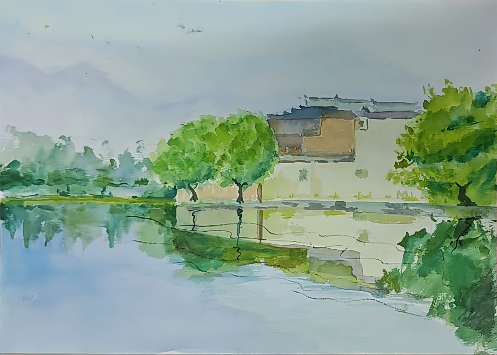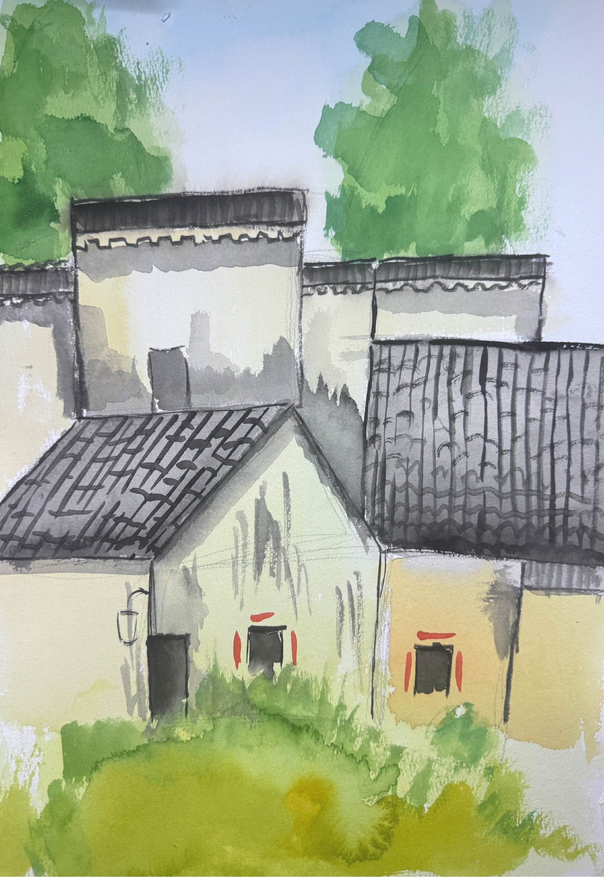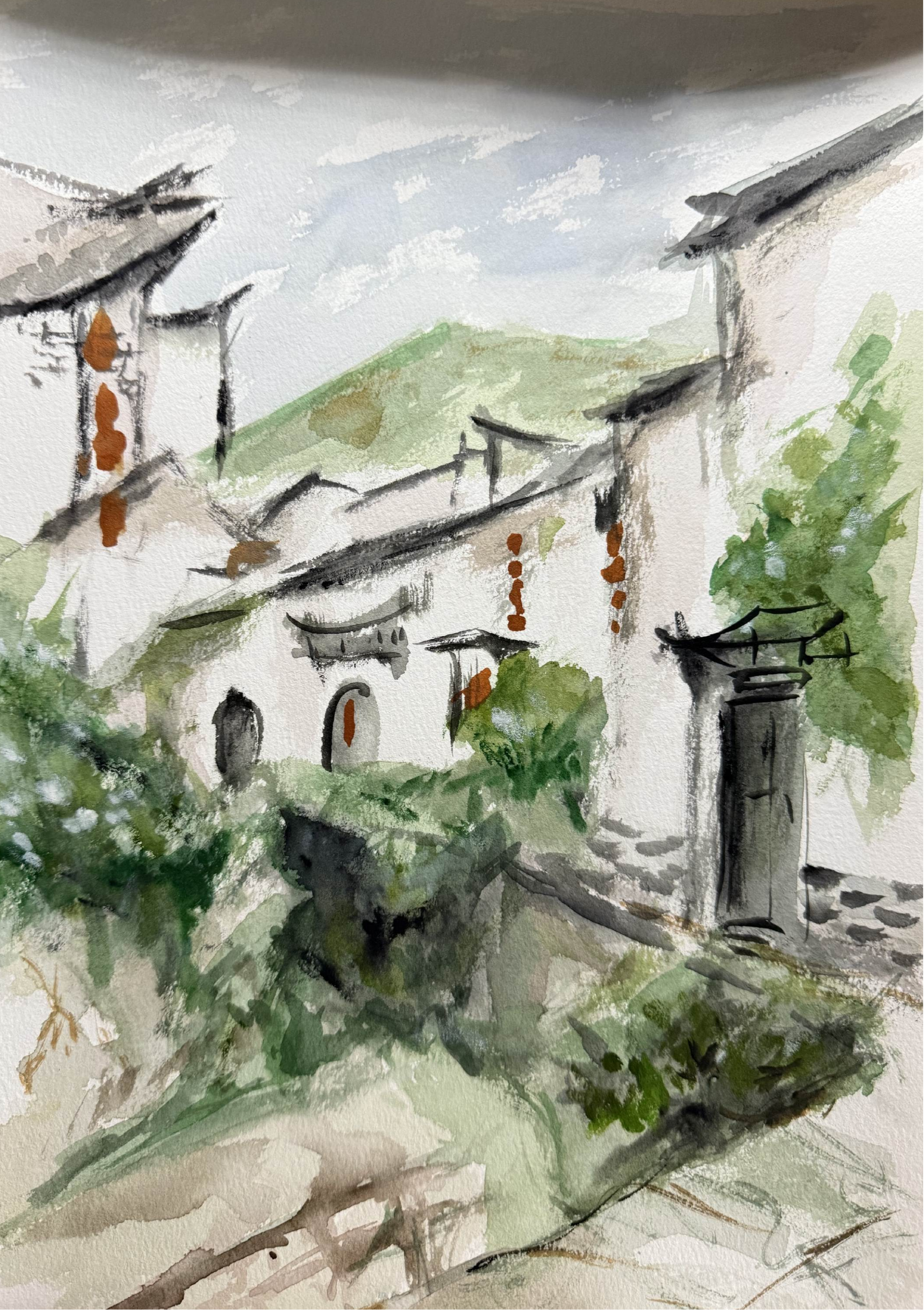 《风景写生》课程秉承“以自然为师,以生活为源”的教学理念,聚焦安徽屏山、宏村等徽州文化核心场域,开展了为期两周的驻地写生实践。通过田野调查、户外写生与在地文化研究的多维联动,员工在自然景观与人文肌理的碰撞中,完成了从技法锤炼到观念深化的蜕变。本次《风景写生》课程的实习员工系环境设计专业,同学们走进徽州,从专业视角出发,参观和考察了多个徽州古村落。宏村的月沼水系与南屏的祠堂群落,为教学提供了天然的“露天课堂”,马头墙的层叠韵律、青石板的岁月包浆、门楣砖雕的儒家隐喻,构成了视觉语言的“文化密码库”,了解水口的设置与营造,徽州居民利用山脉转折、流水环绕,在水流出入口处广植树木、修桥筑堤、造亭建坊等,体会智慧的先民们中国式的村落规划,兼顾了生活美学、水资源利用和防御外敌的超强功能,让员工们了解更多环境专业知识。课程首日安排建筑观摩与影像记录,引导员工以人类学视角观察村落空间布局,理解“天人合一”的营建智慧,感受堪舆学中“山环水绕、藏风聚气”的设计风格。员工将榫卯结构、砖雕纹样、石雕造型转化为速写本中的线性实验,为后续创作注入在地性基因。本次色彩写生主要以水彩为媒介,进行水彩的风景技法训练。前三天主要进行田野调查和感官体验,训练选景、构图和快速捕捉的能力,闭眼聆听溪流穿巷的节奏,触摸夯土墙的颗粒质感,速写时强化动态线条表现风的轨迹,每日水彩画注重光影和色块的构思,员工需在2小时内完成8开尺幅的场景速写或水彩,强制脱离细节描摹,专注整体气韵捕捉。教学难点是,户外环境条件受限,员工走出课堂在室外环境中很难选景,且受光源和天气影响,村落密集的巷道与错落的屋檐,为透视比较带来不晓得难度,员工多采用“游观式”观察法,学会用脚步丈量空间,并将徽州烟雨天的灰调色谱归纳总结,鉴徽墨“焦、浓、重、淡、清”五色体系,通过水量控制表现黛瓦粉墙的氤氲质感。
