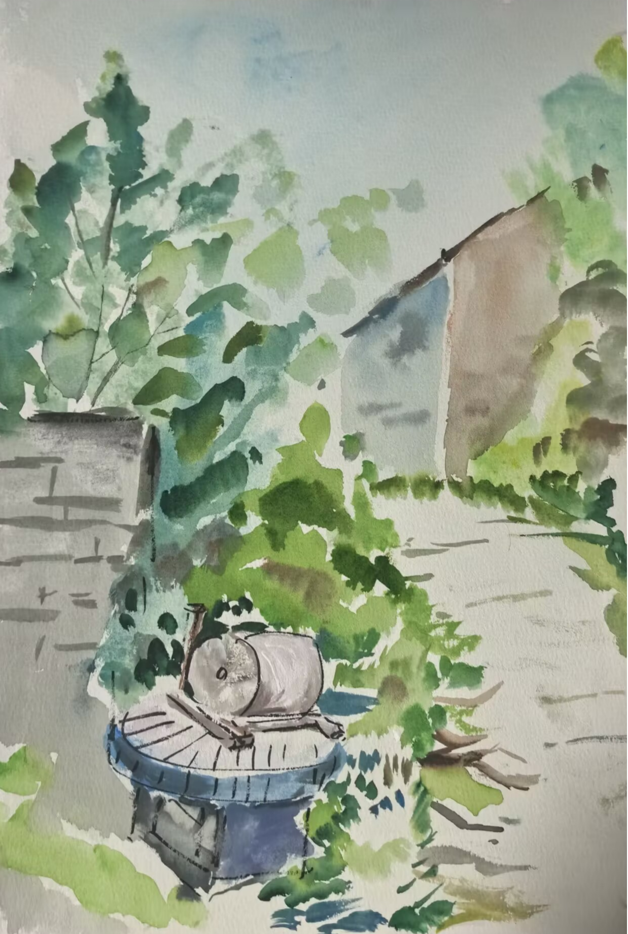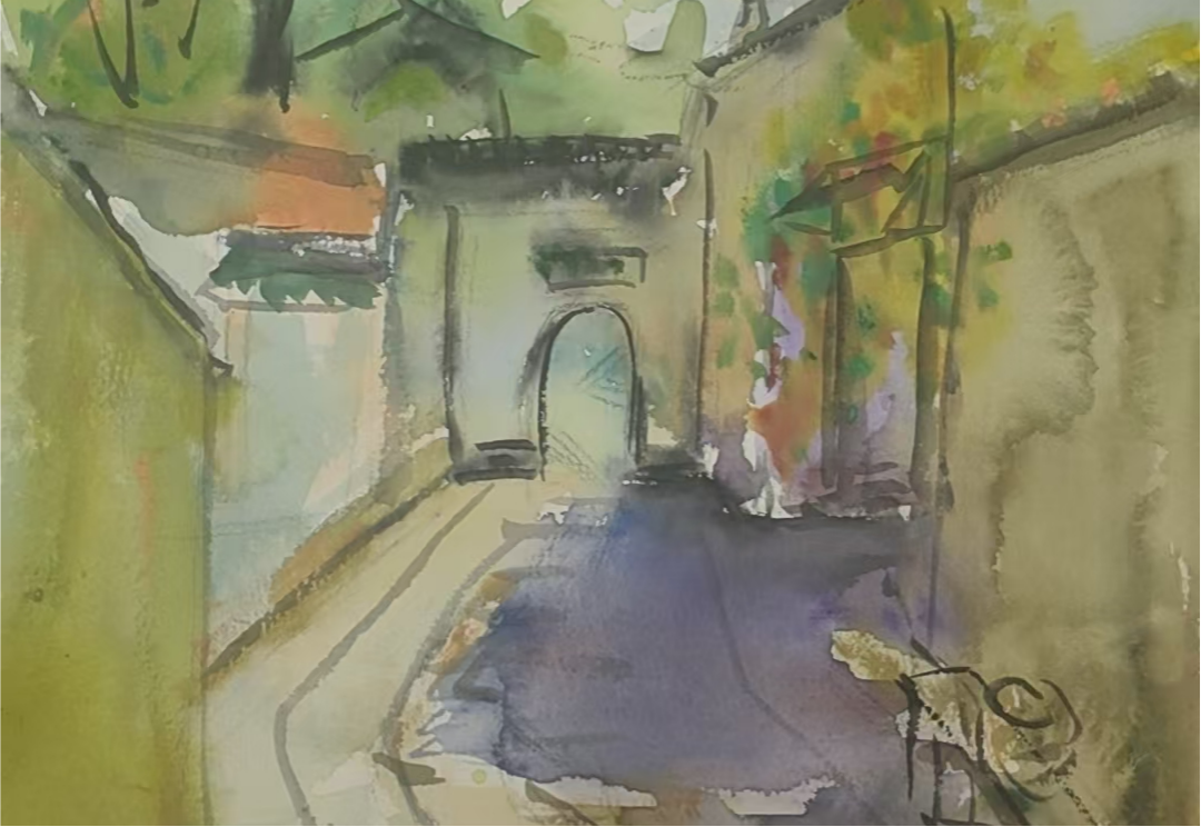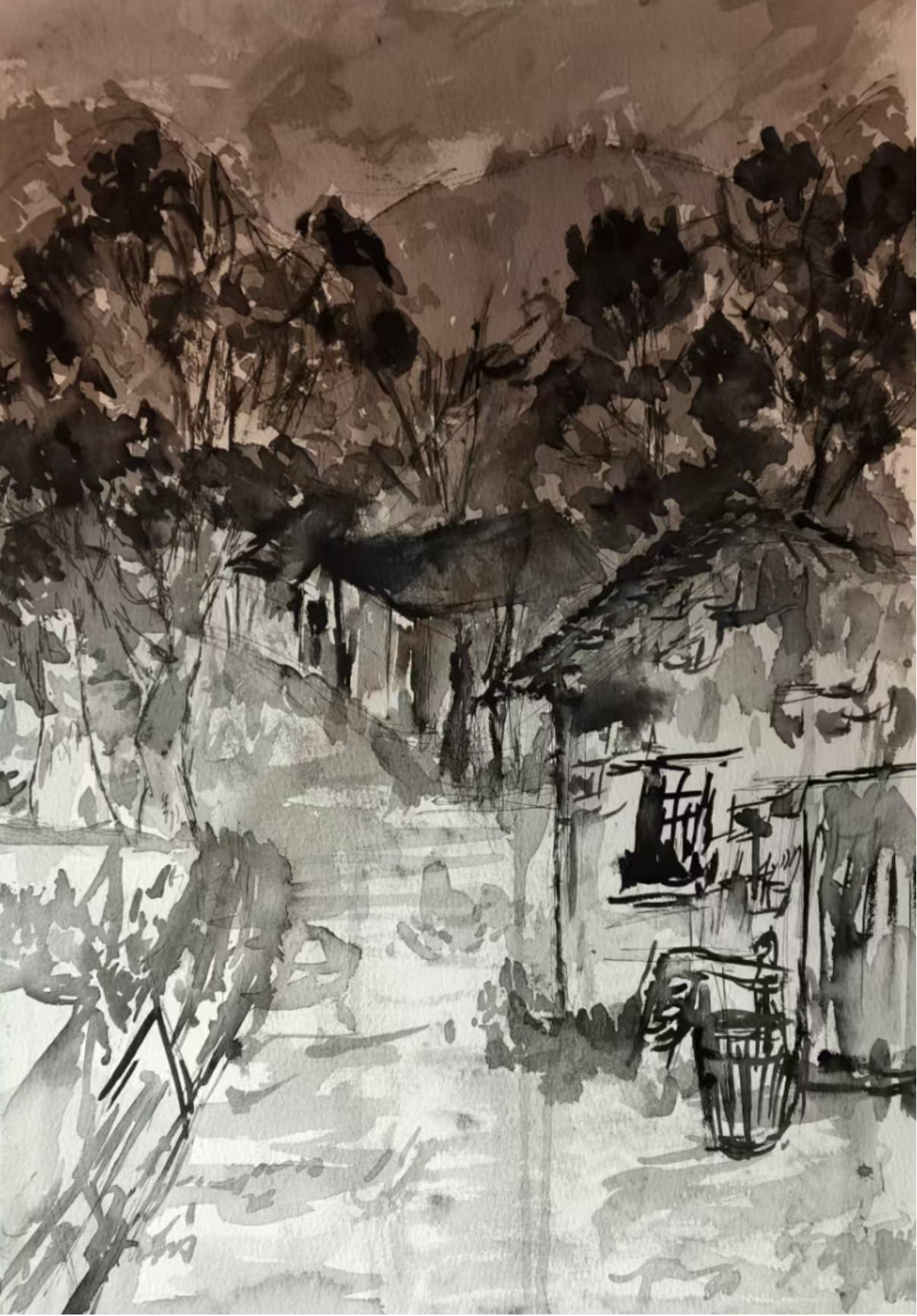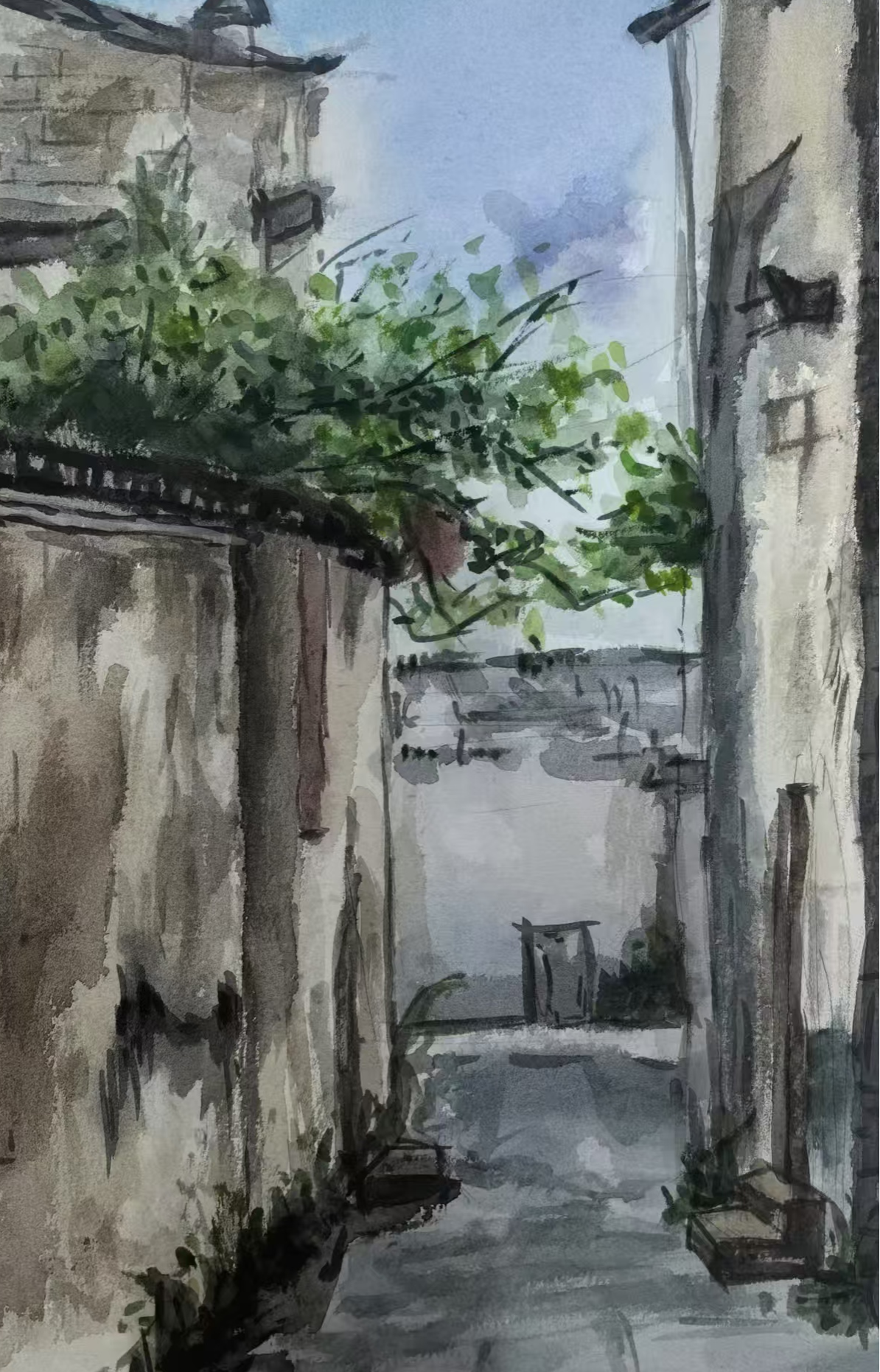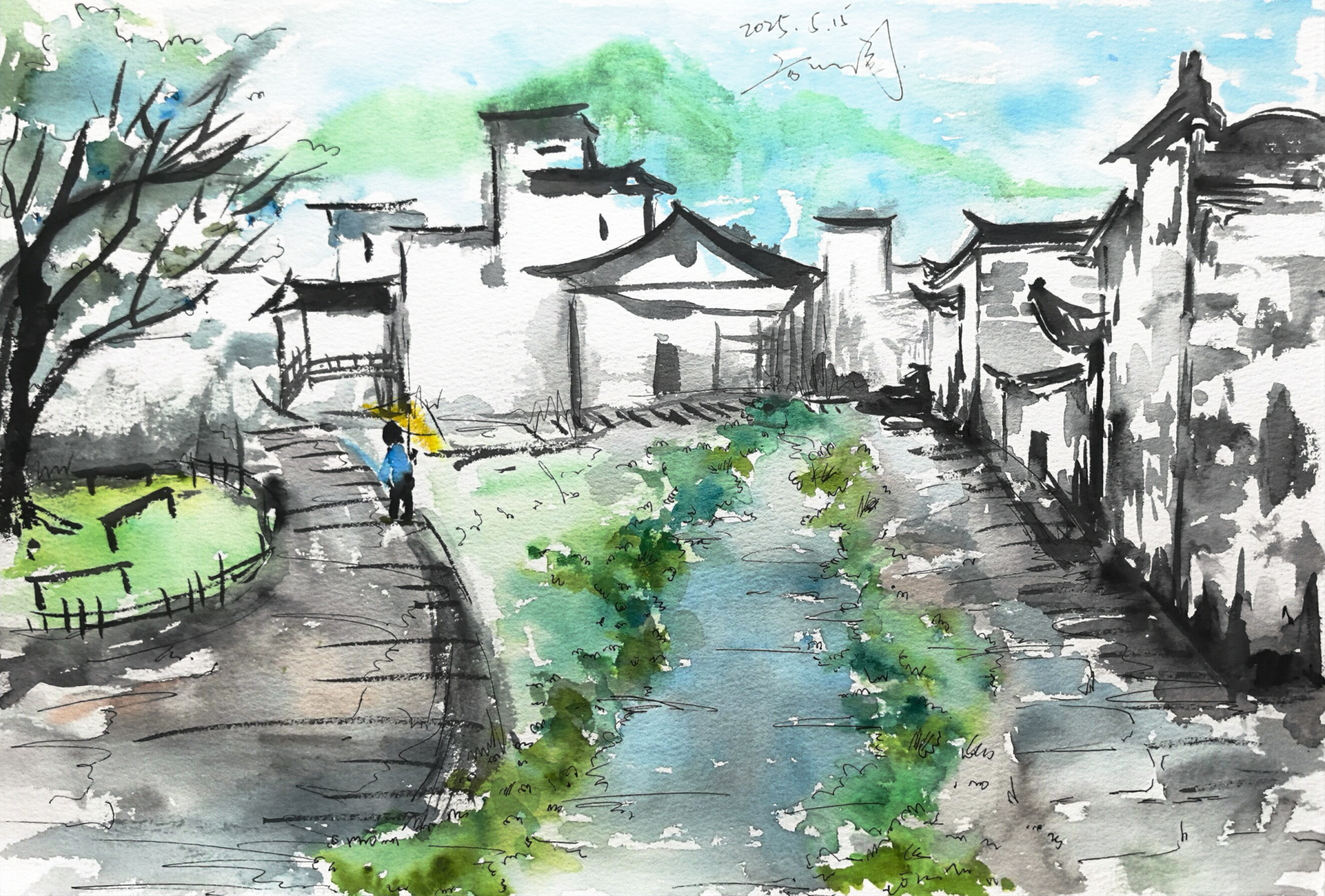 《风景写生》课程秉承“以自然为师,以生活为源”的教学理念,聚焦安徽屏山、宏村等徽州文化核心场域,开展了为期两周的驻地写生实践。通过田野调查、户外写生与在地文化研究的多维联动,员工在自然景观与人文肌理的碰撞中,完成了从技法锤炼到观念深化的蜕变。本次《风景写生》课程的实习员工系环境设计专业,同学们走进徽州,从专业视角出发,参观和考察了多个徽州古村落。宏村的月沼水系与南屏的祠堂群落,为教学提供了天然的“露天课堂”,马头墙的层叠韵律、青石板的岁月包浆、门楣砖雕的儒家隐喻,构成了视觉语言的“文化密码库”,了解水口的设置与营造,徽州居民利用山脉转折、流水环绕,在水流出入口处广植树木、修桥筑堤、造亭建坊等,体会智慧的先民们中国式的村落规划,兼顾了生活美学、水资源利用和防御外敌的超强功能,让员工们了解更多环境专业知识。课程首日安排建筑观摩与影像记录,引导员工以人类学视角观察村落空间布局,理解“天人合一”的营建智慧,感受堪舆学中“山环水绕、藏风聚气”的设计风格。员工将榫卯结构、砖雕纹样、石雕造型转化为速写本中的线性实验,为后续创作注入在地性基因。本次色彩写生主要以水彩为媒介,进行水彩的风景技法训练。前三天主要进行田野调查和感官体验,训练选景、构图和快速捕捉的能力,闭眼聆听溪流穿巷的节奏,触摸夯土墙的颗粒质感,速写时强化动态线条表现风的轨迹,每日水彩画注重光影和色块的构思,员工需在2小时内完成8开尺幅的场景速写或水彩,强制脱离细节描摹,专注整体气韵捕捉。教学难点是,户外环境条件受限,员工走出课堂在室外环境中很难选景,且受光源和天气影响,村落密集的巷道与错落的屋檐,为透视比较带来不晓得难度,员工多采用“游观式”观察法,学会用脚步丈量空间,并将徽州烟雨天的灰调色谱归纳总结,鉴徽墨“焦、浓、重、淡、清”五色体系,通过水量控制表现黛瓦粉墙的氤氲质感。