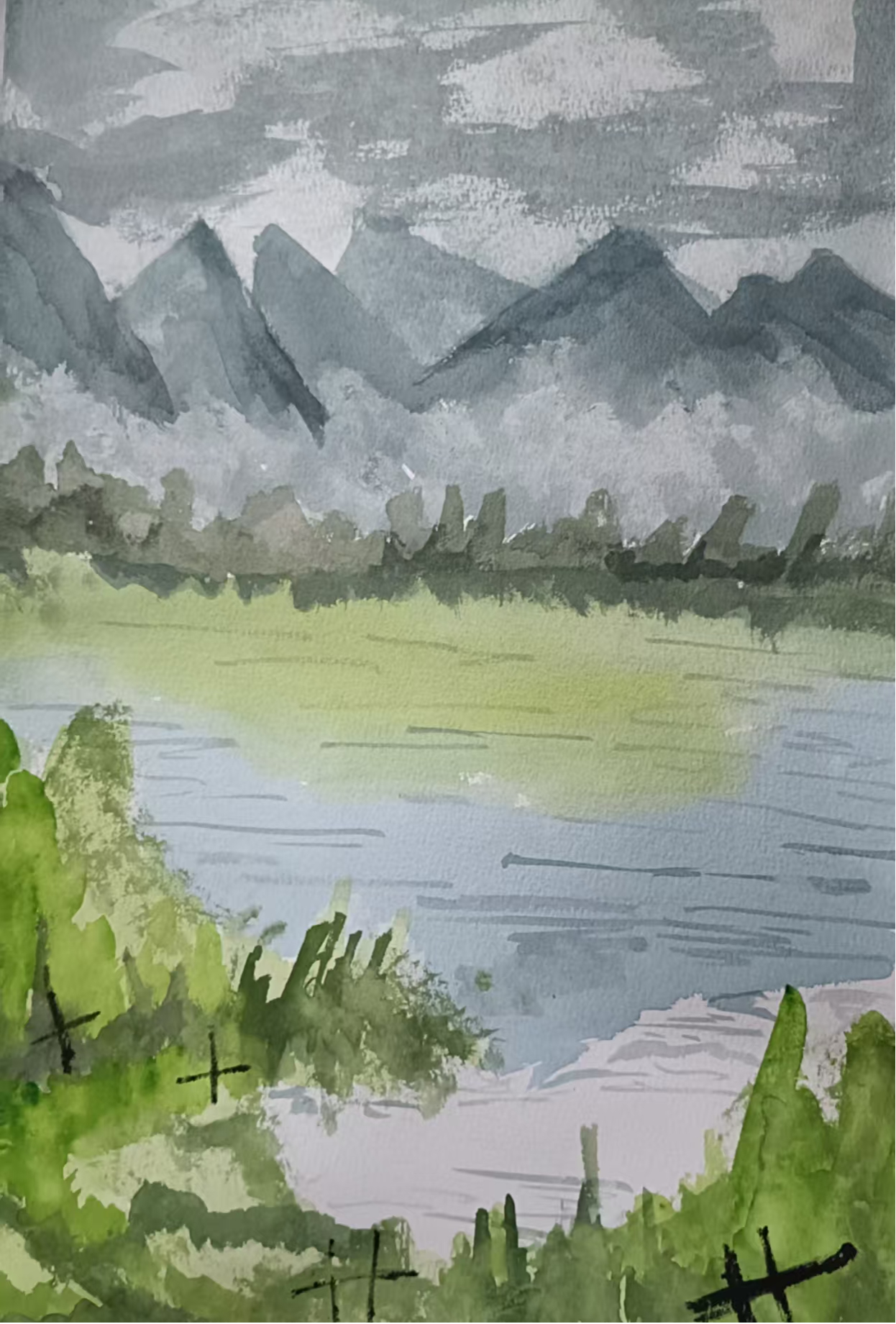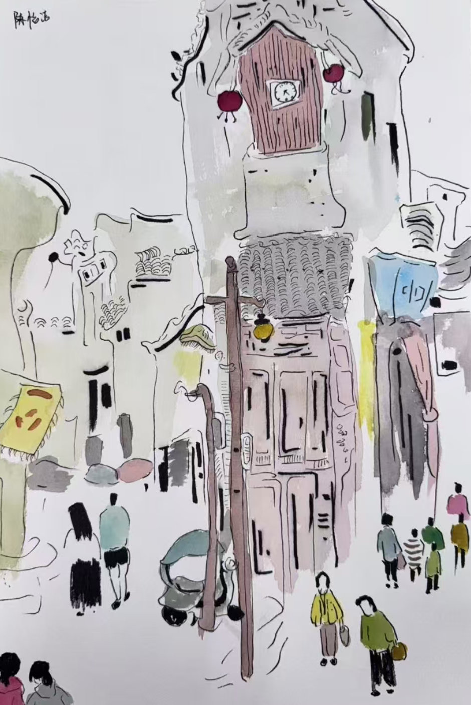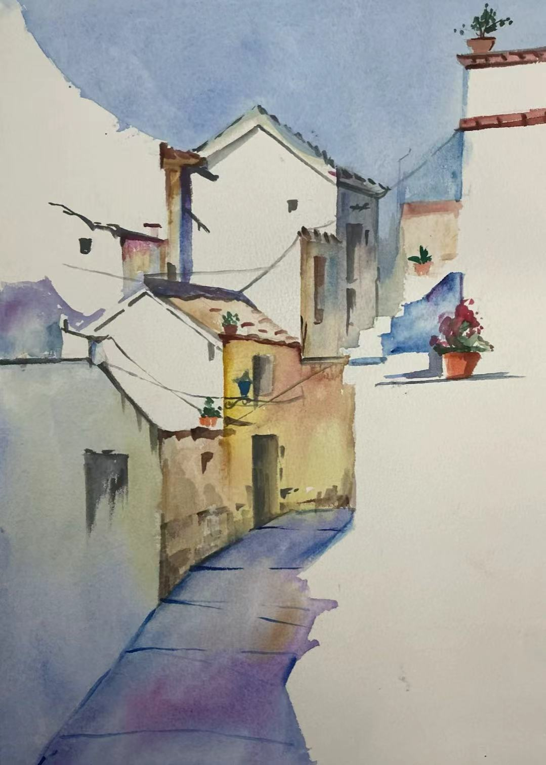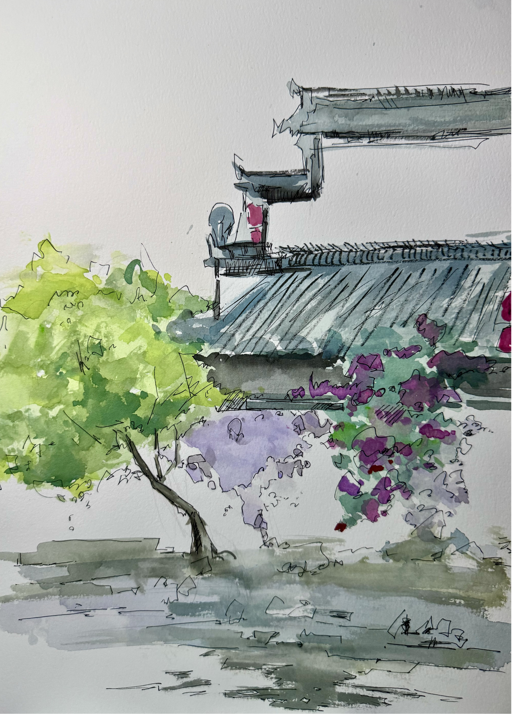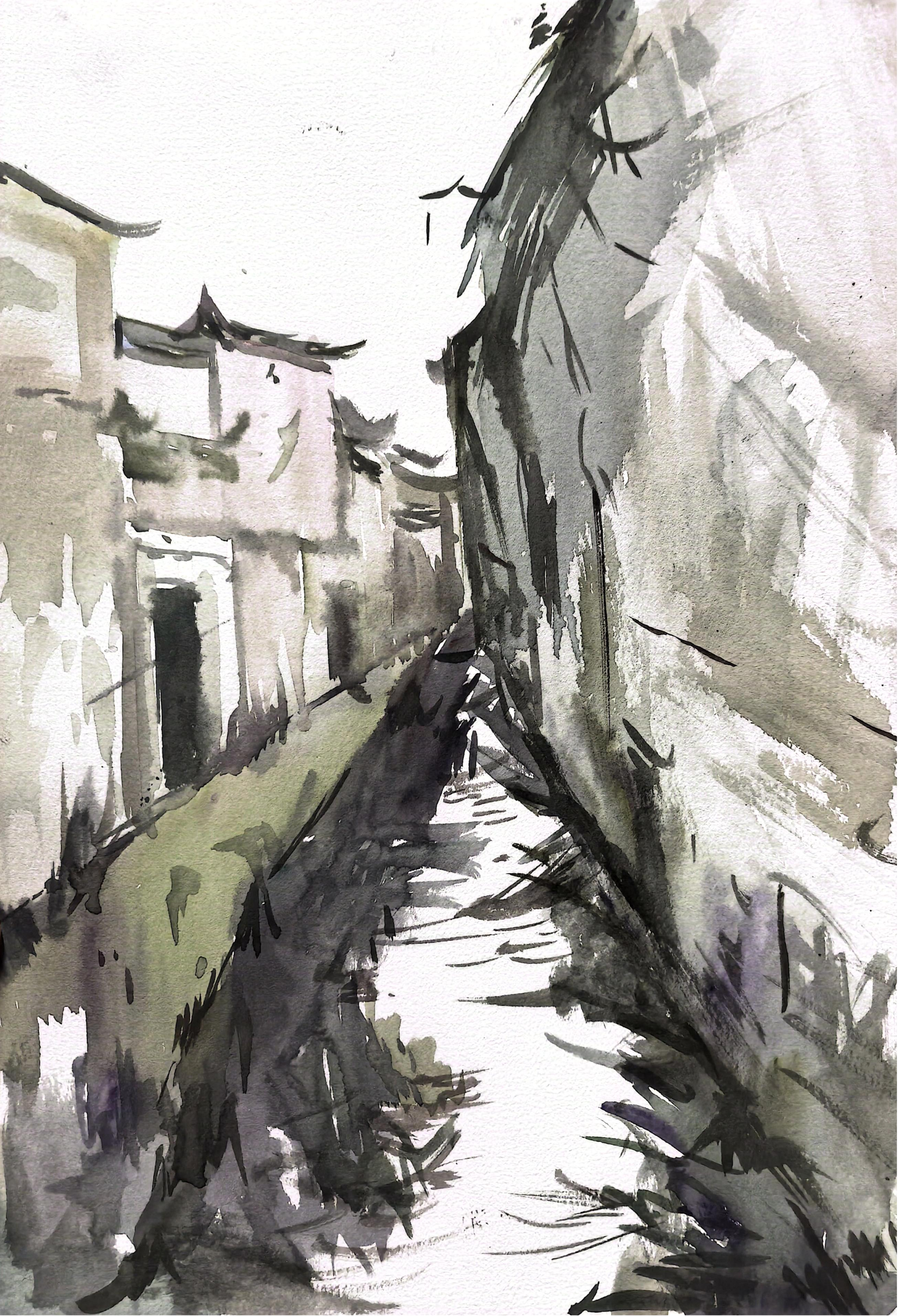 《风景写生》课程秉承“以自然为师,以生活为源”的教学理念,聚焦安徽屏山、宏村等徽州文化核心场域,开展了为期两周的驻地写生实践。通过田野调查、户外写生与在地文化研究的多维联动,员工在自然景观与人文肌理的碰撞中,完成了从技法锤炼到观念深化的蜕变。本次《风景写生》课程的实习员工系环境设计专业,同学们走进徽州,从专业视角出发,参观和考察了多个徽州古村落。宏村的月沼水系与南屏的祠堂群落,为教学提供了天然的“露天课堂”,马头墙的层叠韵律、青石板的岁月包浆、门楣砖雕的儒家隐喻,构成了视觉语言的“文化密码库”,了解水口的设置与营造,徽州居民利用山脉转折、流水环绕,在水流出入口处广植树木、修桥筑堤、造亭建坊等,体会智慧的先民们中国式的村落规划,兼顾了生活美学、水资源利用和防御外敌的超强功能,让员工们了解更多环境专业知识。课程首日安排建筑观摩与影像记录,引导员工以人类学视角观察村落空间布局,理解“天人合一”的营建智慧,感受堪舆学中“山环水绕、藏风聚气”的设计风格。员工将榫卯结构、砖雕纹样、石雕造型转化为速写本中的线性实验,为后续创作注入在地性基因。本次色彩写生主要以水彩为媒介,进行水彩的风景技法训练。前三天主要进行田野调查和感官体验,训练选景、构图和快速捕捉的能力,闭眼聆听溪流穿巷的节奏,触摸夯土墙的颗粒质感,速写时强化动态线条表现风的轨迹,每日水彩画注重光影和色块的构思,员工需在2小时内完成8开尺幅的场景速写或水彩,强制脱离细节描摹,专注整体气韵捕捉。教学难点是,户外环境条件受限,员工走出课堂在室外环境中很难选景,且受光源和天气影响,村落密集的巷道与错落的屋檐,为透视比较带来不晓得难度,员工多采用“游观式”观察法,学会用脚步丈量空间,并将徽州烟雨天的灰调色谱归纳总结,鉴徽墨“焦、浓、重、淡、清”五色体系,通过水量控制表现黛瓦粉墙的氤氲质感。