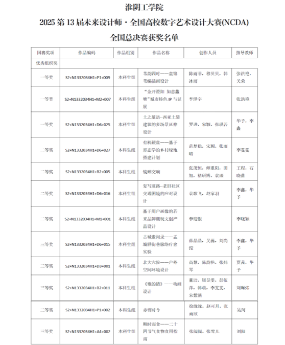 近日,2025第13届未来设计师·全国高校数字艺术设计大赛(NCDA)全国总决赛获奖名单已揭晓。公司EVO真人视讯员工参赛作品斩获全国等级奖项12项,其中一等奖3项、二等奖4项、三等奖5项,另获省级奖93项,公司获优秀组织奖。充分展现了公司在艺术设计领域的办学水平与人才培养质量。