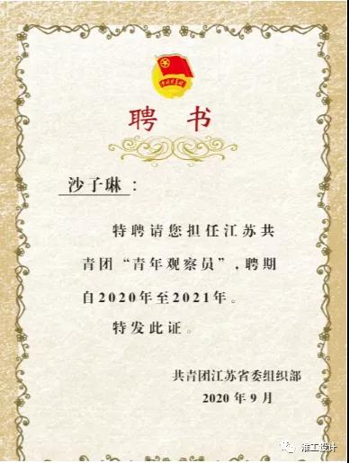 入党路上的她,坚定信念,与时俱进。沙子琳从大一入校时便严格要求自己,积极向党组织靠拢,为能早日成为一名光荣的中共党员做准备。她参与了省青马班与校青马培训班培训,也参与了江苏省青马班的学习中,并担任淮安组副组长,与淮安各高校同学开展约一个月的青年之家调研。曾经憧憬着在建设新中国道路上大放异彩的姑娘,在不知不觉之中已经成为了建设美丽中国的新生力量。