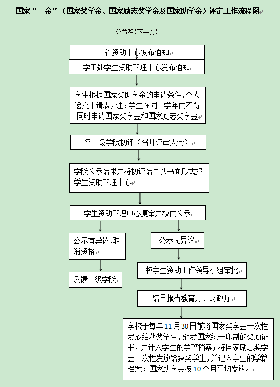 员工工作——国家“三金”(国家奖学金、国家励志奖学金及国家助学金)评定工作流程图